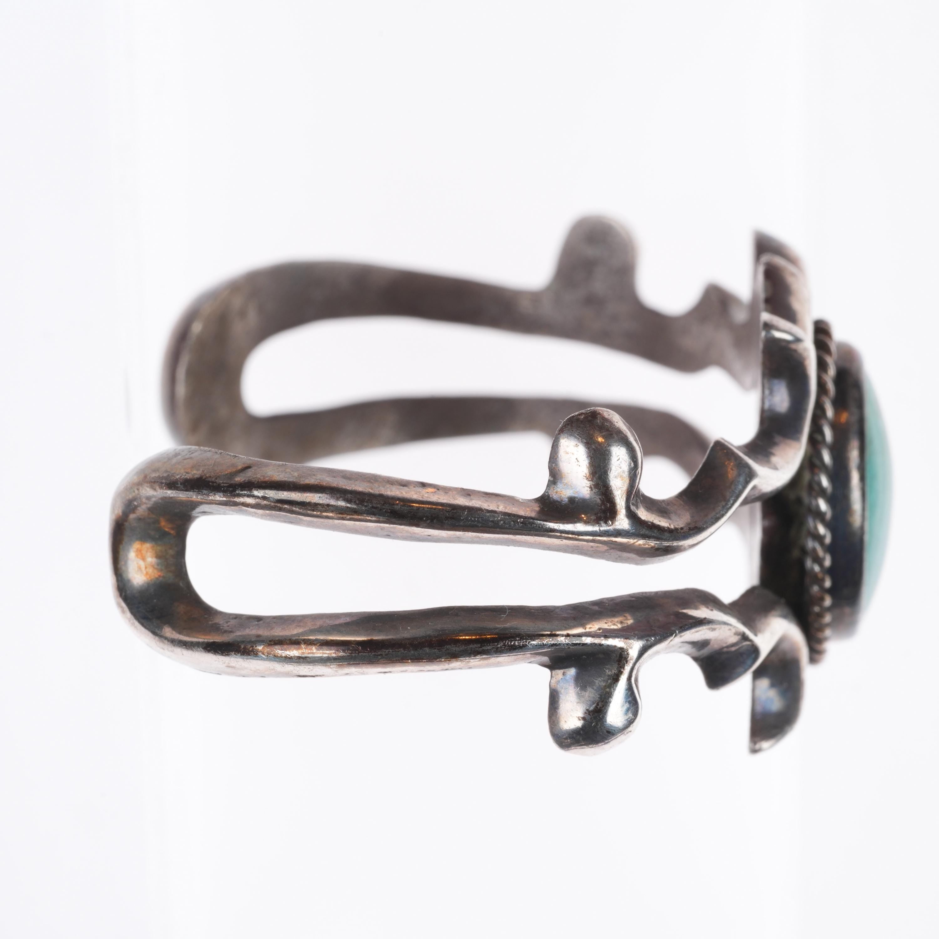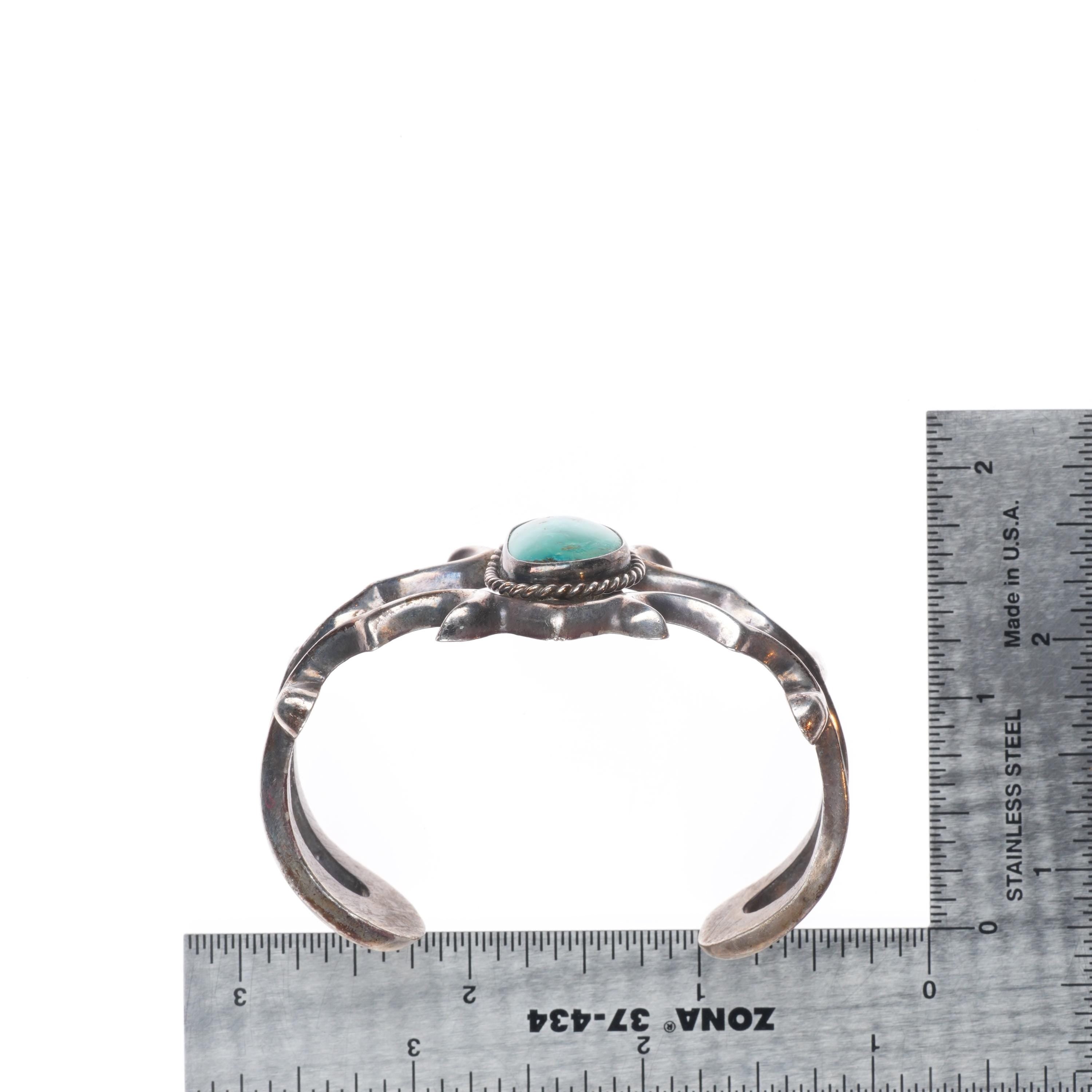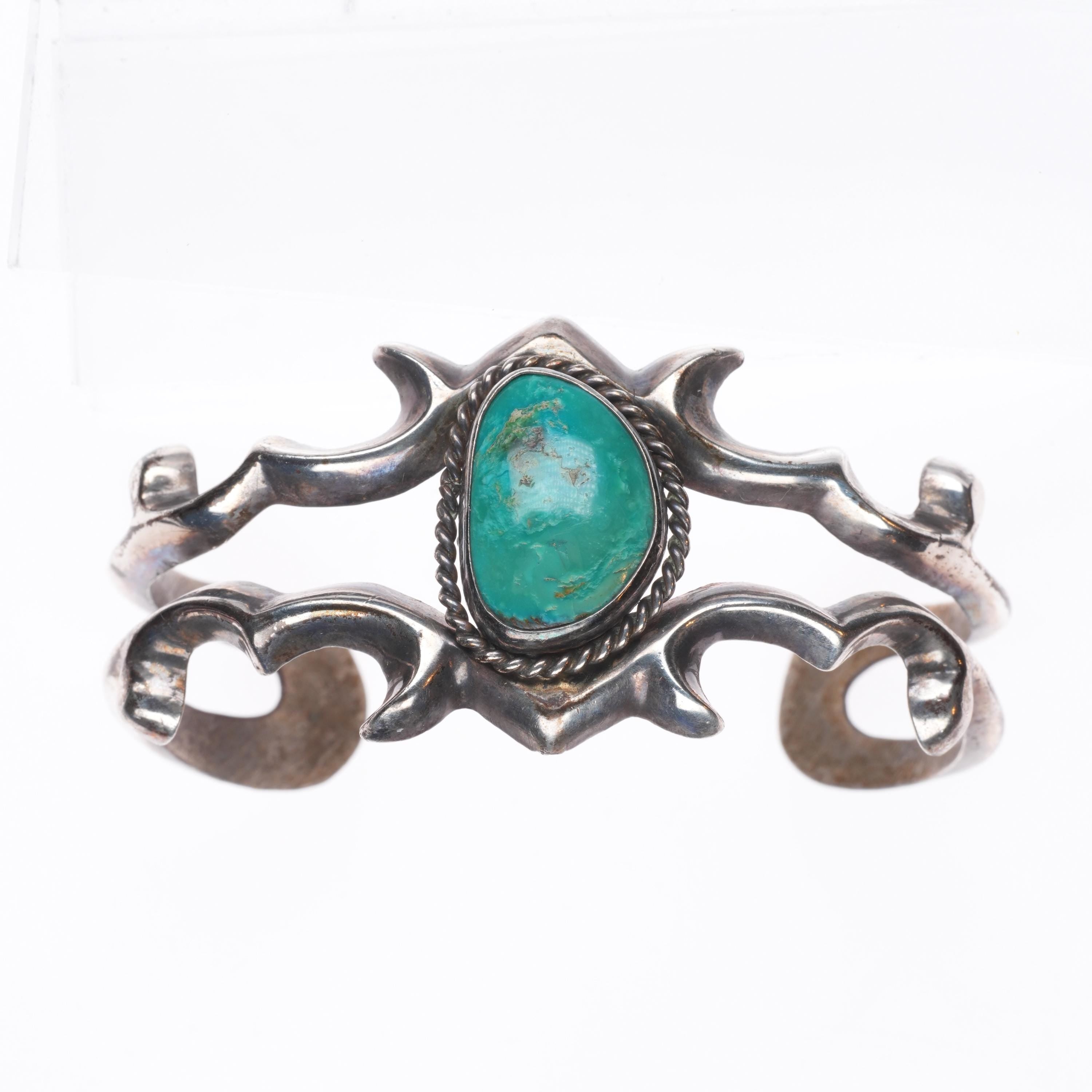 6" Navajo sterling silver green turquoise tufa/Sand cast cuff bracelet. Tested and guaranteed solid sterling silver with weight and measurements in pictures. Circa third quarter of the 20th century. Fits up to a 6" wrist.