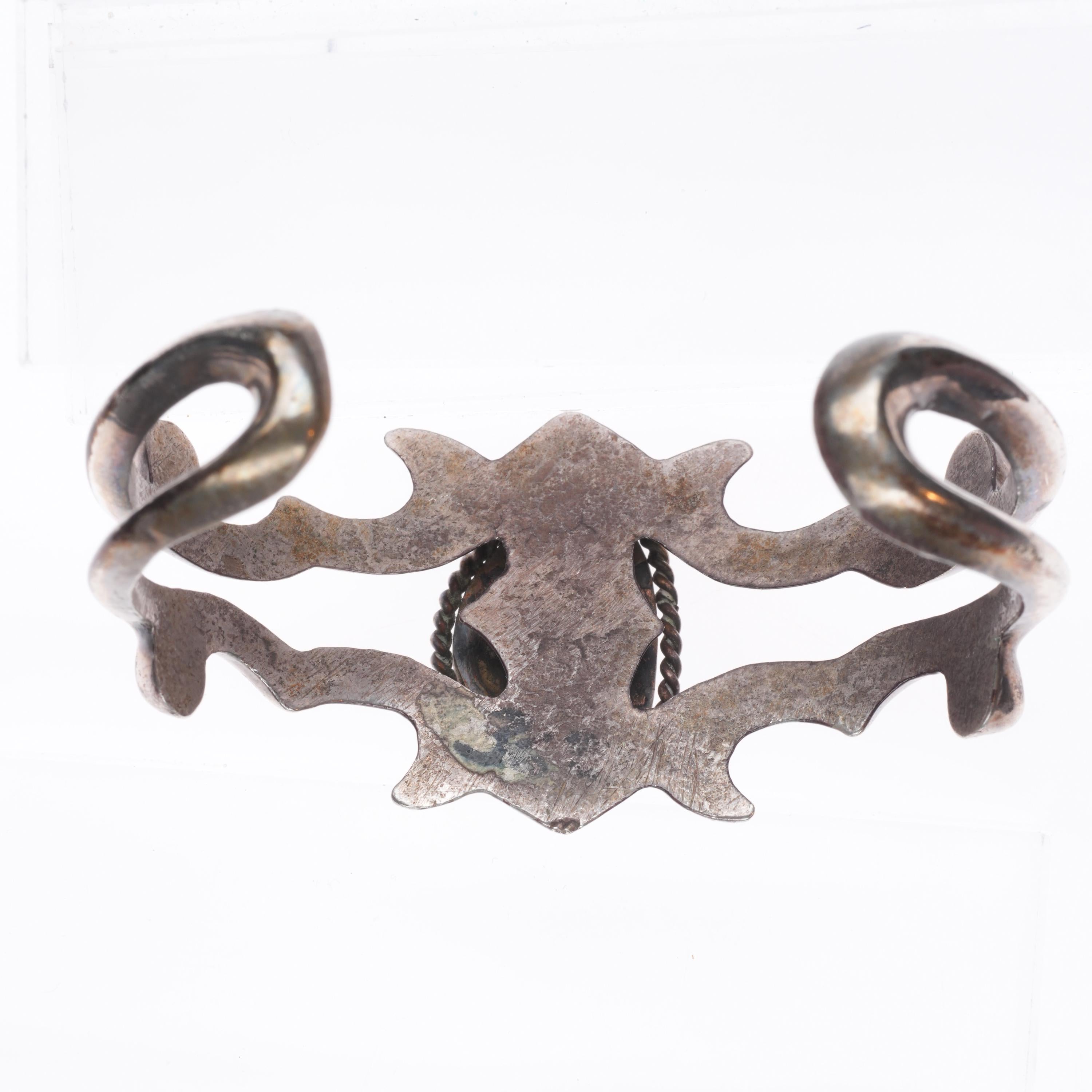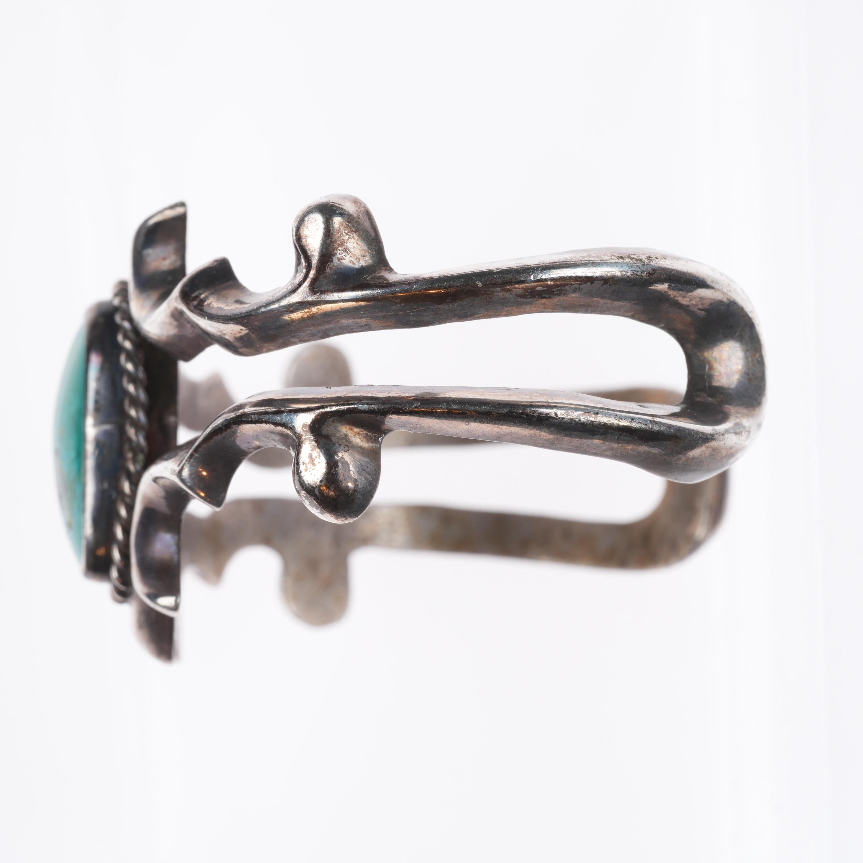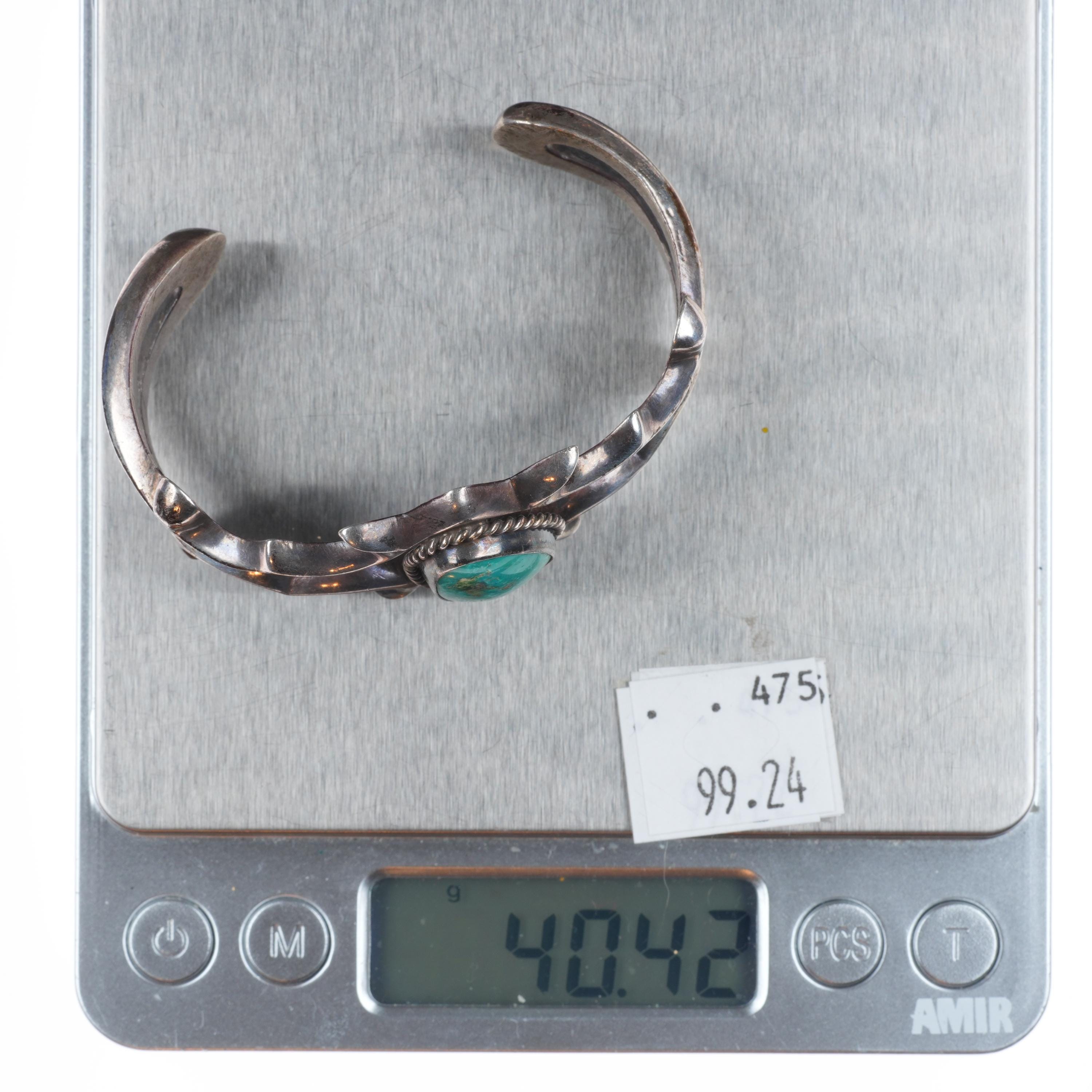 6" Navajo sterling silver green turquoise tufa/Sand cast cuff bracelet. Tested and guaranteed solid sterling silver with weight and measurements in pictures. Circa third quarter of the 20th century. Fits up to a 6" wrist.