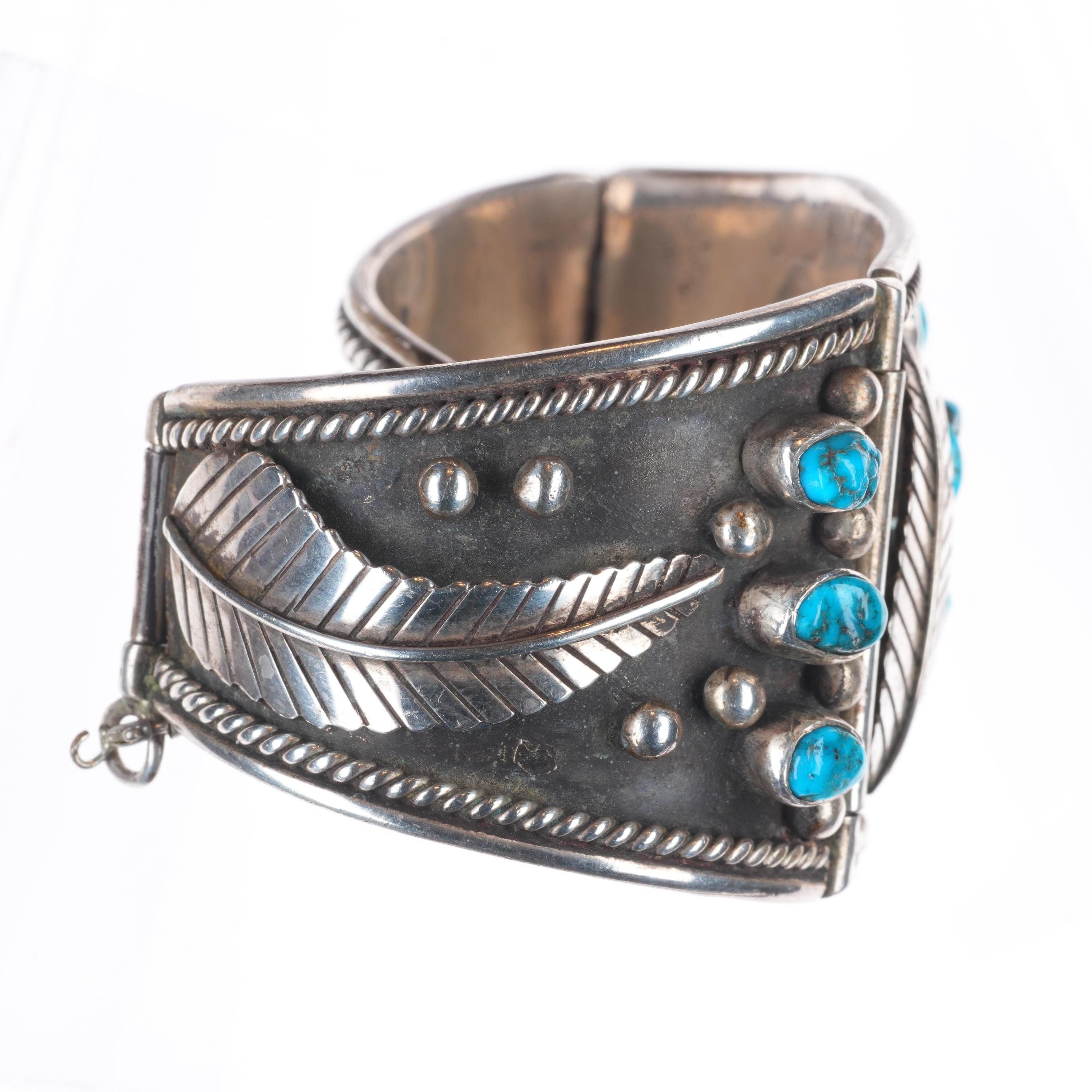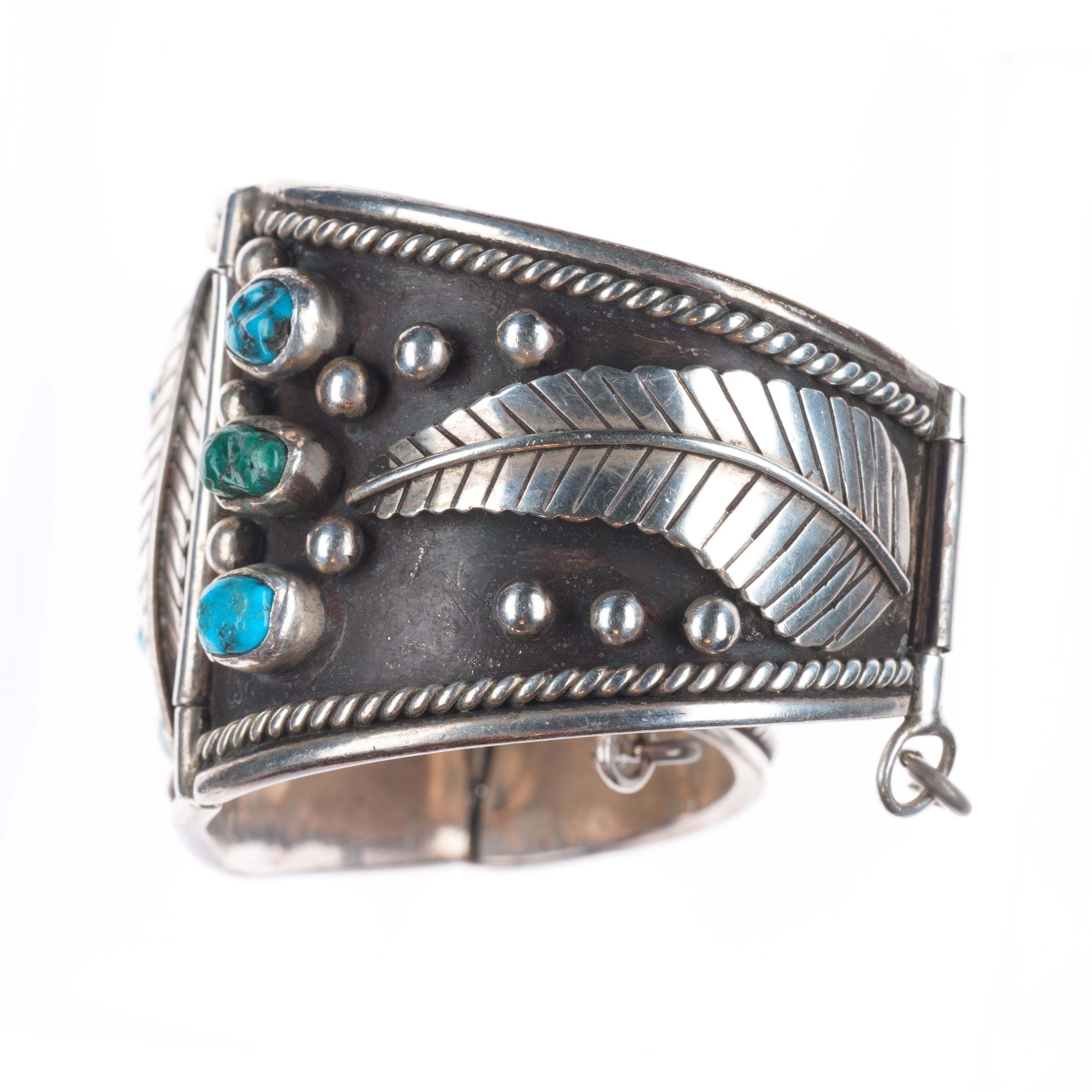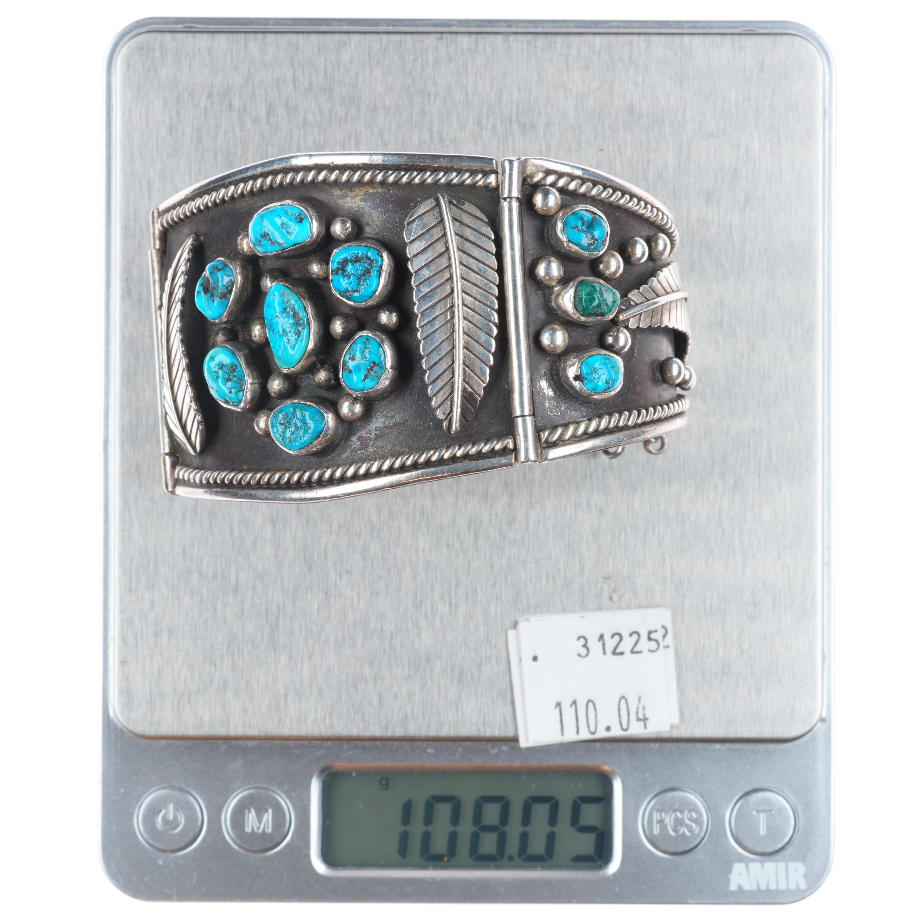 7" Heavy/wide Vintage Navajo sterling silver turquoise cluster link bracelet. Weight and measurements in pictures, solid sterling silver no issues.. Circa third quarter of the 20th century. No apparent issues, unmarked, safety chain missing, not necessary but could easily be replaced.