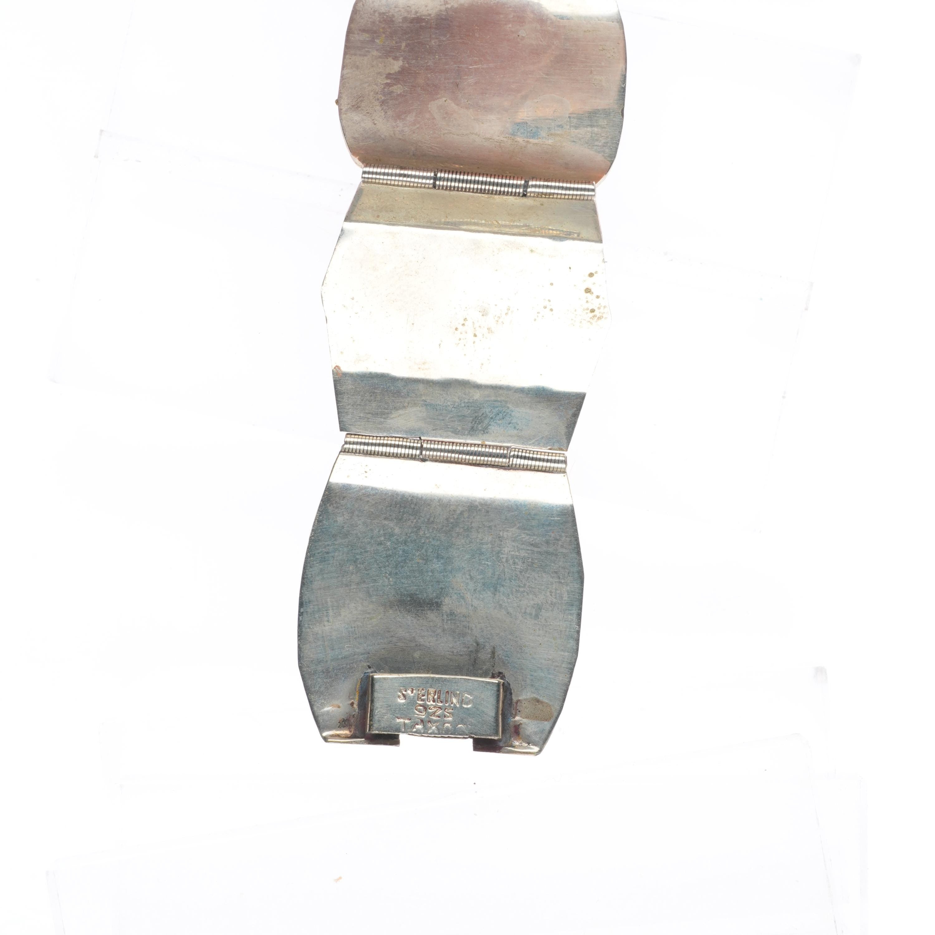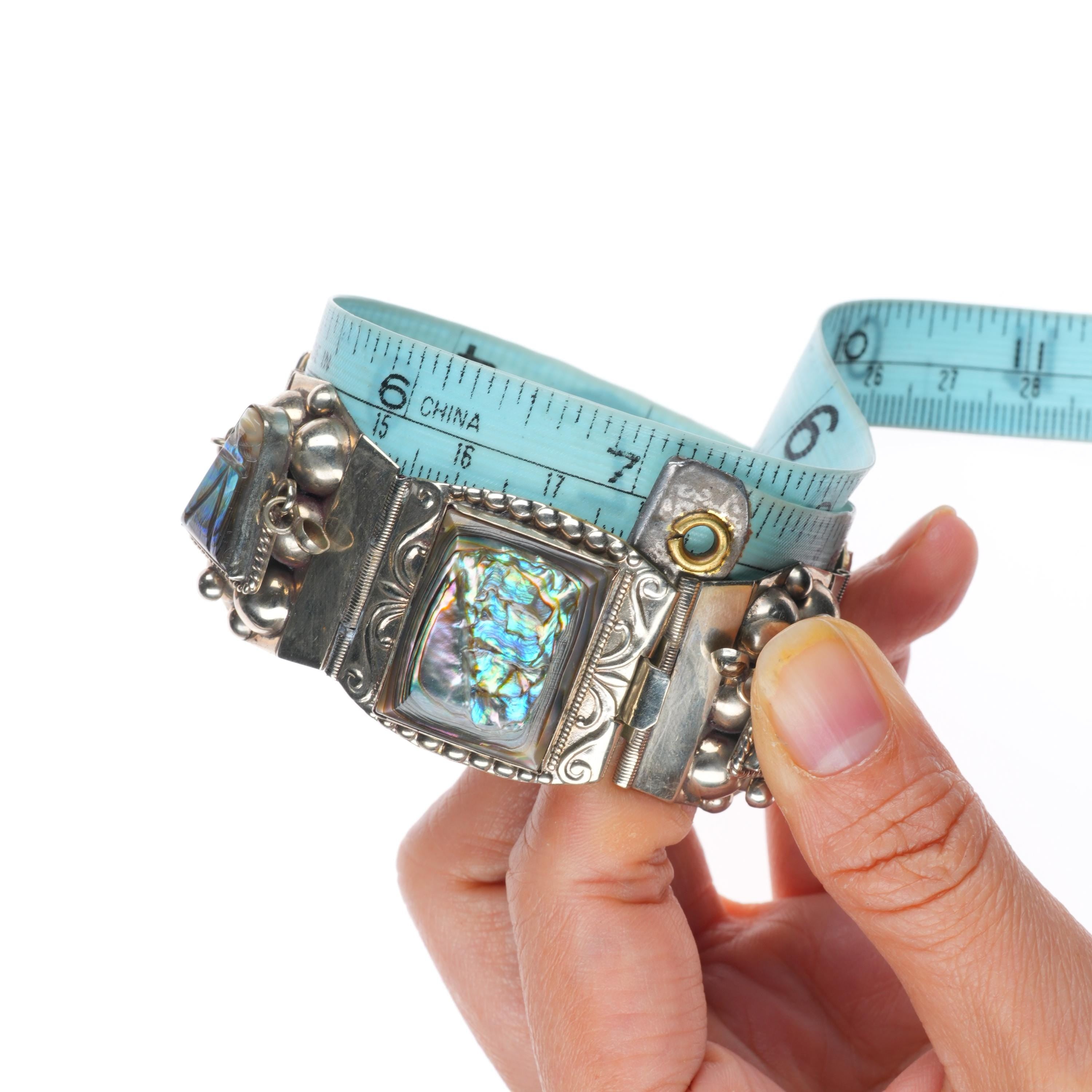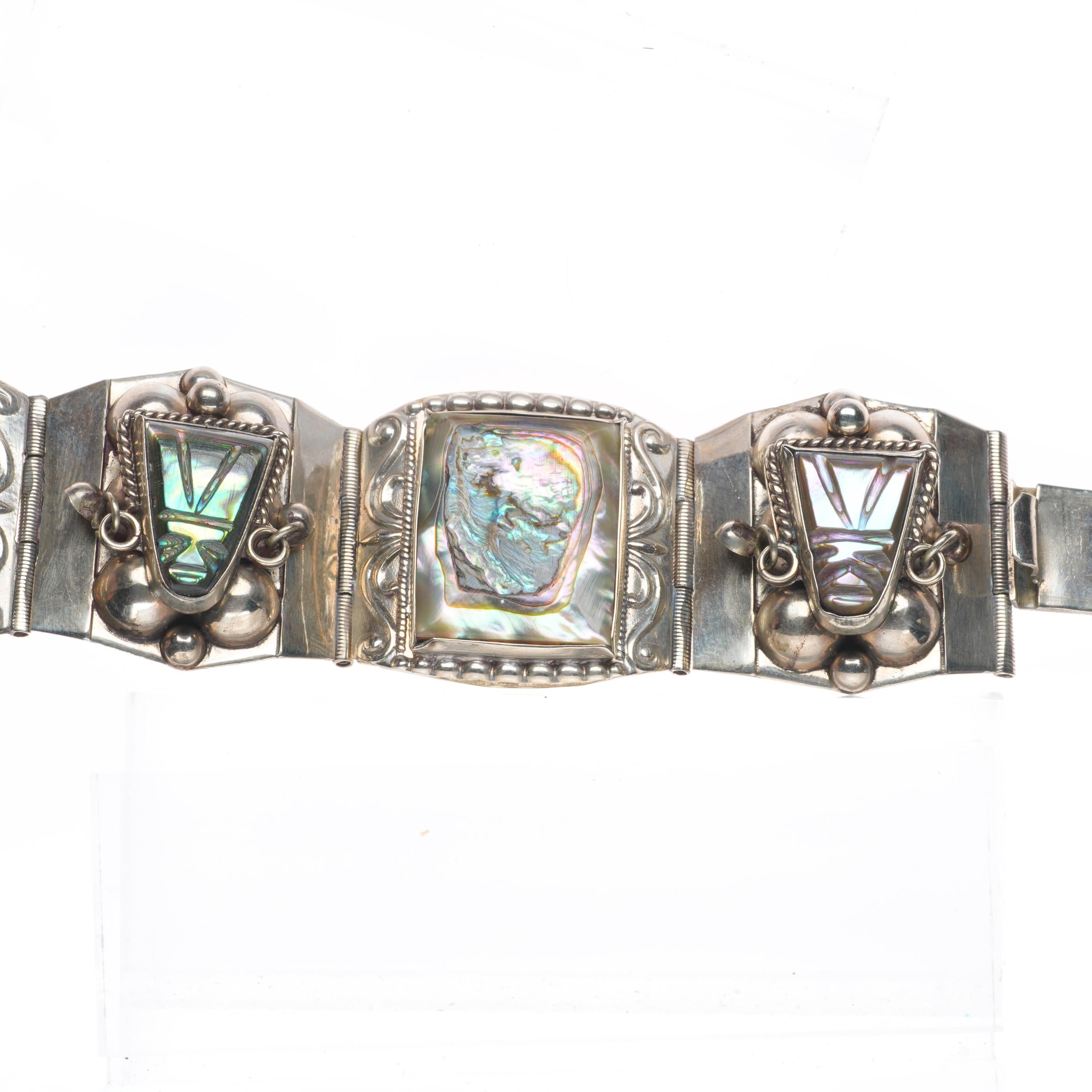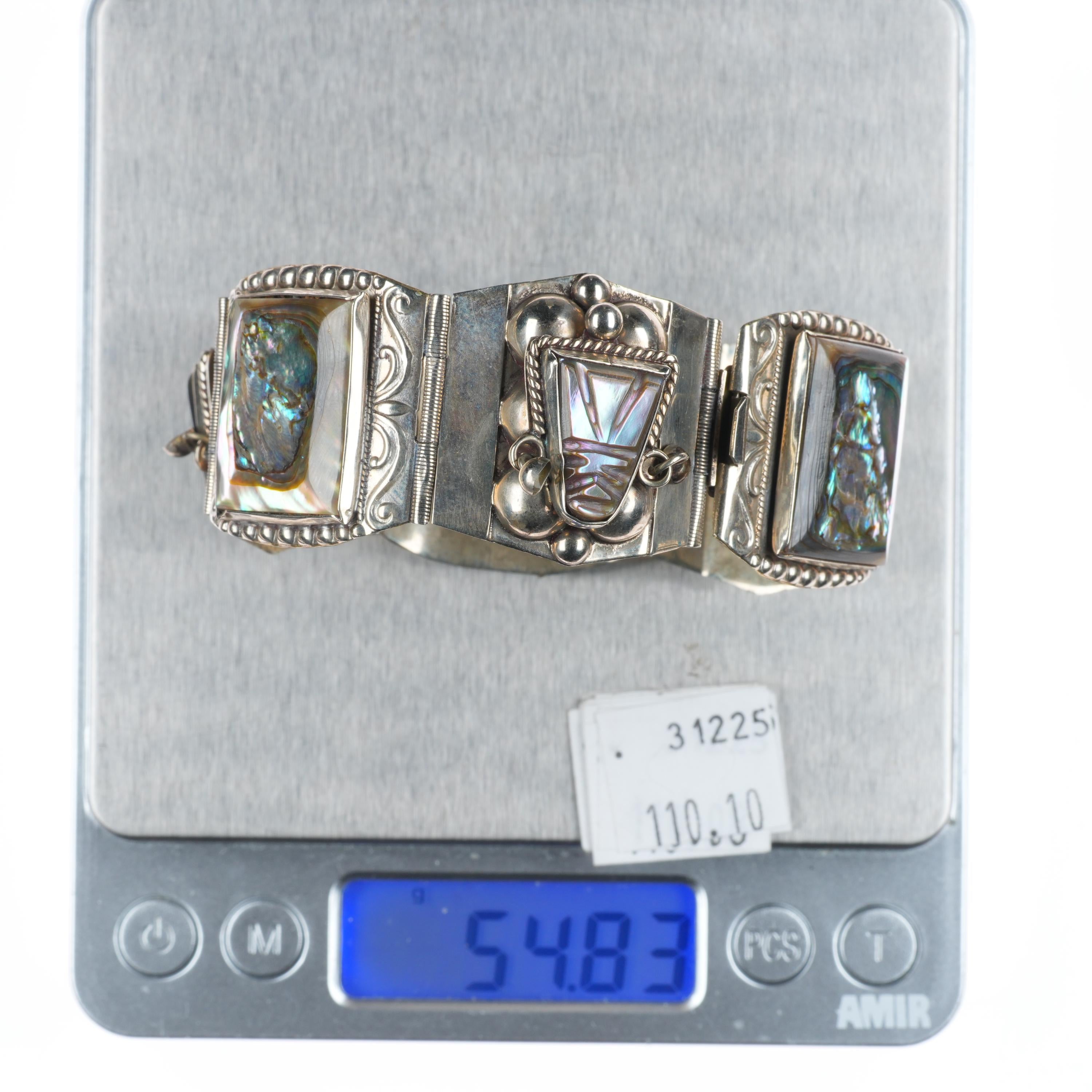 7" Vintage Mexican sterling silver carved Abalone Mother of pearl link bracelet. Weight and measurements in pictures, solid sterling silver. Marked as shown with no damage.