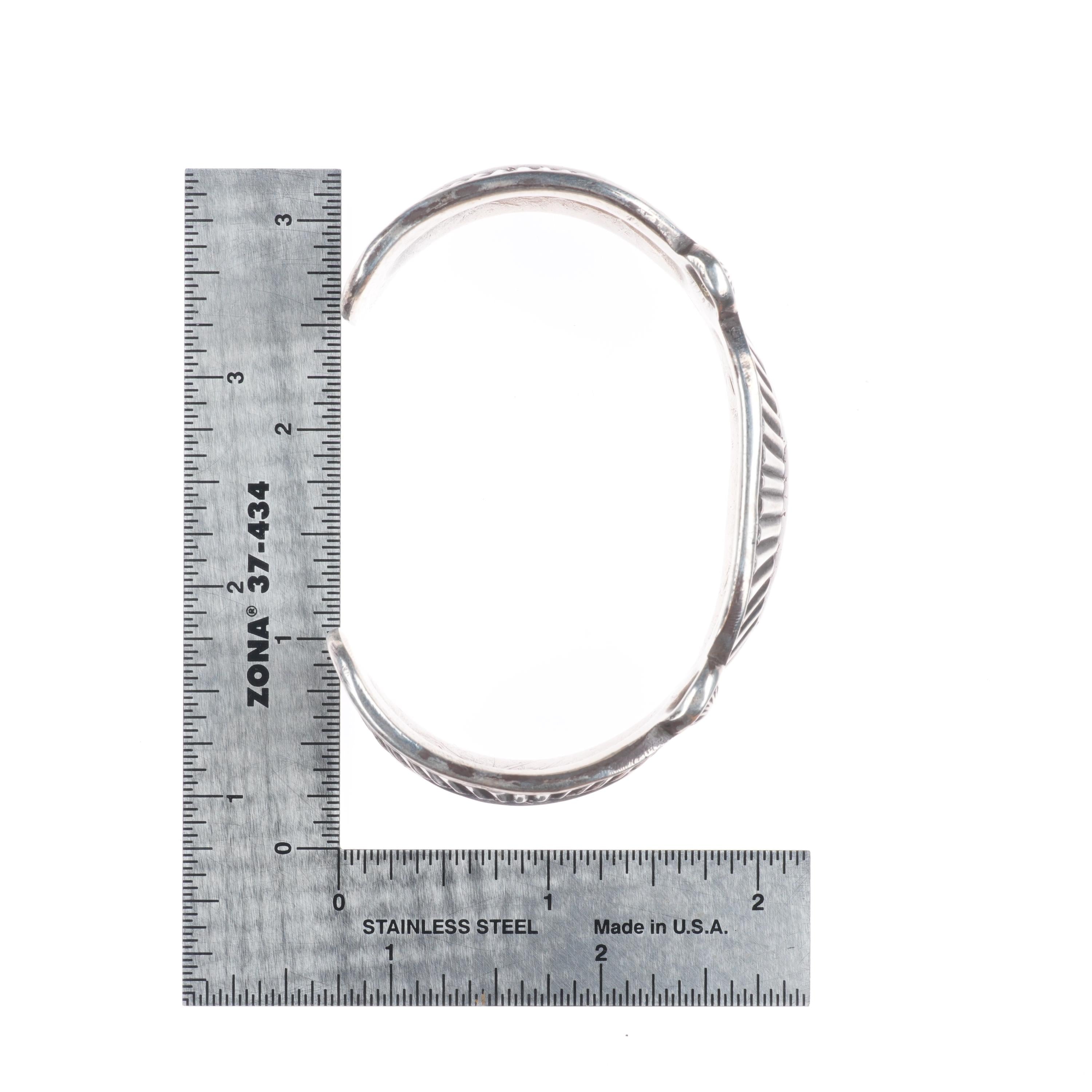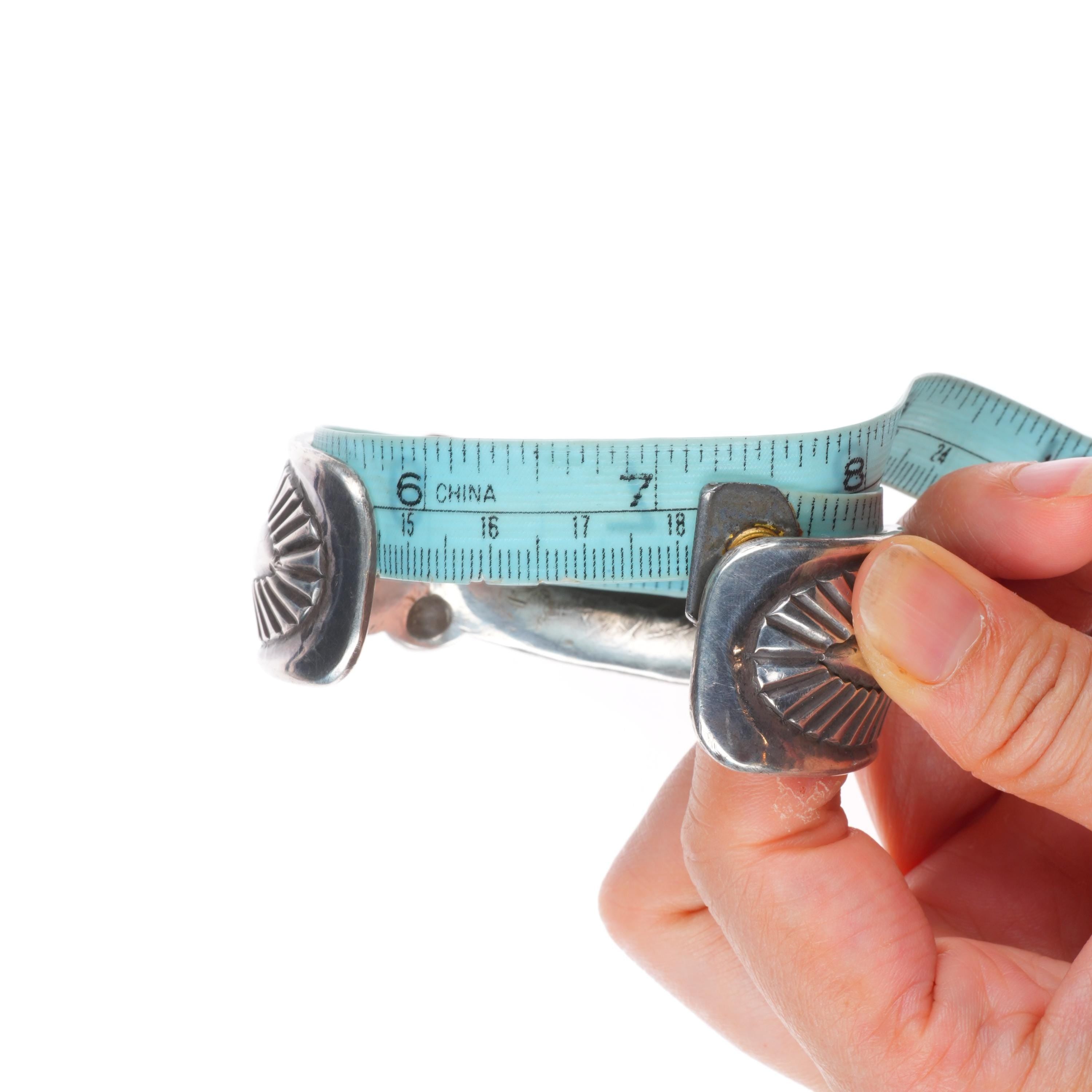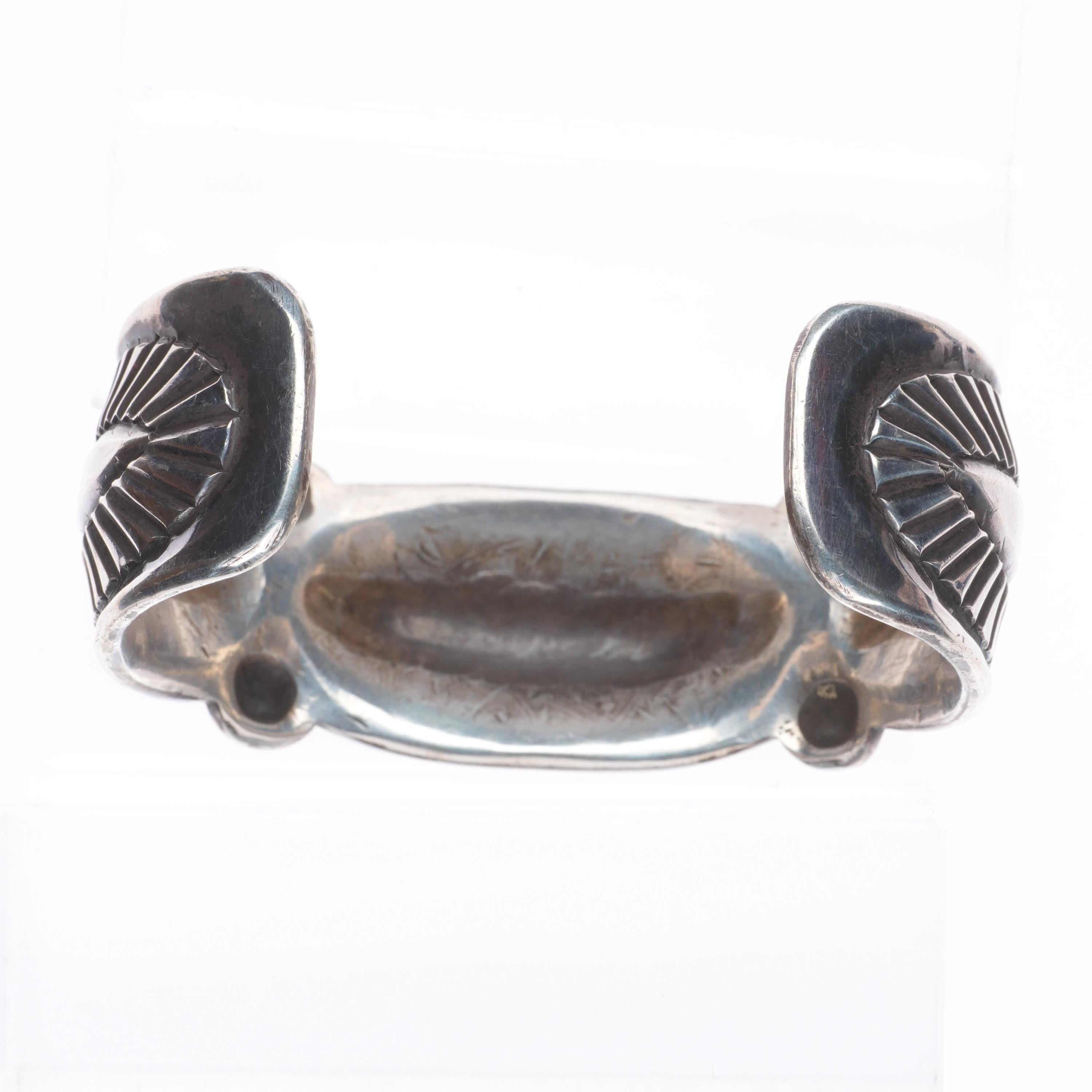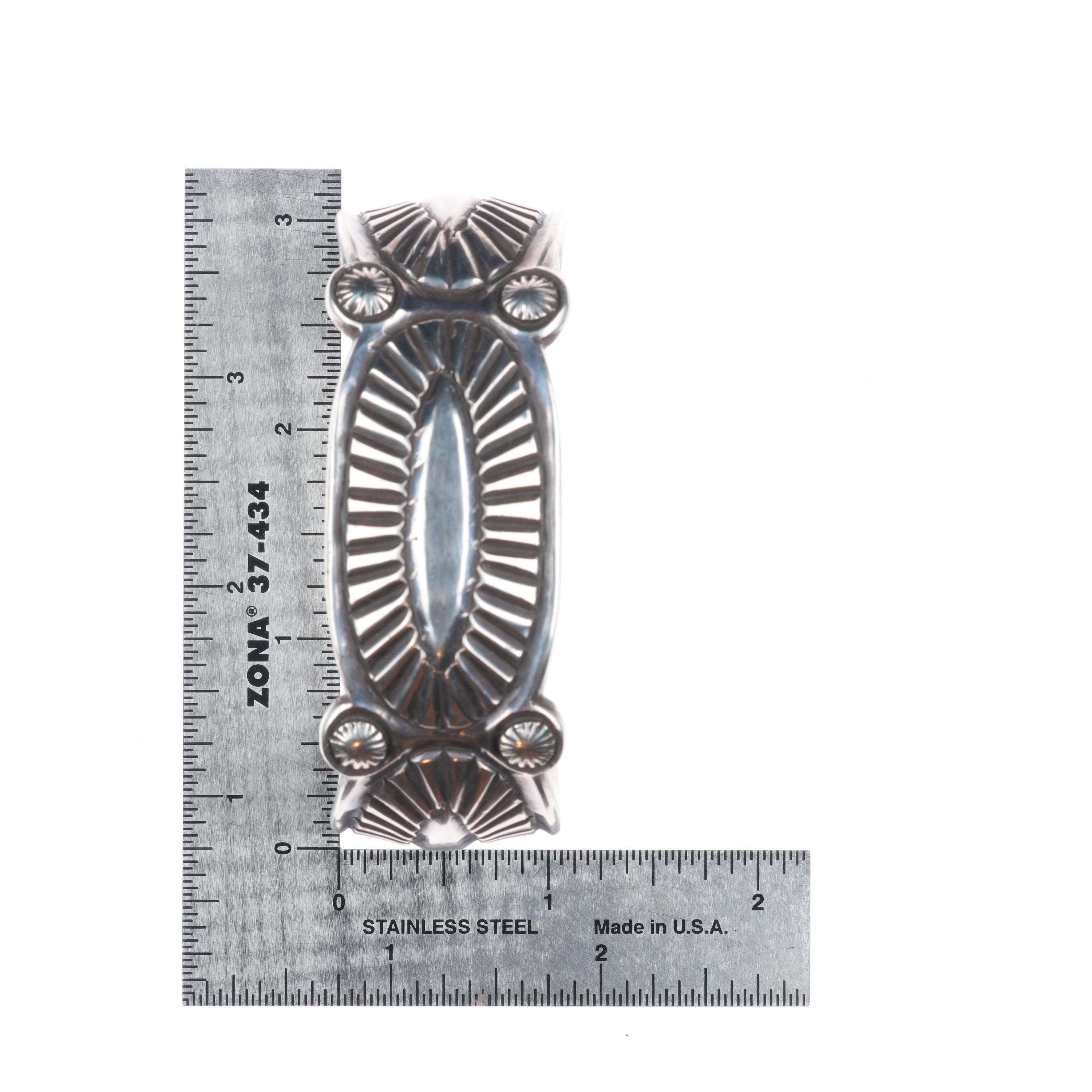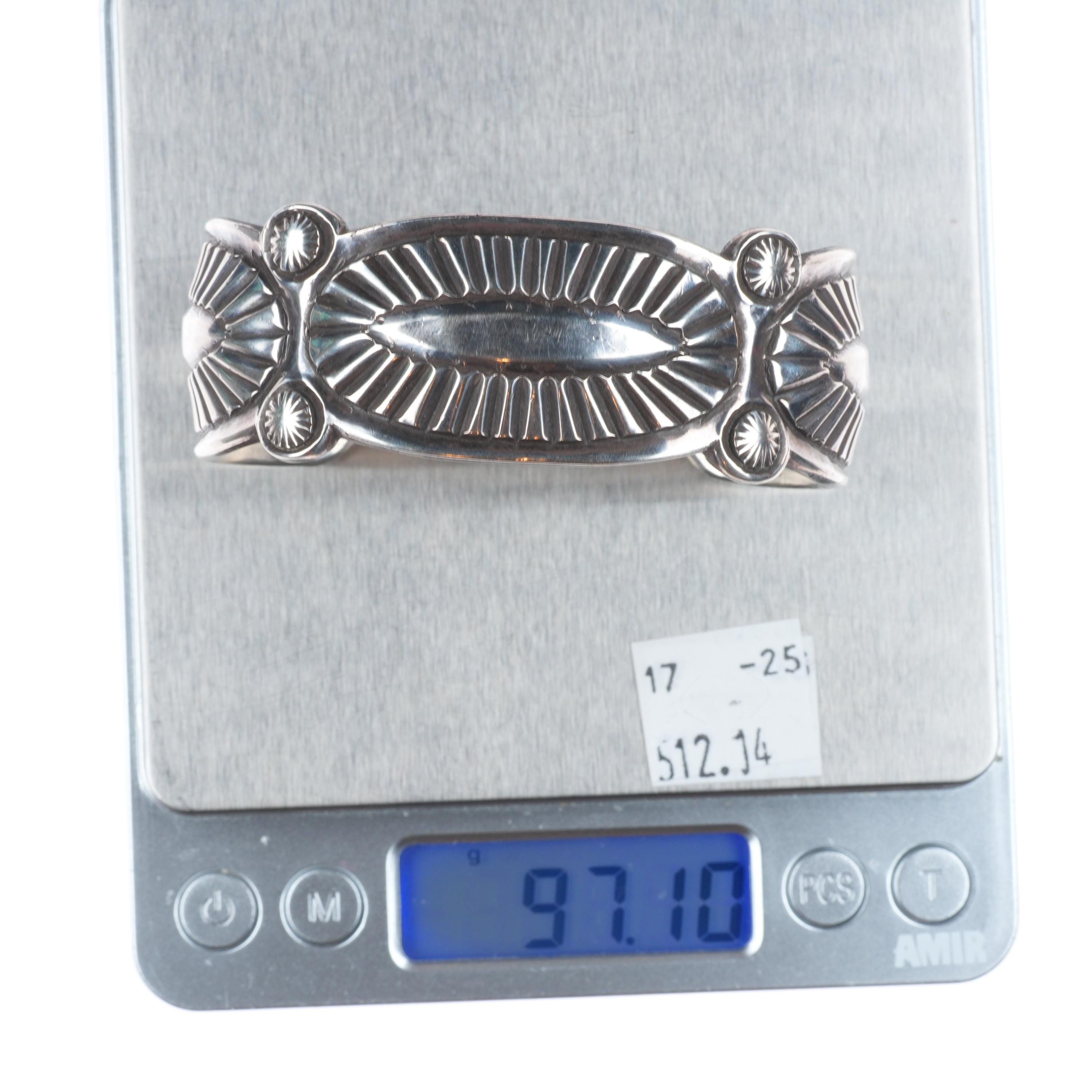 7" Vintage Navajo chiseled sterling silver repousse cuff bracelet Tested and guaranteed solid sterling silver with weight and measurements in pictures. Great condition with age appropriate wear, circa mid 20th century.