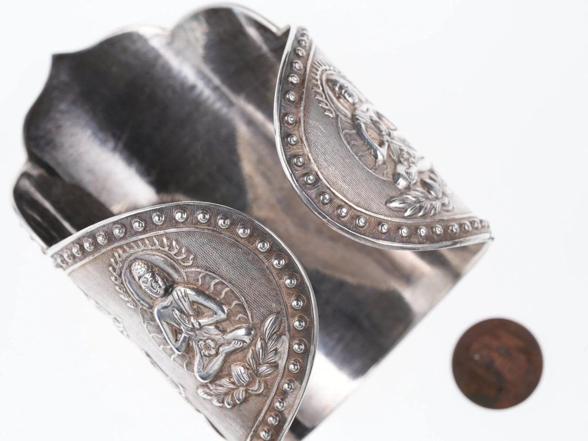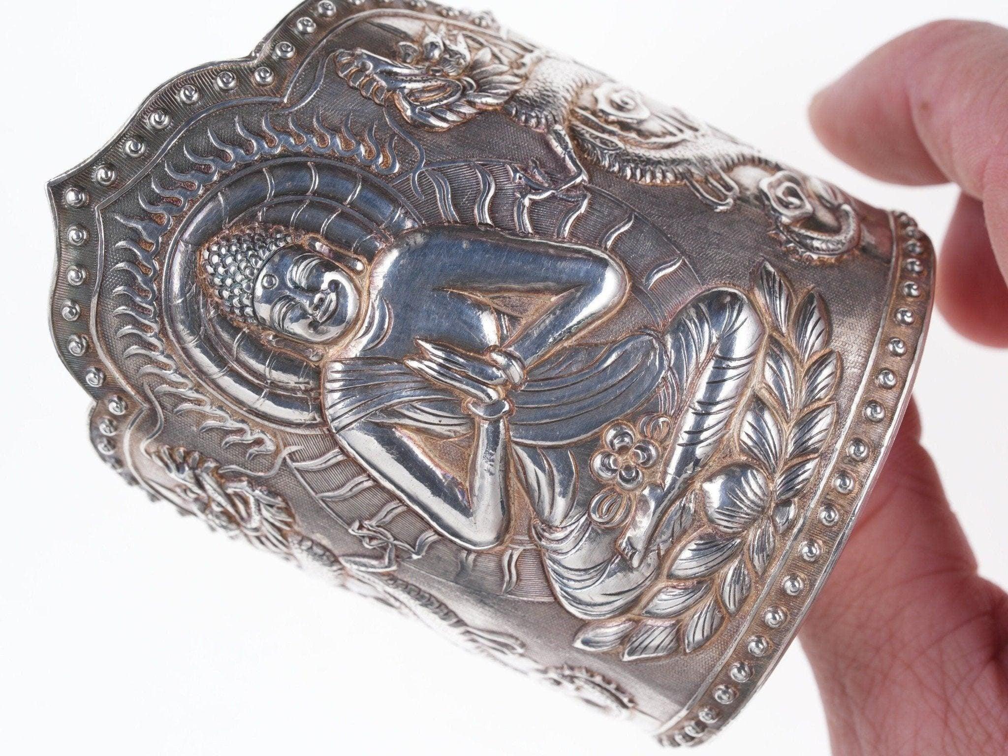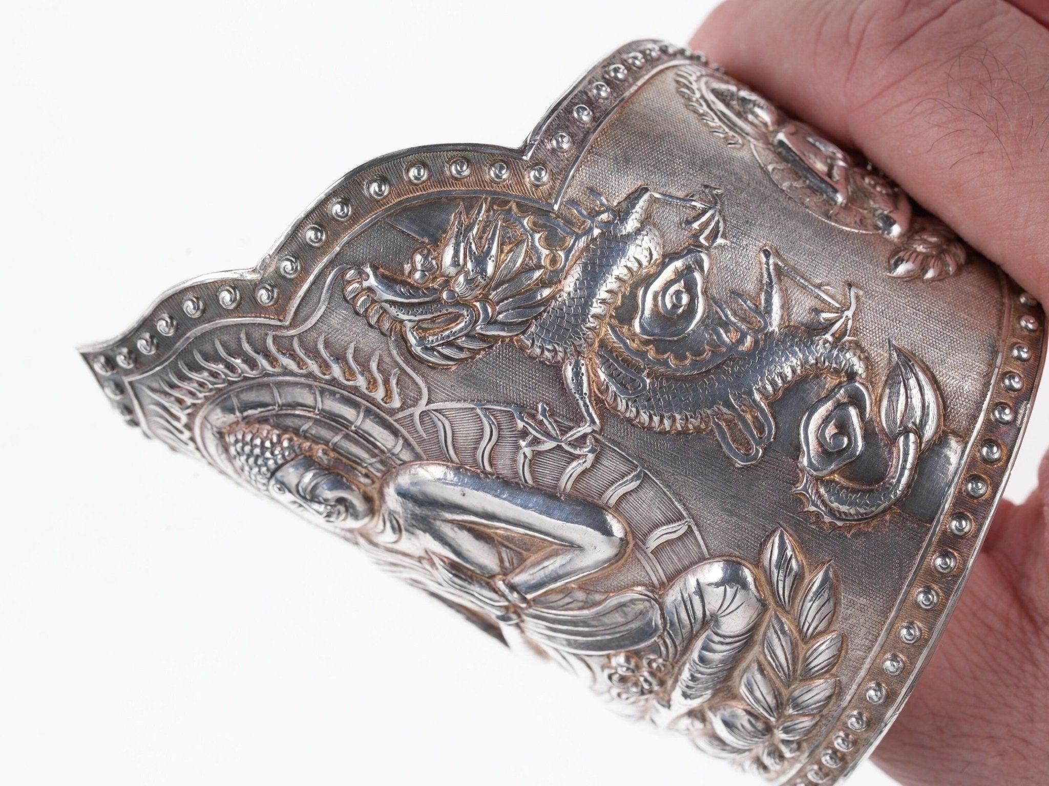 Antique Asian silver Repousse Buddha Cuff bracelet. Very nice large cuff from<br>the first quarter of the 20th century with no issues or damage. 7" inside<br>circumference including the .5" adjustable gap, marked silver, tests over 90%<br>silver. 145.9 grams 3 5/8" wide in center.