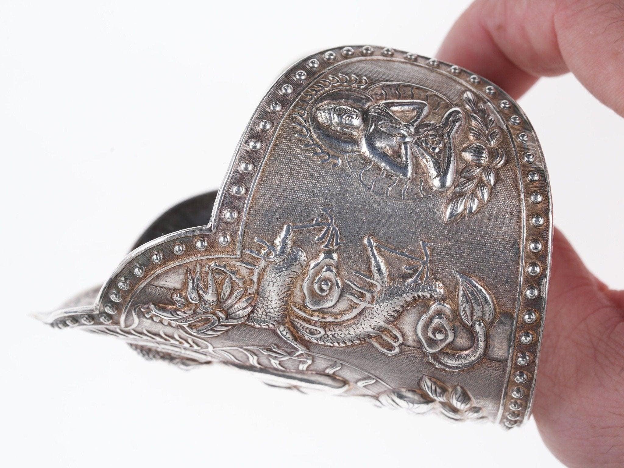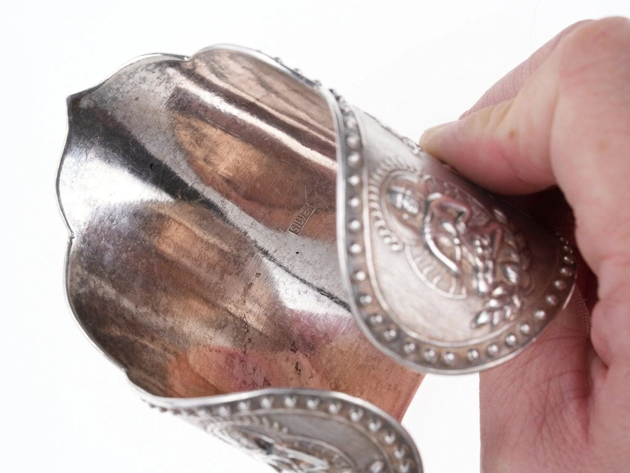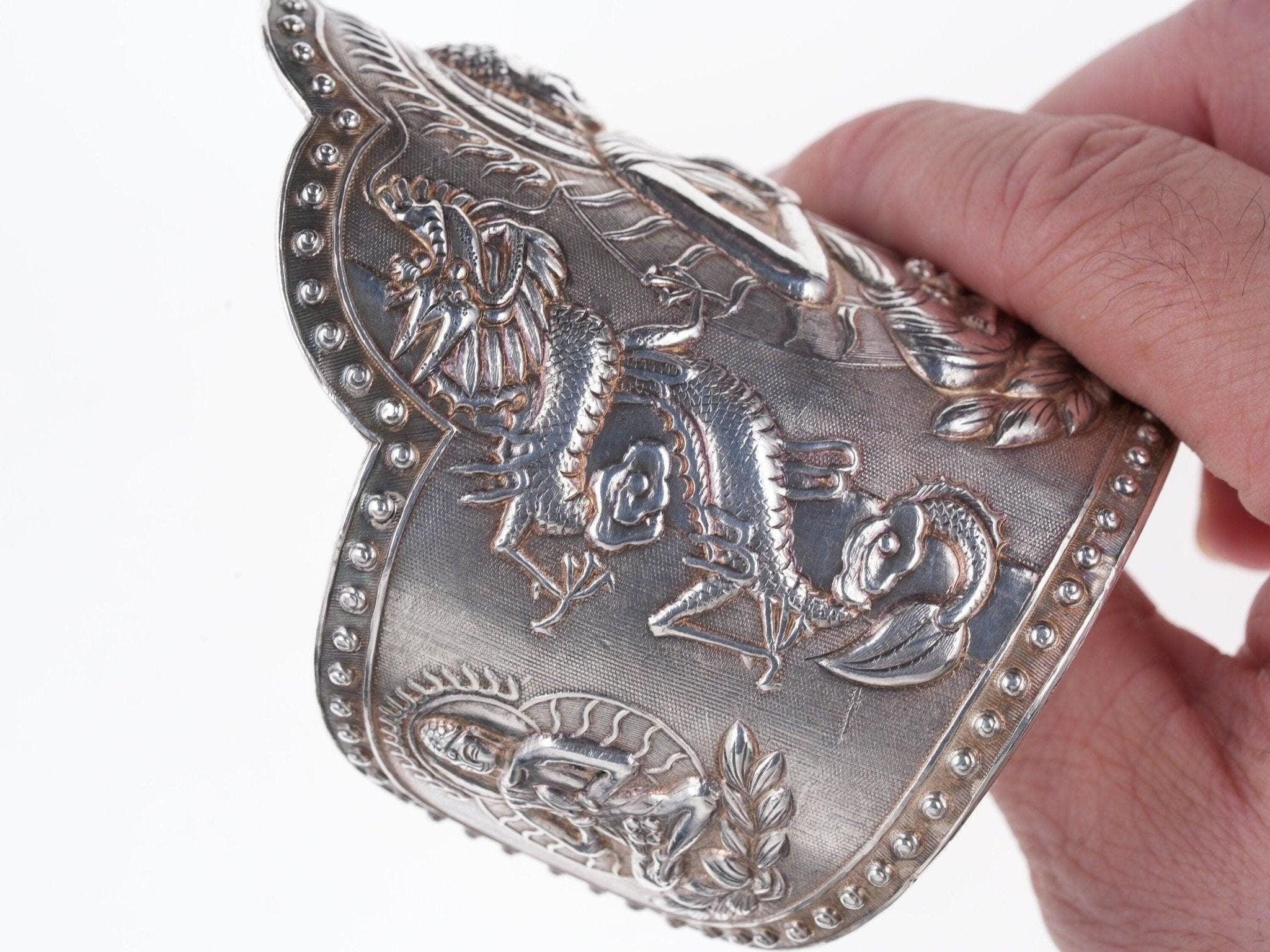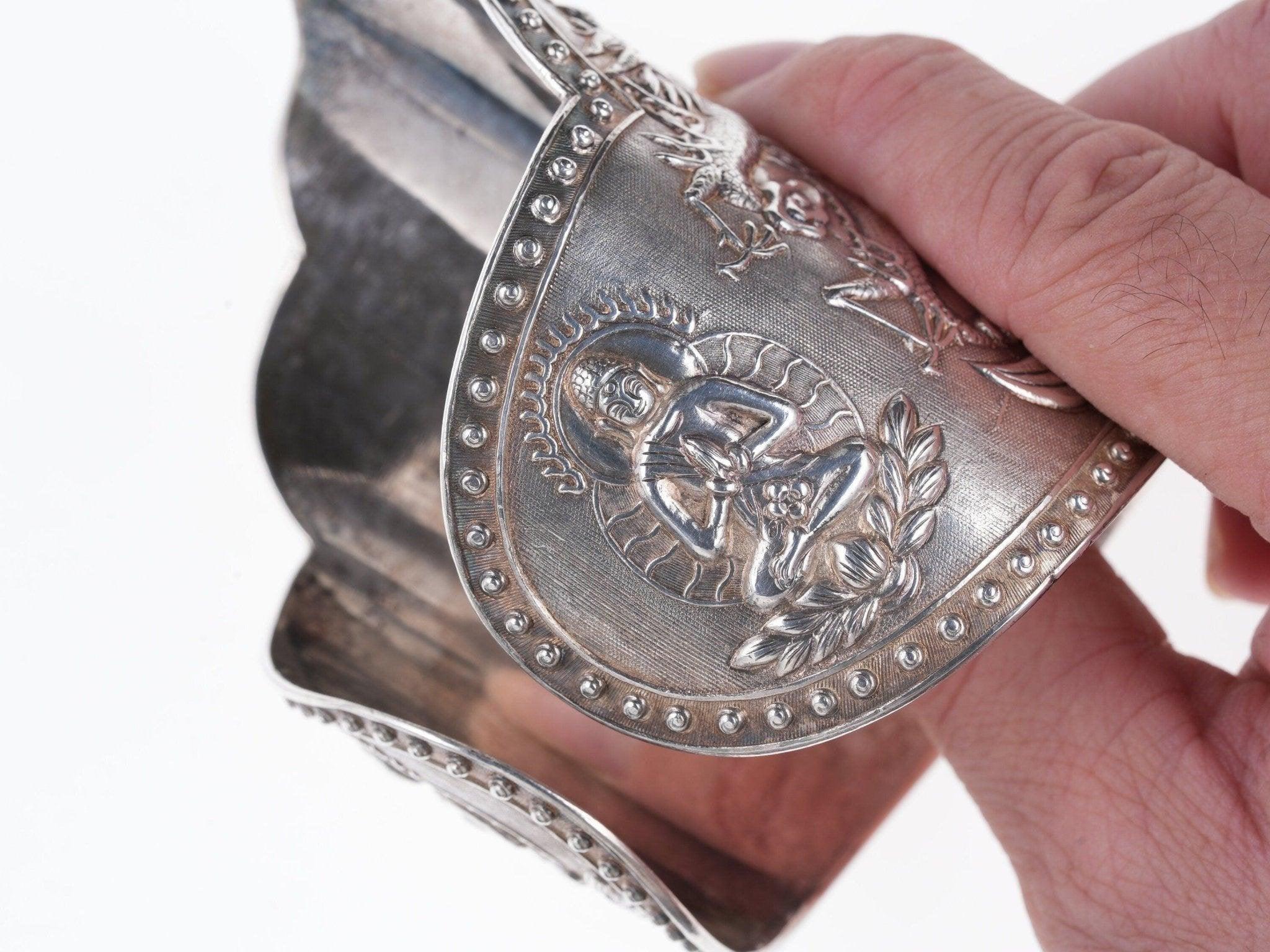 Antique Asian silver Repousse Buddha Cuff bracelet. Very nice large cuff from<br>the first quarter of the 20th century with no issues or damage. 7" inside<br>circumference including the .5" adjustable gap, marked silver, tests over 90%<br>silver. 145.9 grams 3 5/8" wide in center.