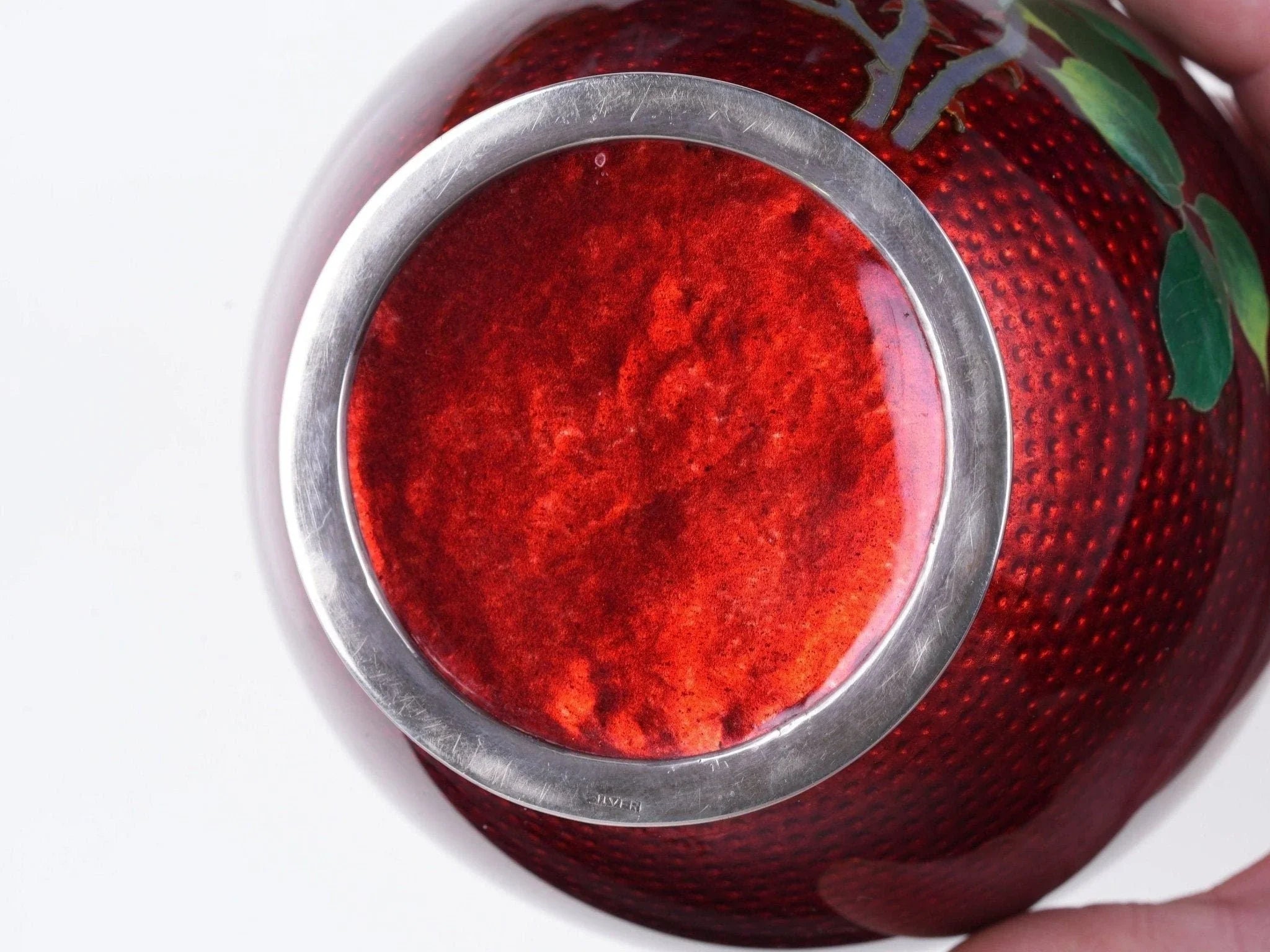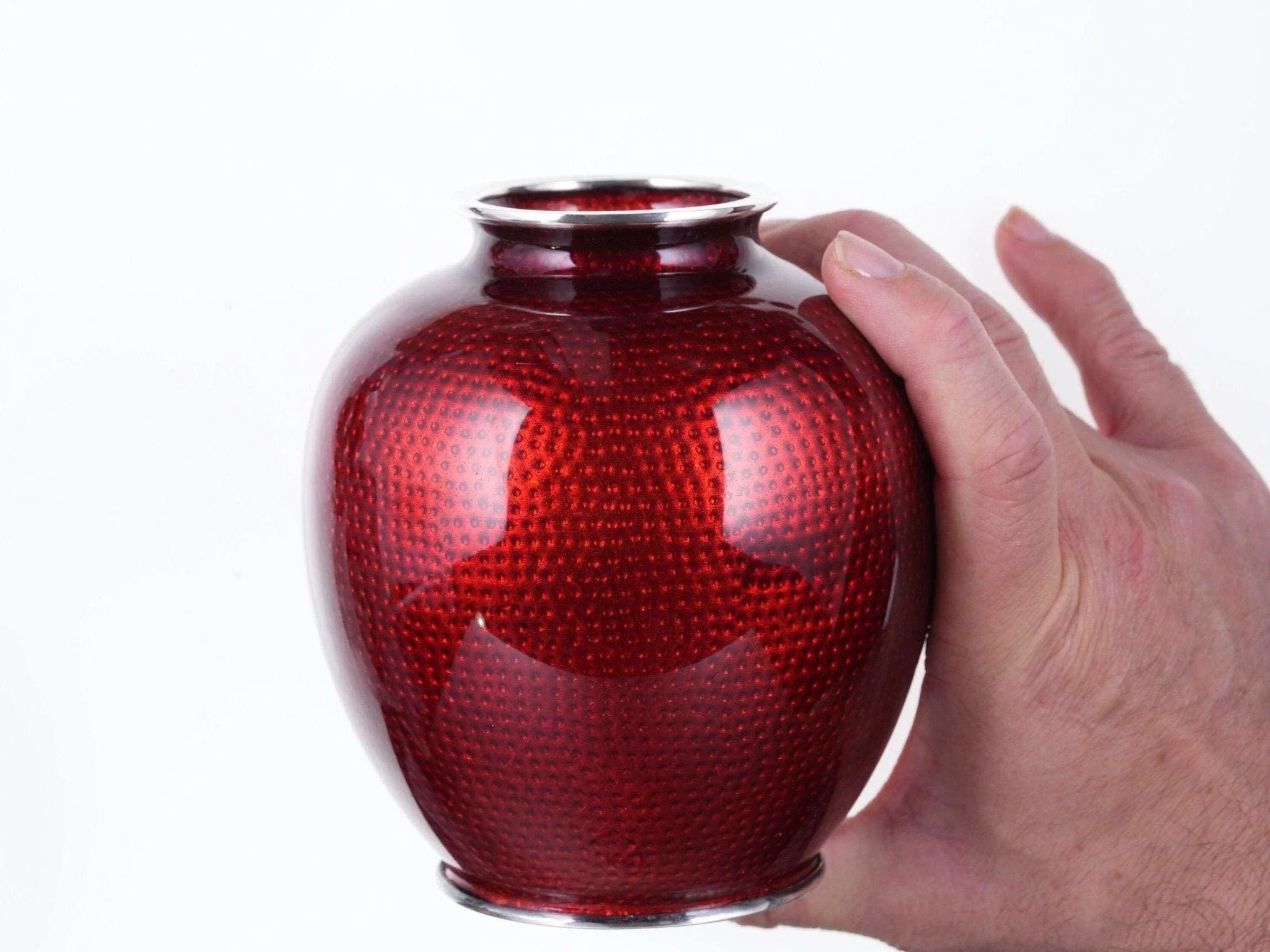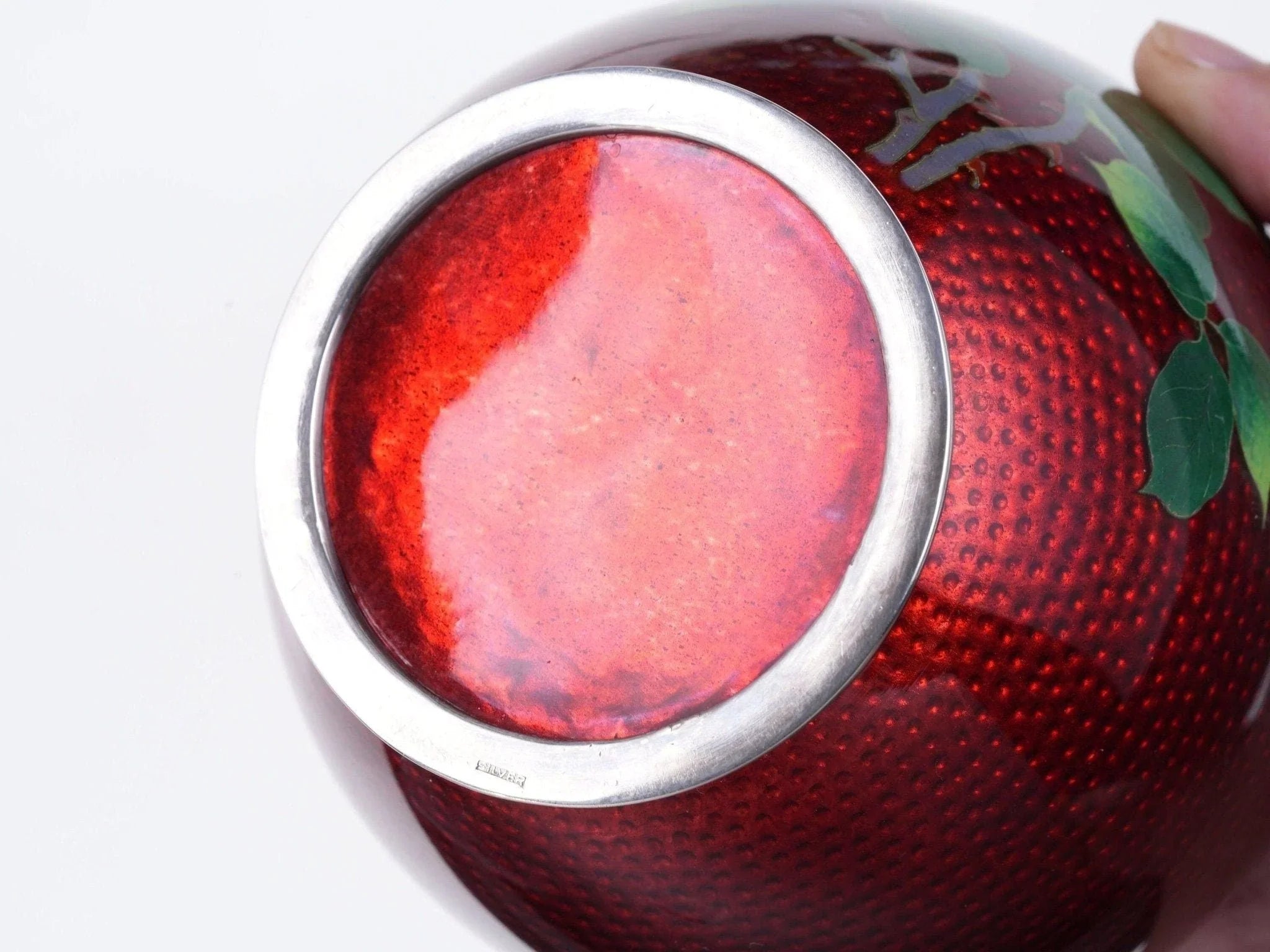 Antique Japanese Silver Wire Cloisonne Vase. Late 19th to early 20th century<br>with no damage whatsoever. 5.25" tall x 4.5" wide, silver wire, top, and bottom.<br>Marked silver on base. Guaranteed high content silver over 90%.