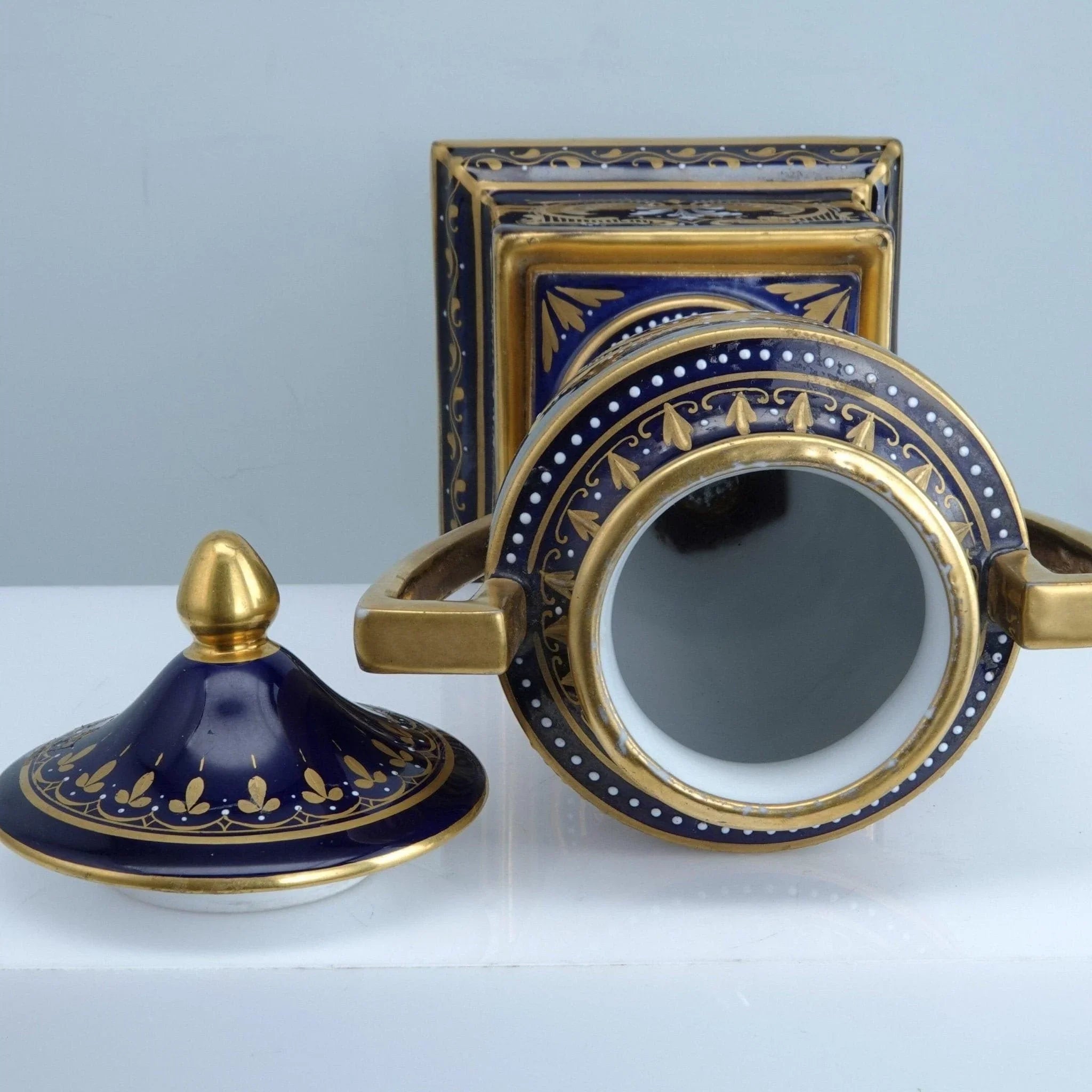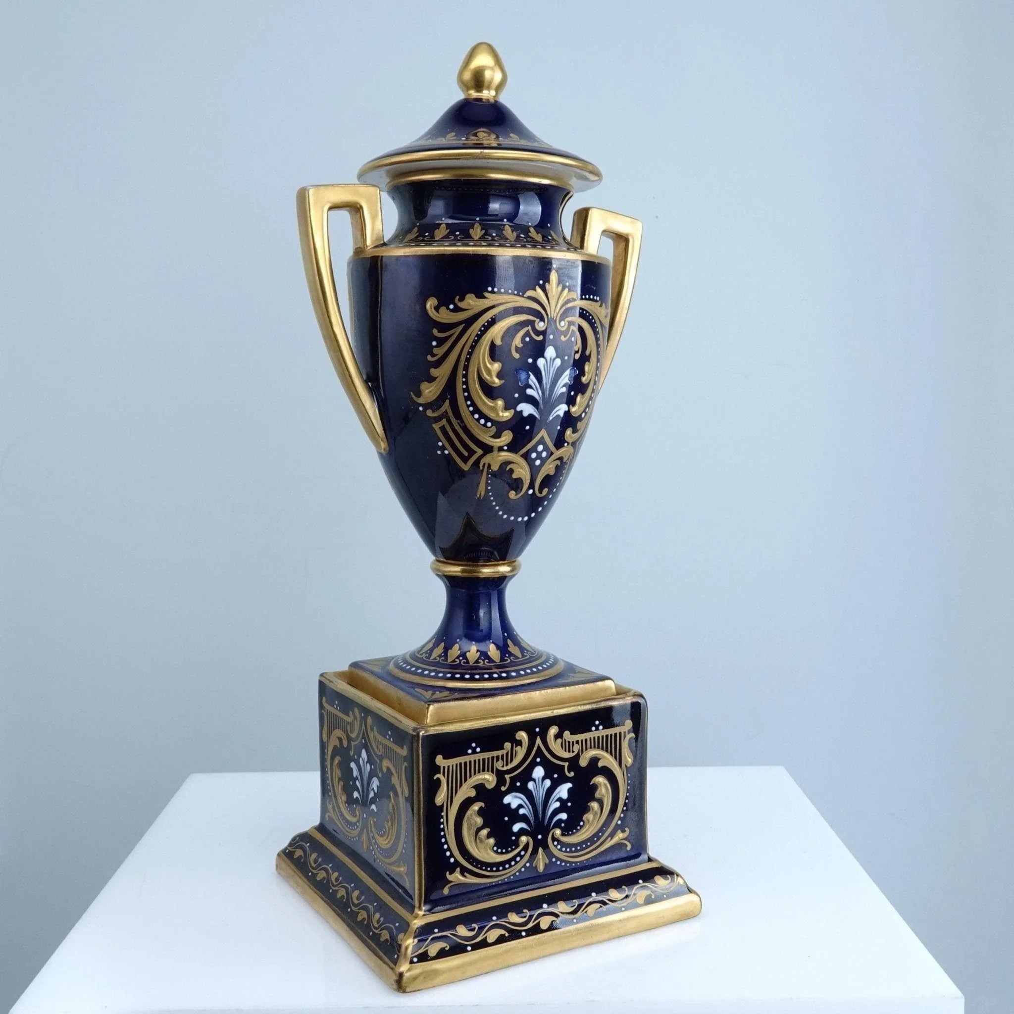 古董皇家维也纳风格瓮,手绘艺术家签名肖像,钴色地面上有重金和珐琅装饰。尺寸为 10 3/8 英寸高,无裂纹、缺口或修复。如图所示,有轻微的黄金损失和珐琅损失,女性头上有微小的油漆损失喷嘴。总体状况良好,良好且紧密。保证是大约 19 世纪末奥地利瓷器。