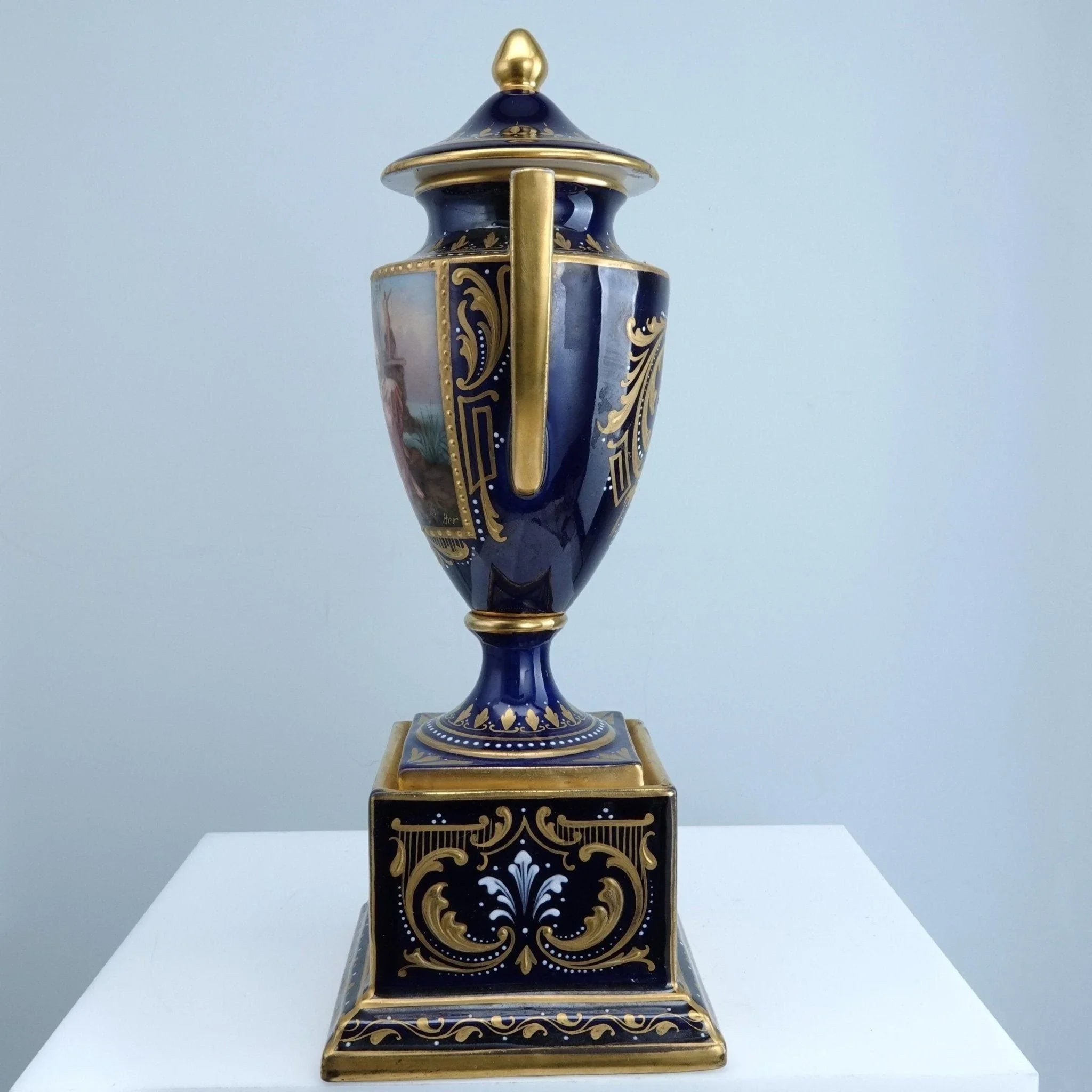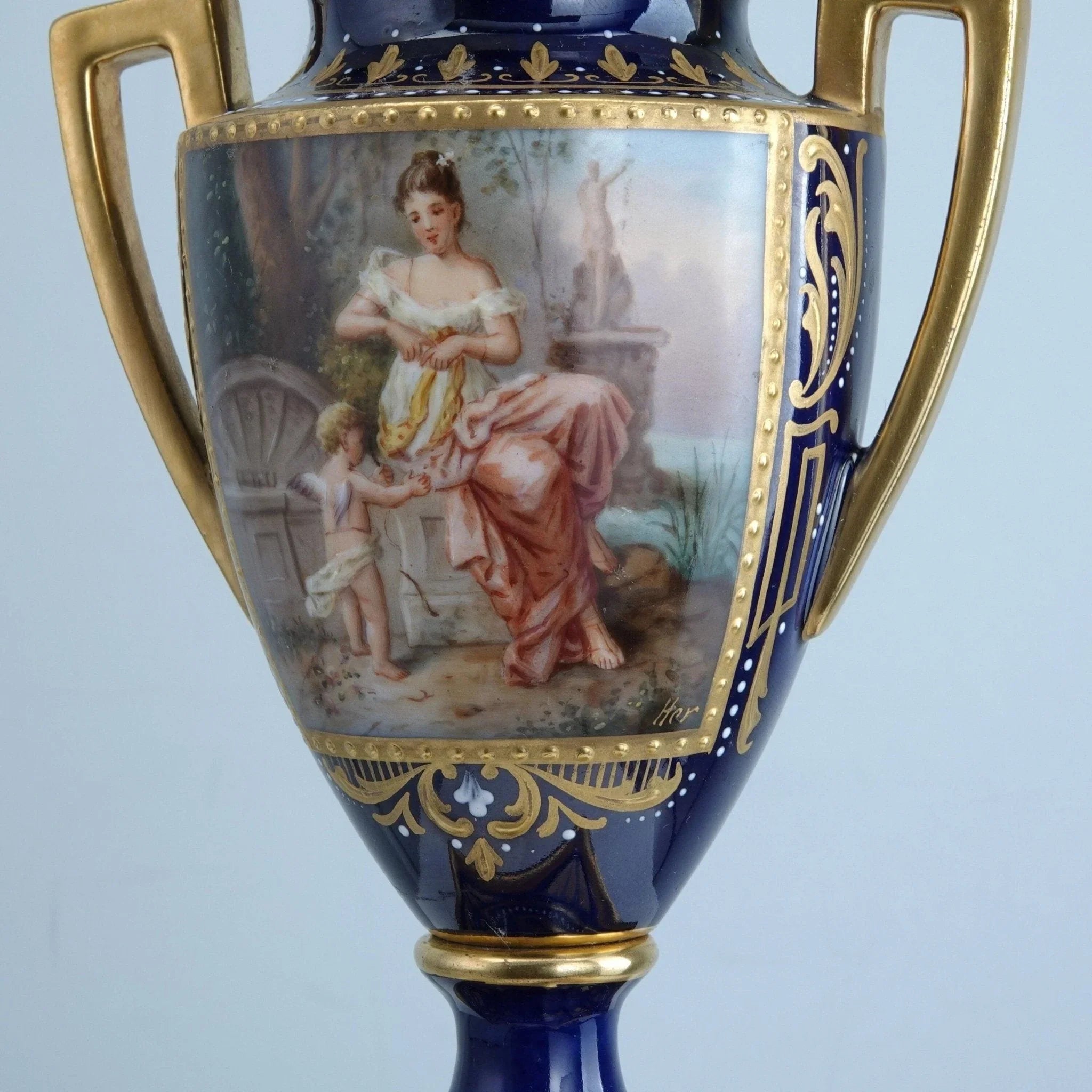 古董皇家维也纳风格瓮手绘艺术家签名肖像,钴色地面上重金和珐琅装饰