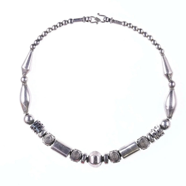 古董银色印度教象头神围兜项链。漂亮的旧重块 104.3 克。在 4 个地方标记为 80,我假设这意味着 80% 的银。我测试了一下,测试结果超过 80%,但低于英镑。总长度约为 14.5 英寸,因此最适合作为项圈,它有一根旧布绳将底部链接固定在一起,一个底部吊坠缺失,但另一个可以轻松移除以使其平整。