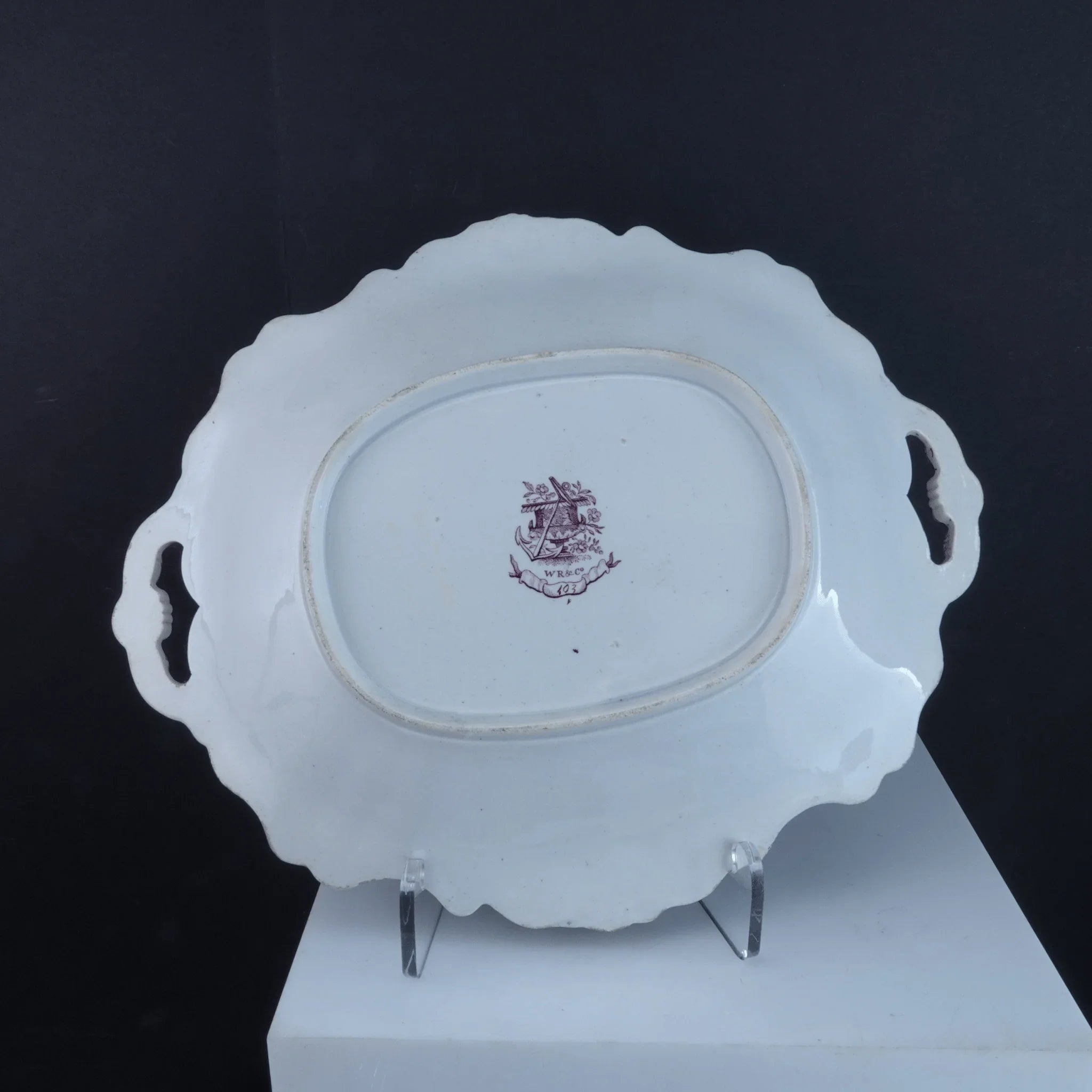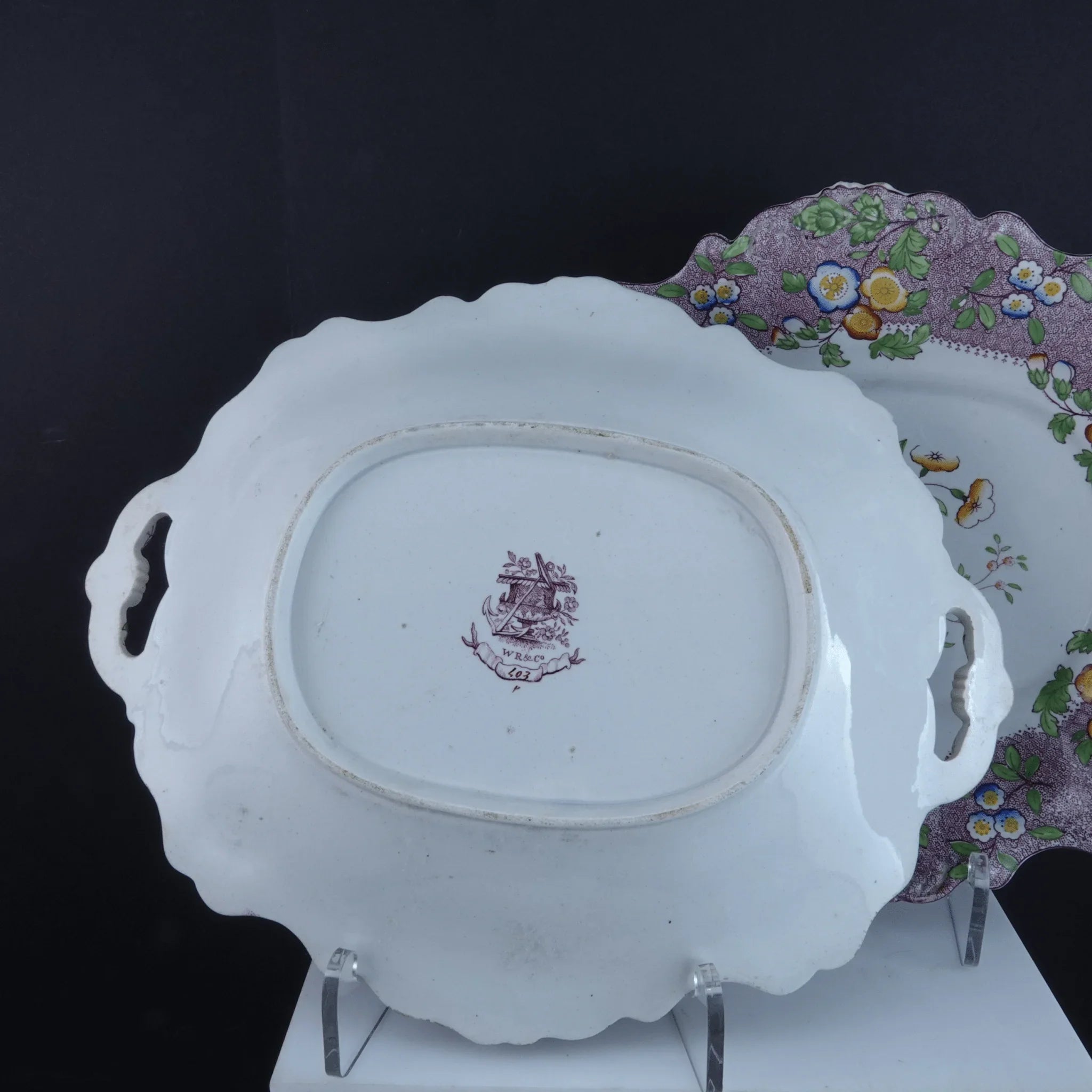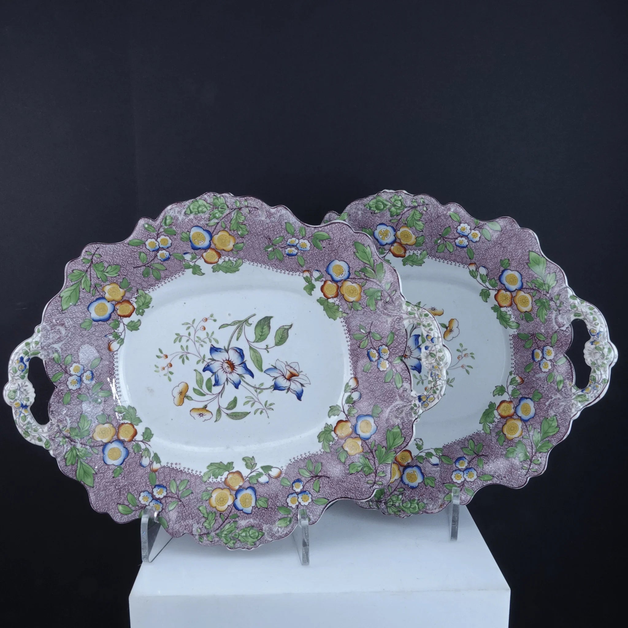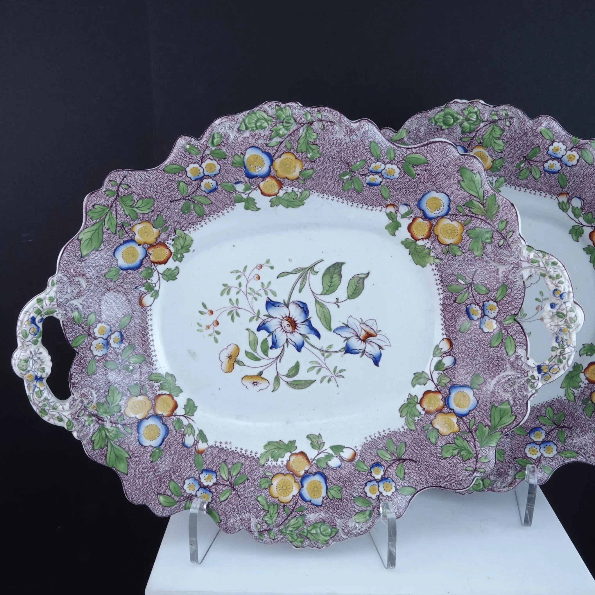 c1840 William Ridgway Tab Handled Cake Plates Pair. 11.75" x 9.5". Both super clean have been hanging on a wall for 40 years. No cracks, chips, or restorations, slightes glaze wear in very few spots. Selling both shown.<br>tw204