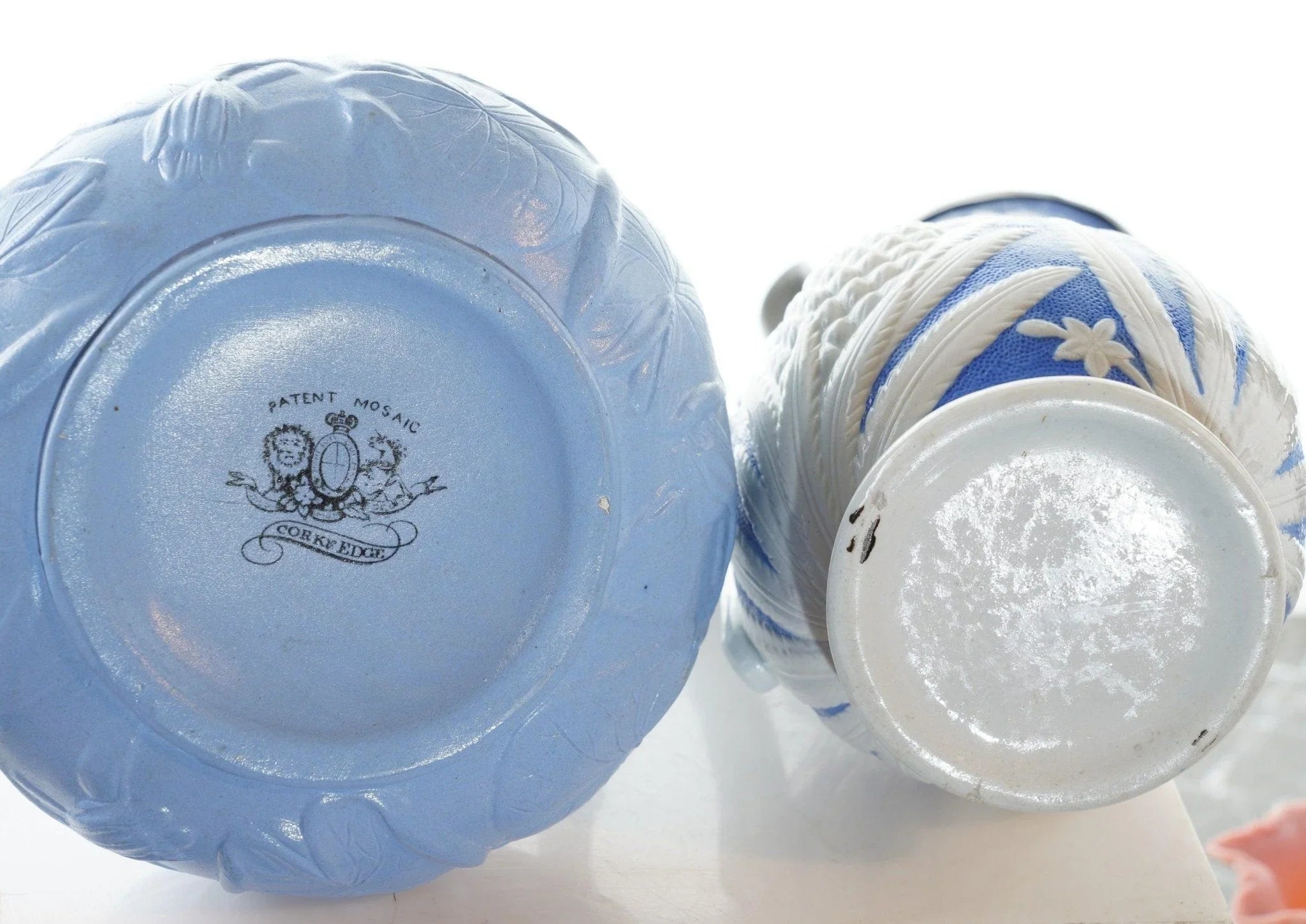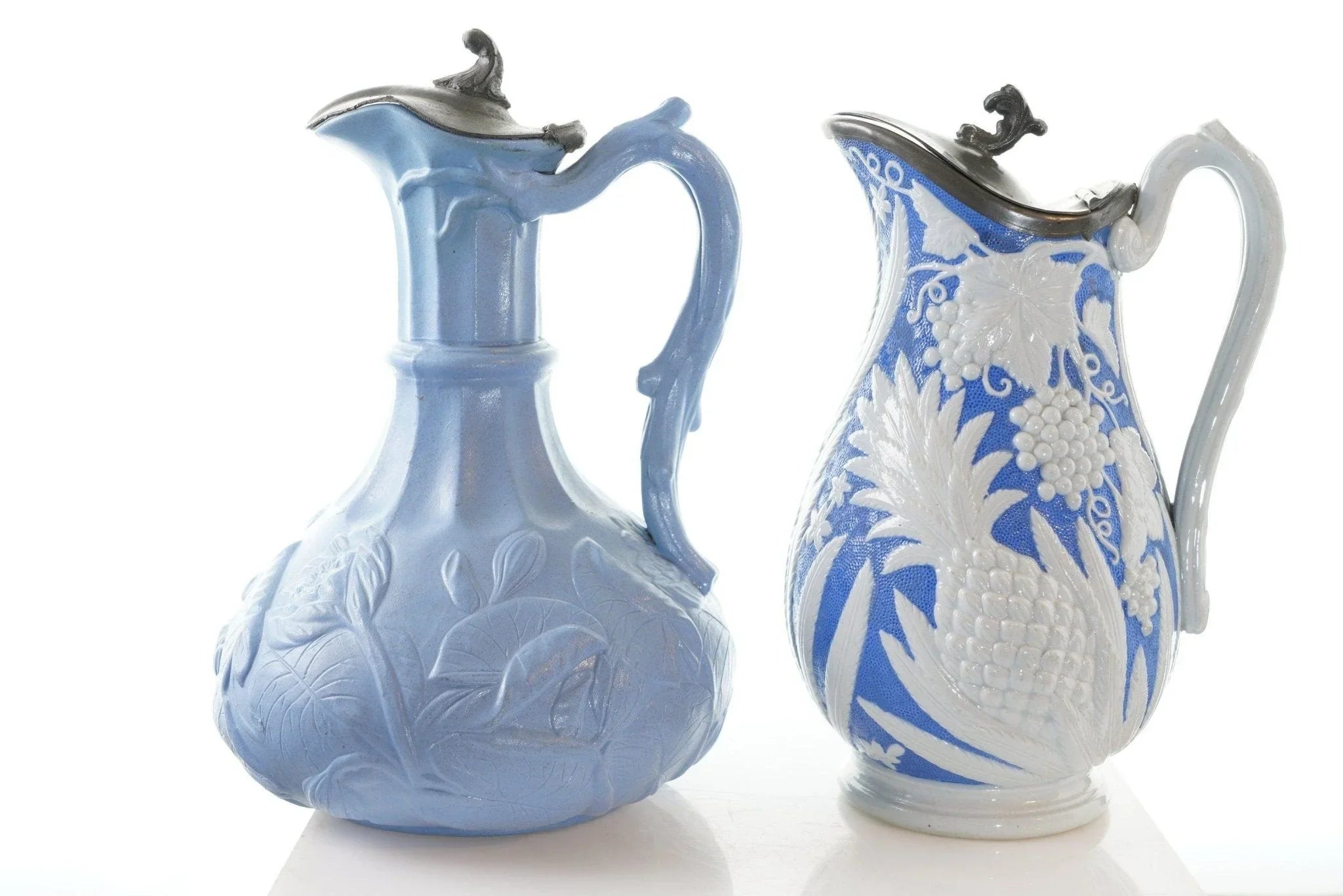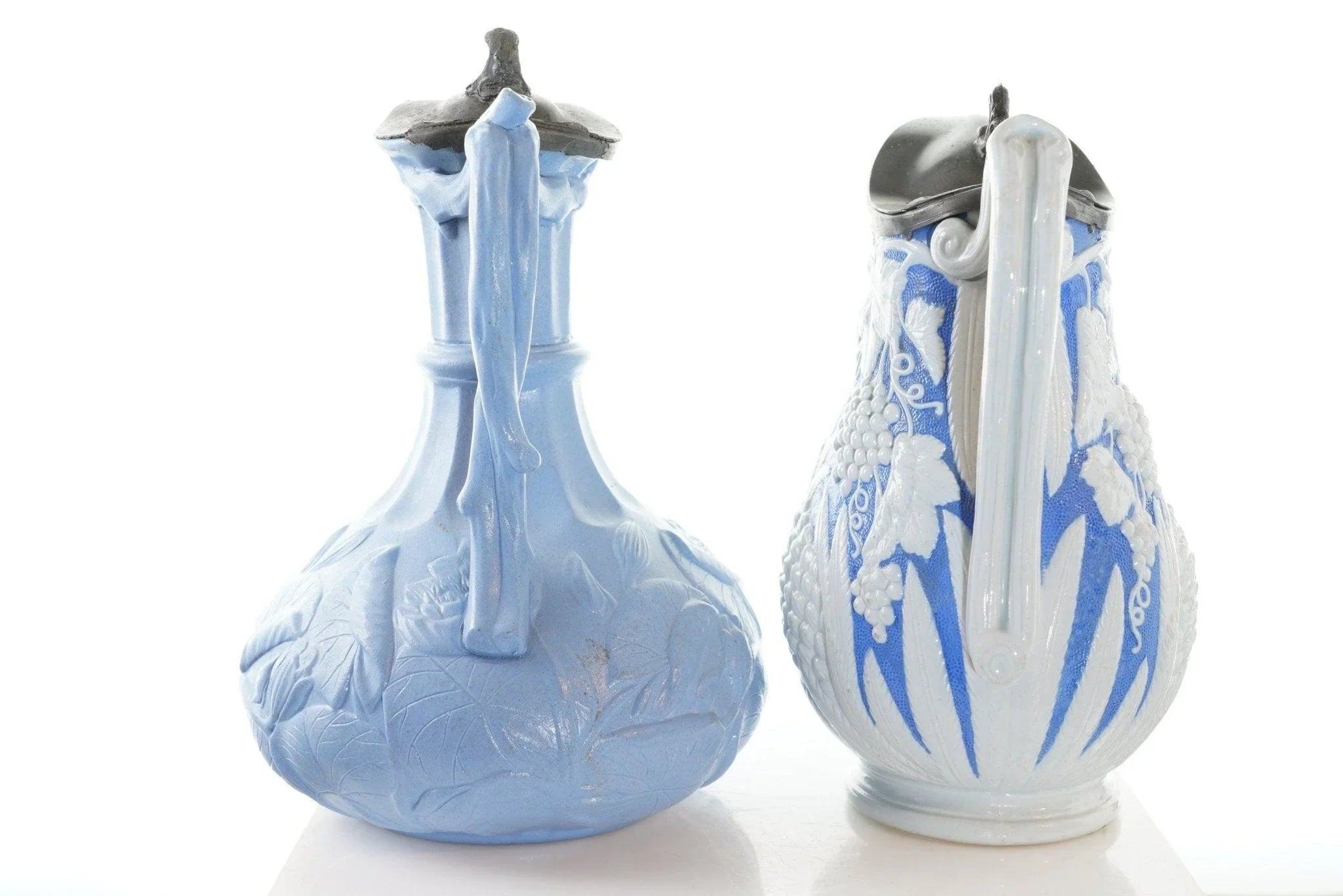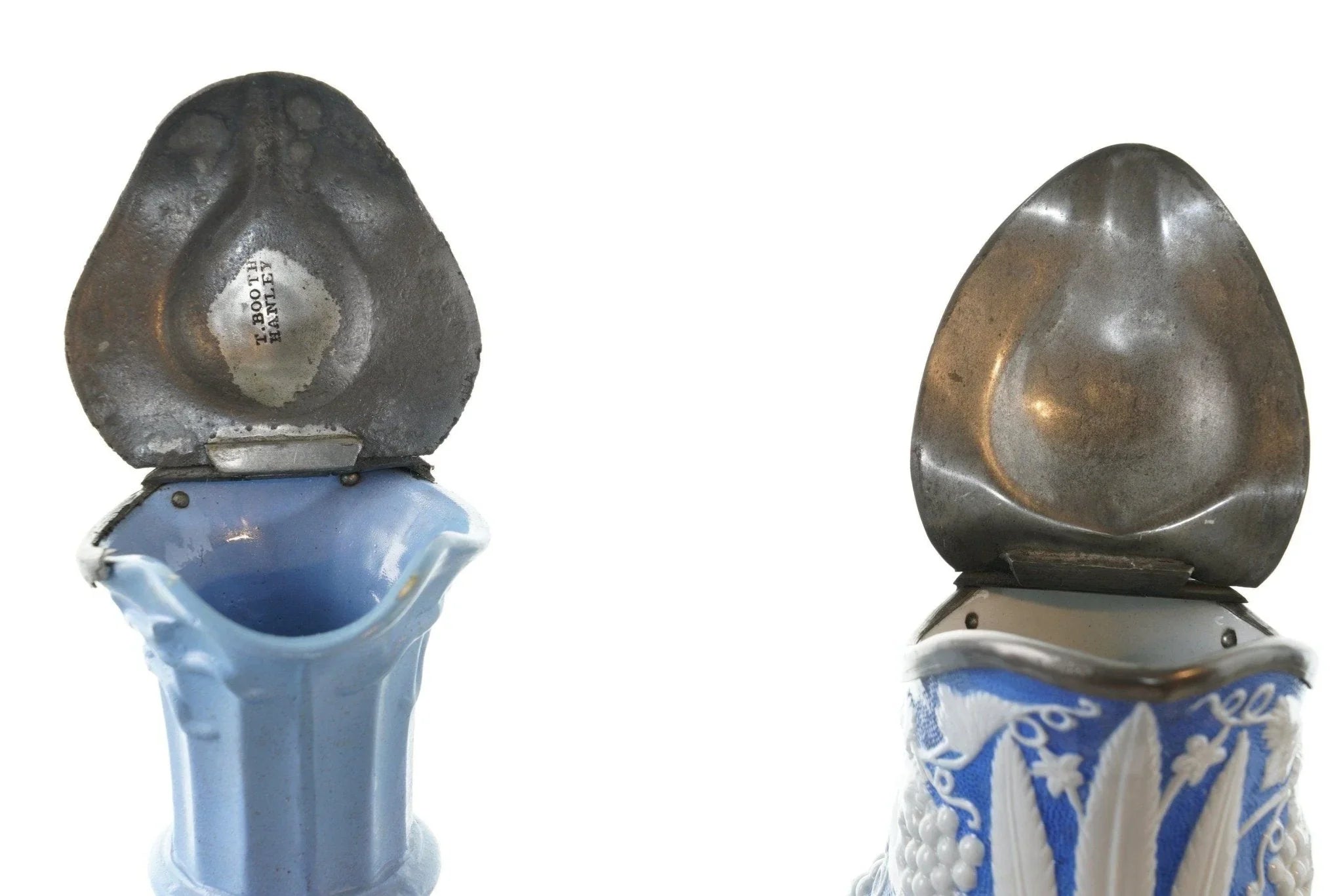 c1860 两个锡制浮雕模制水壶。出售所示的两个水壶,最高为 9.5 英寸,拇指抬起。对陶瓷没有损坏,盖子上有蓝色标记的 T 形隔间,底座上的软木和边缘对安装有一些损失,但盖子完好无损,功能未恢复。
