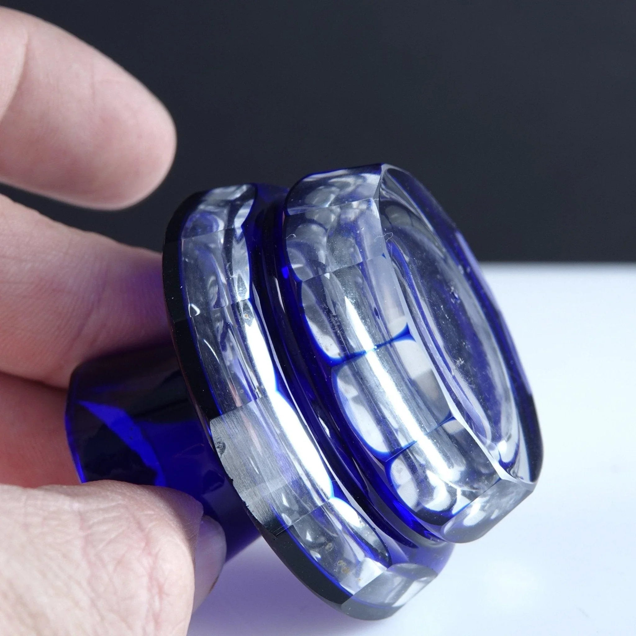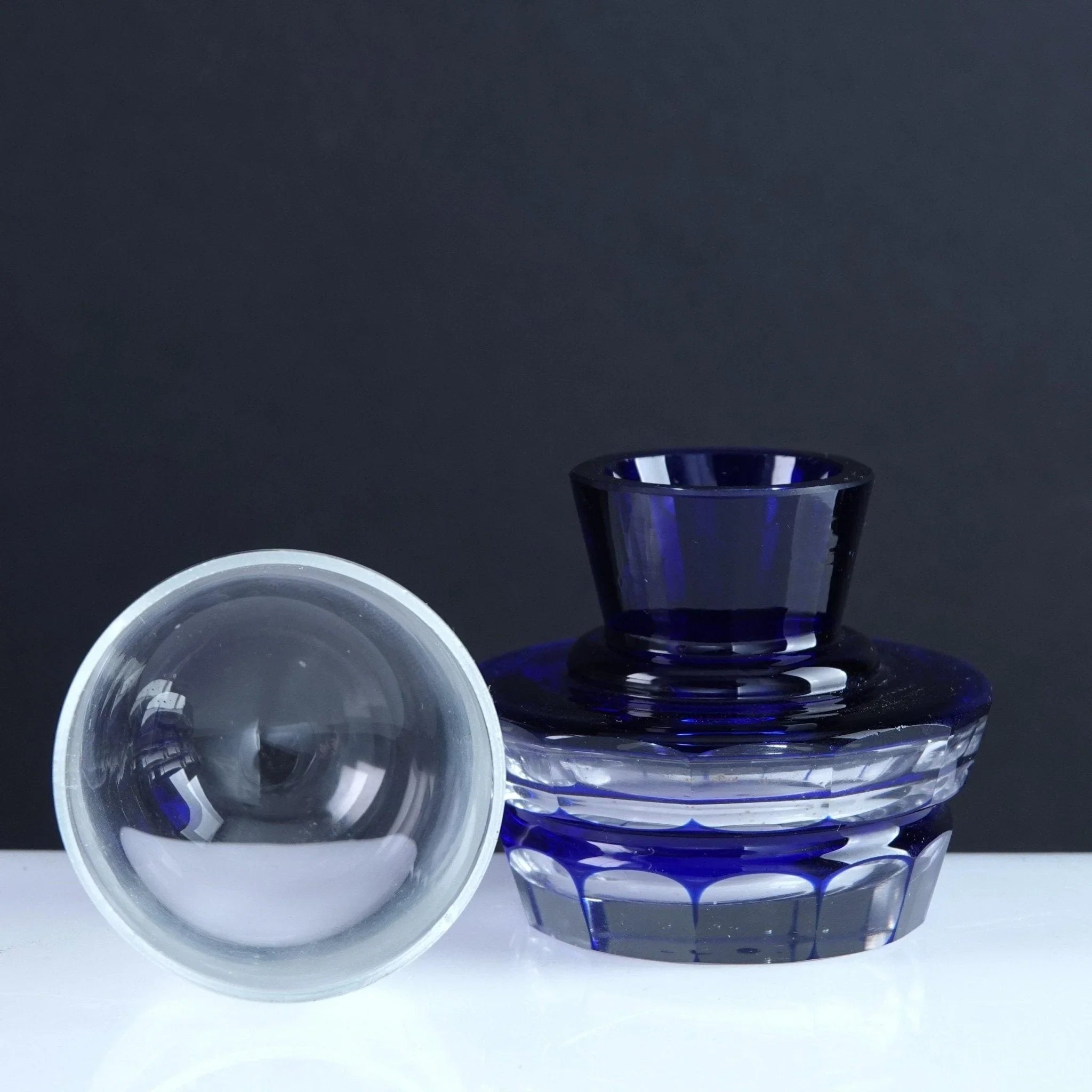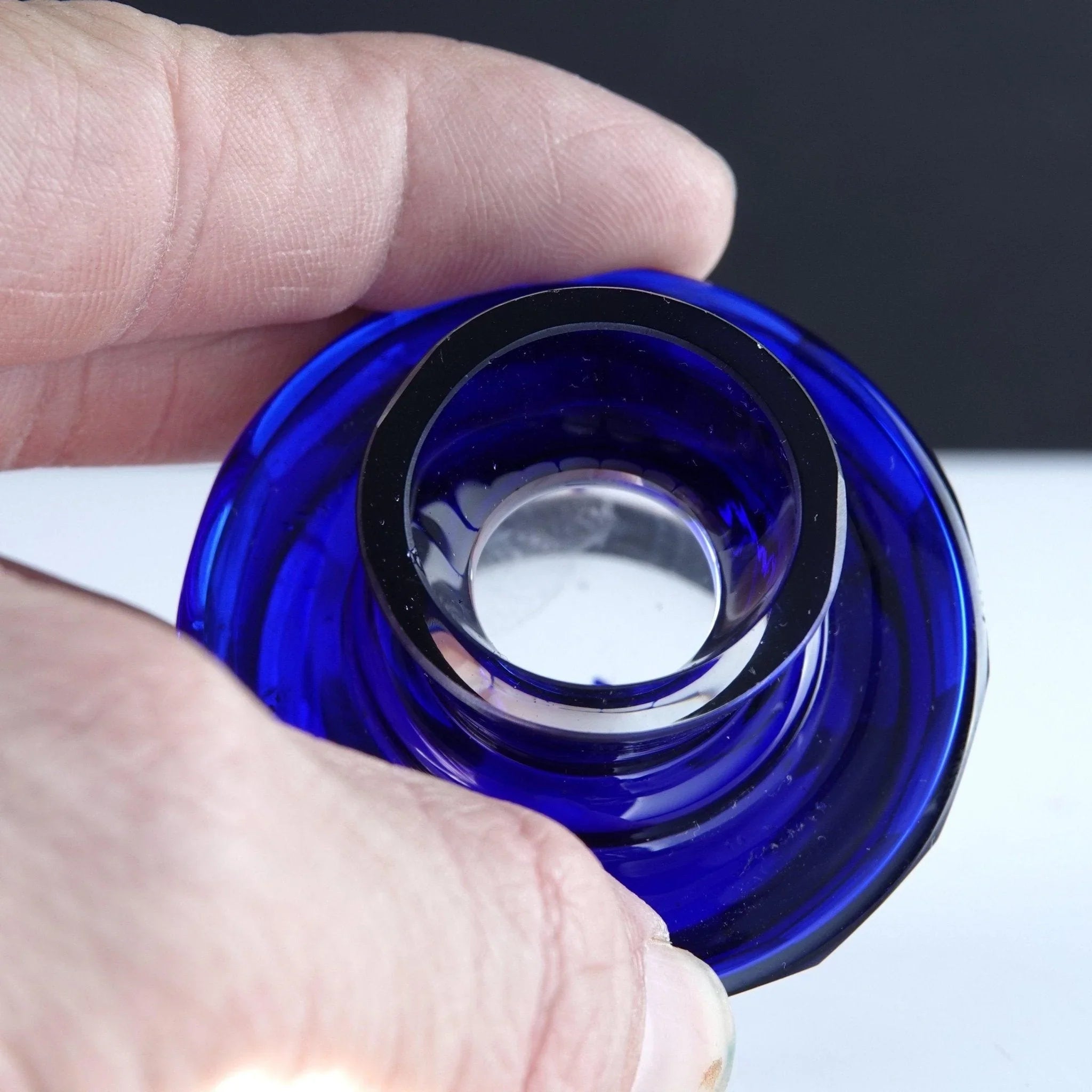 c1880 Cobalt Flashed Cut to clear inkwell. Nice rare cobalt cut overlay glass inkwell with original dome. Small nick on bottom of dome that could easily grind out, rea3"lly small. No other cracks, chips, or restorations. 3" ttall x 2.25" wide. TW156