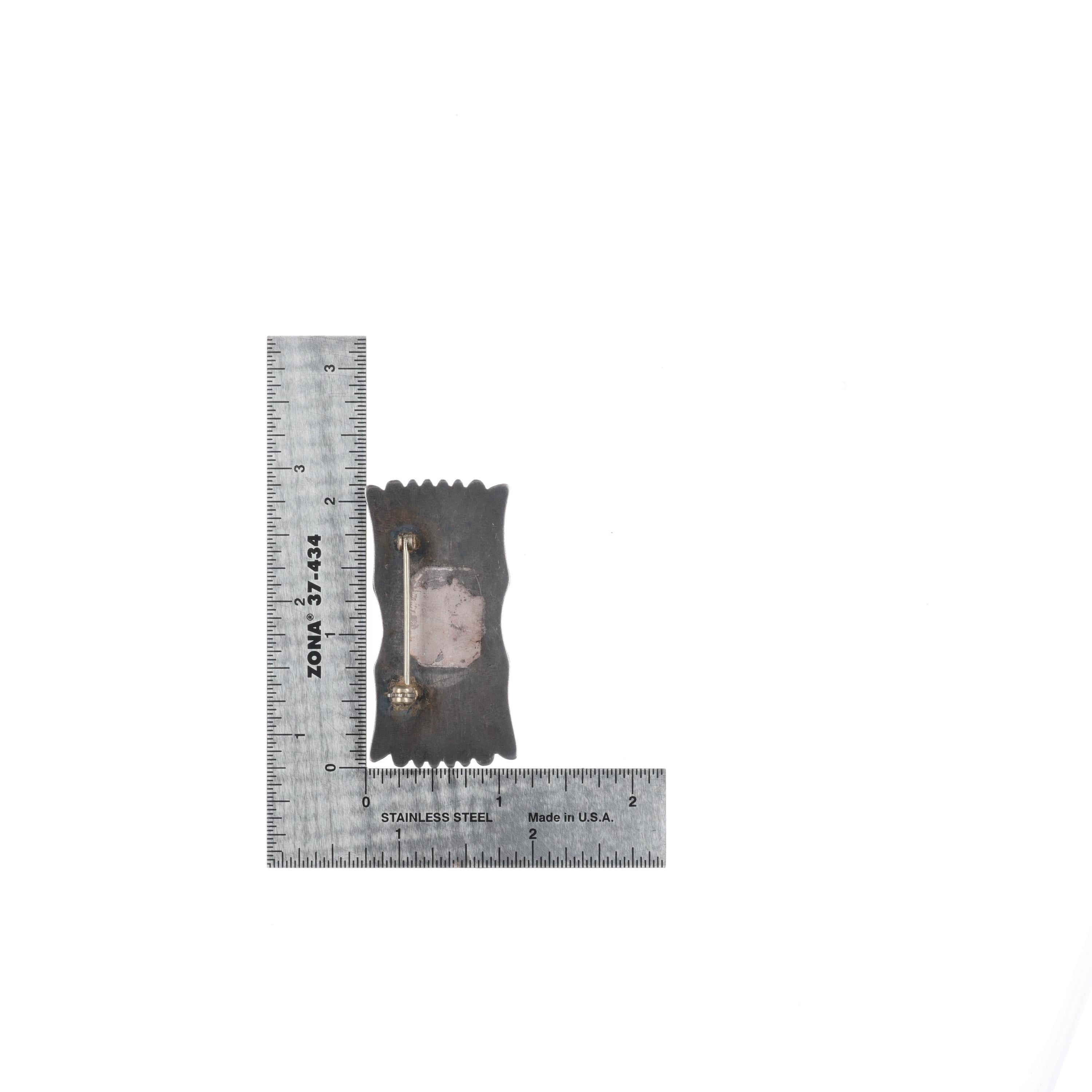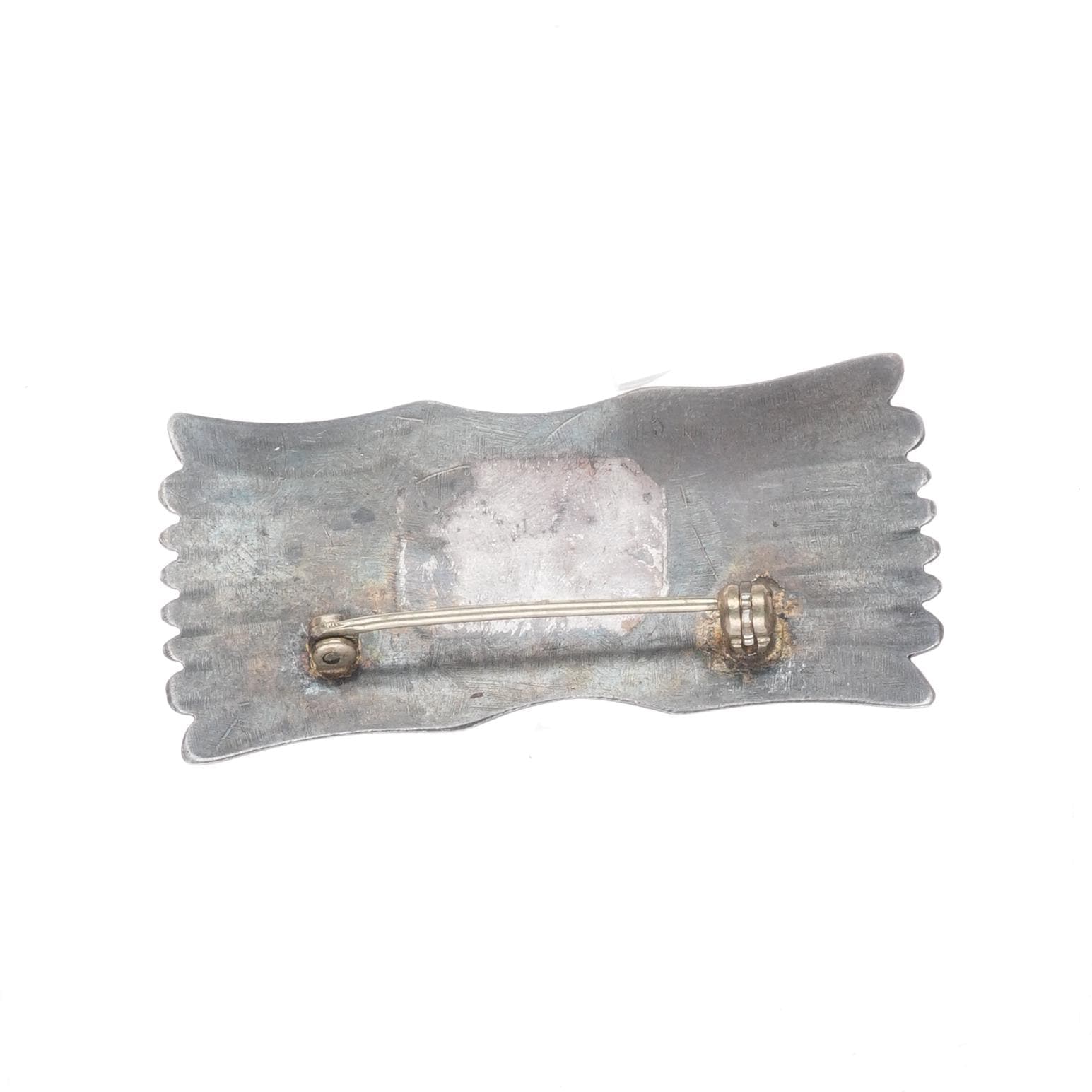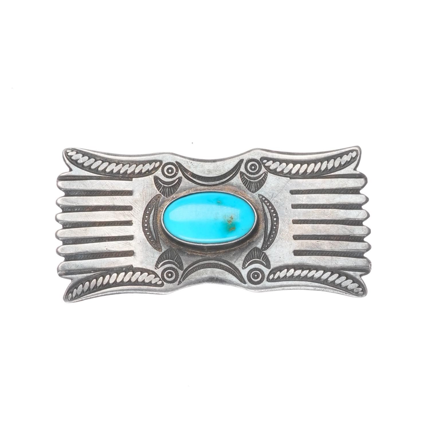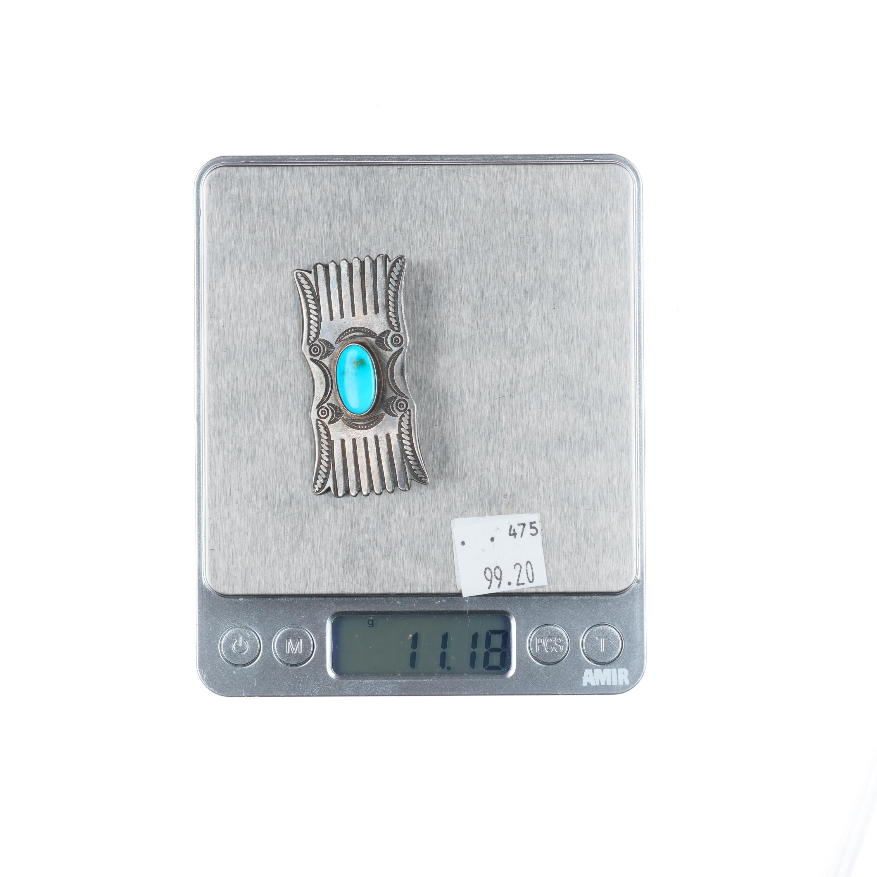 c1940‘s Navajo finely stamped sterling silver pin/brooch with turquoise. Solid sterling silver tested and guaranteed with weight and measurements in the pictures. No issues, circa second quarter of the 20th century.