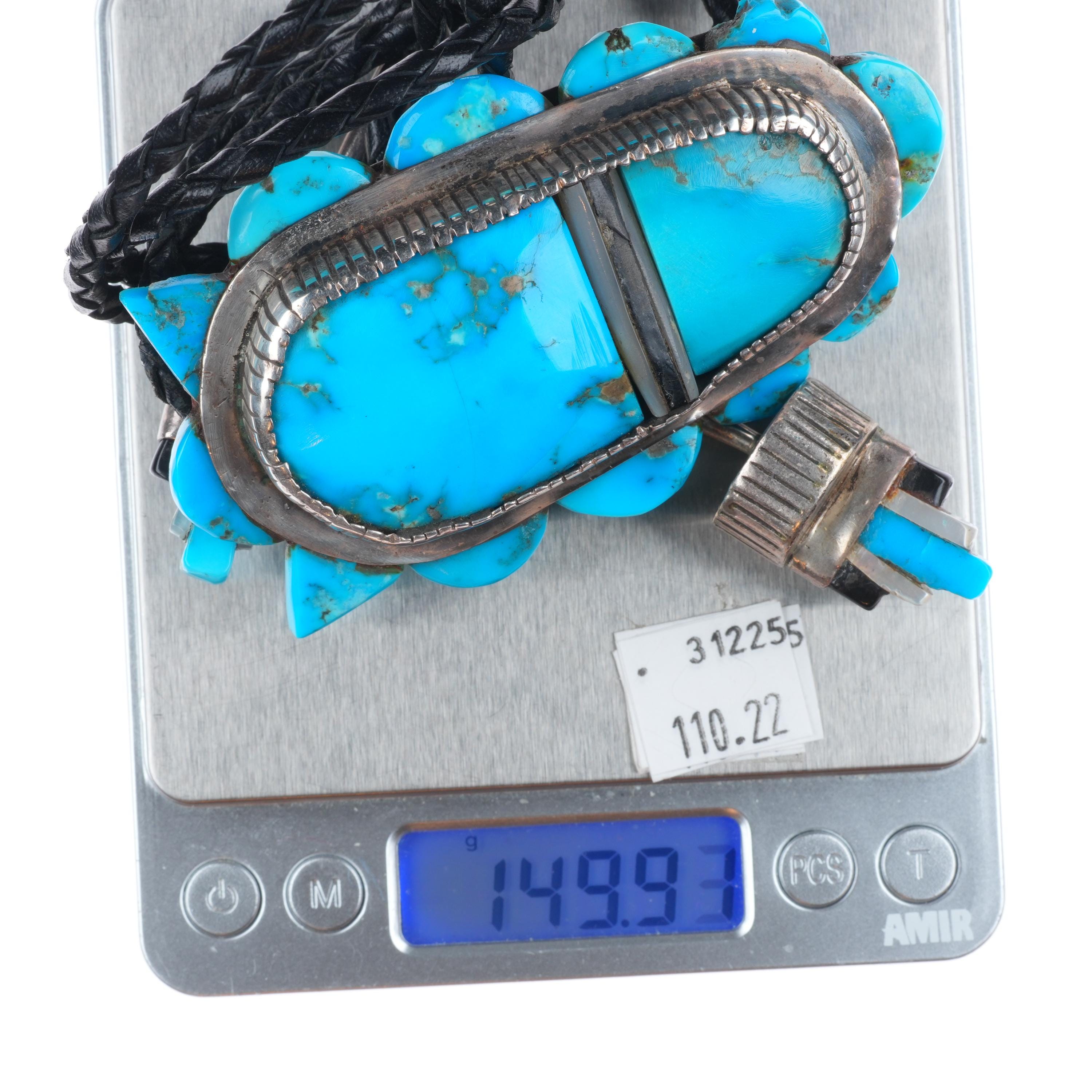 c1960 c-31 Calabaza Santo Domingo sterling silver turquoise inlay bolo tie. Tested and guaranteed solid sterling silver slide and tips. Weight and measurements in pictures. 41" long. Circa third quarter of the 20th century.