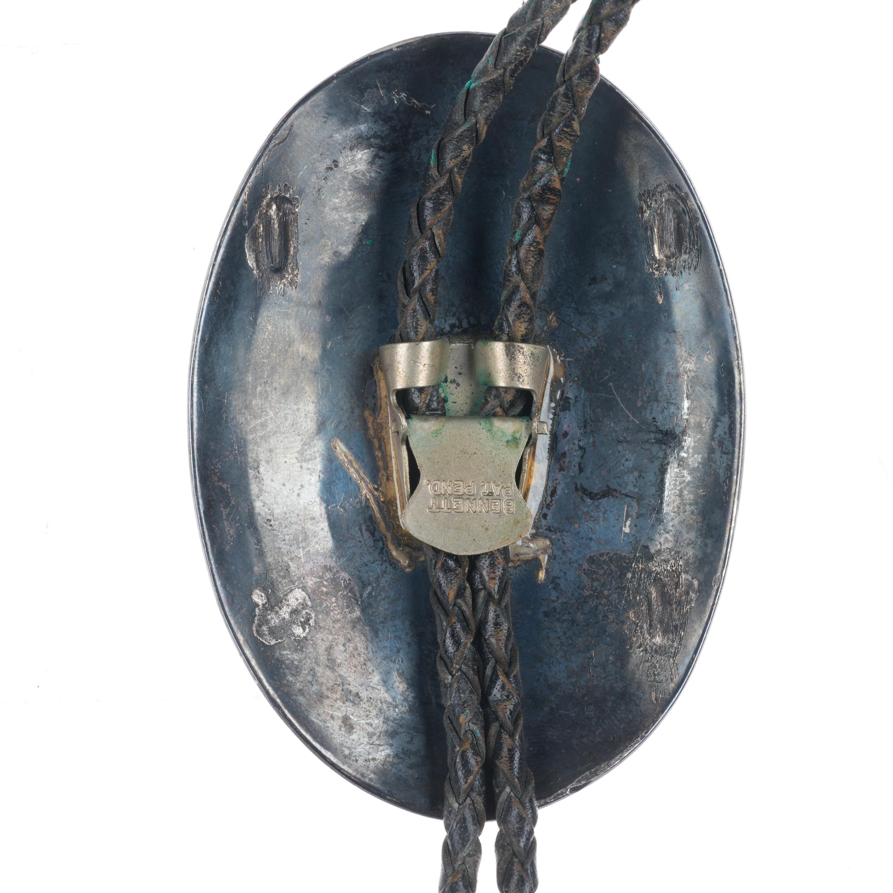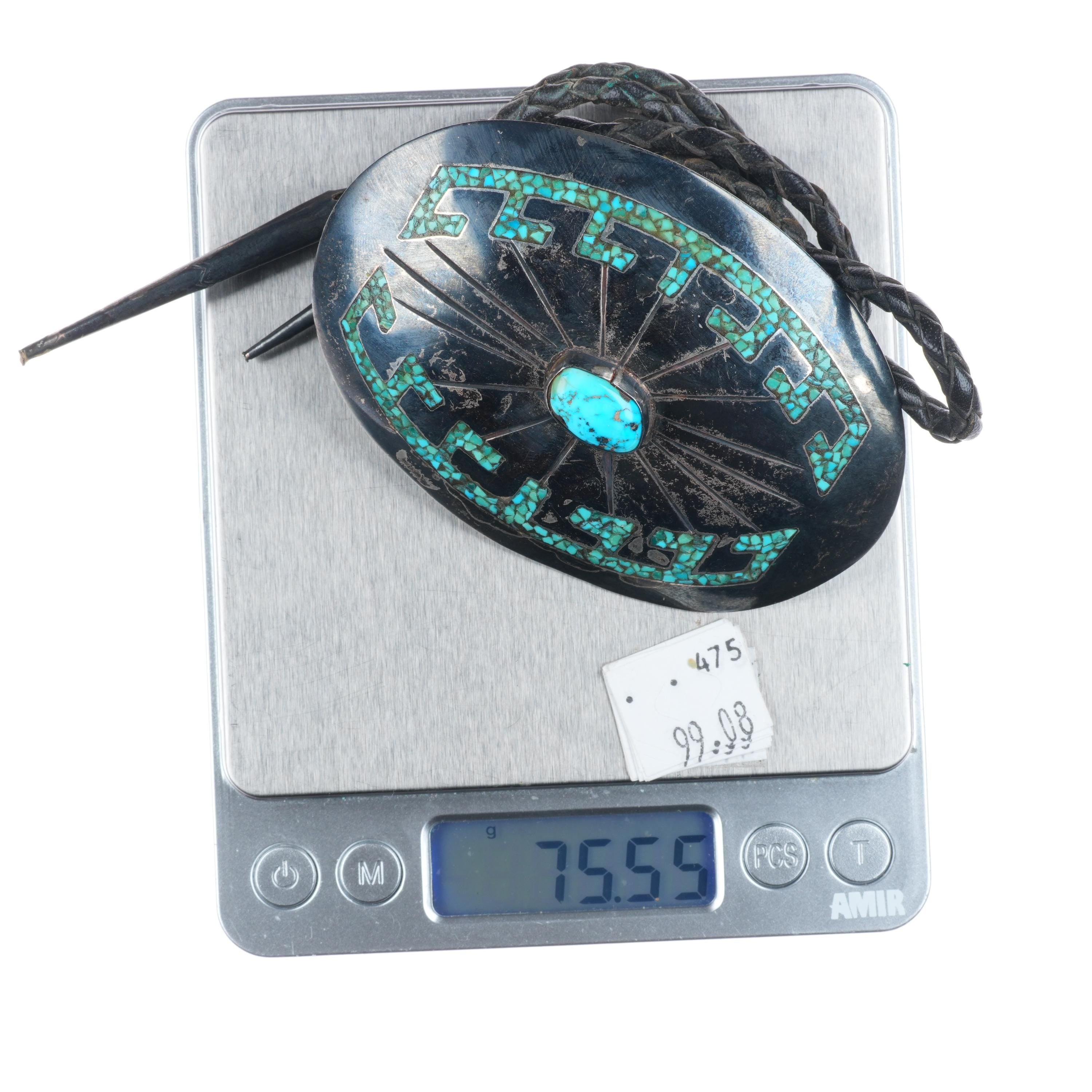 c1970 Navajo Vintage sterling silver large chip inlay turquoise bolo tie