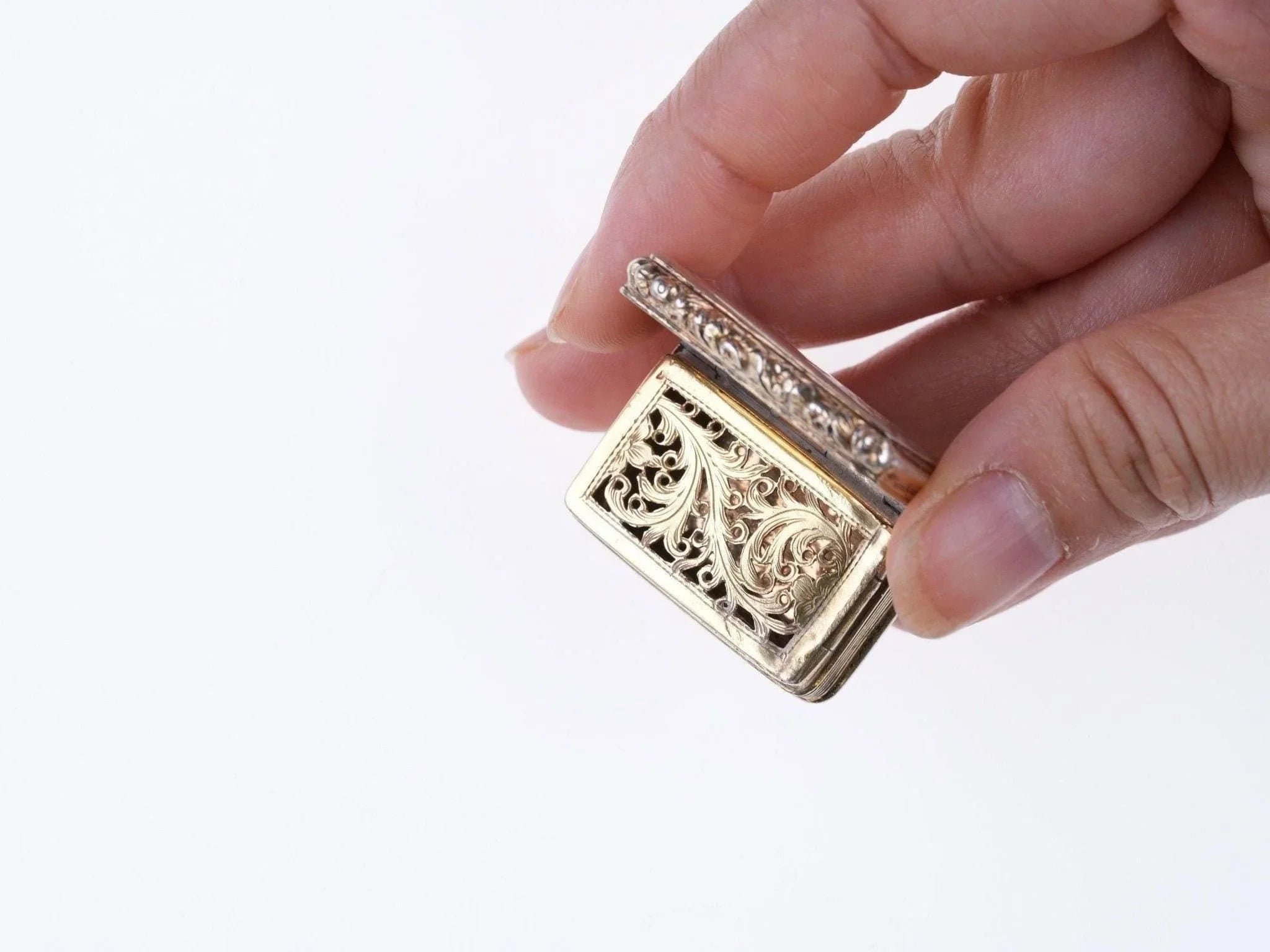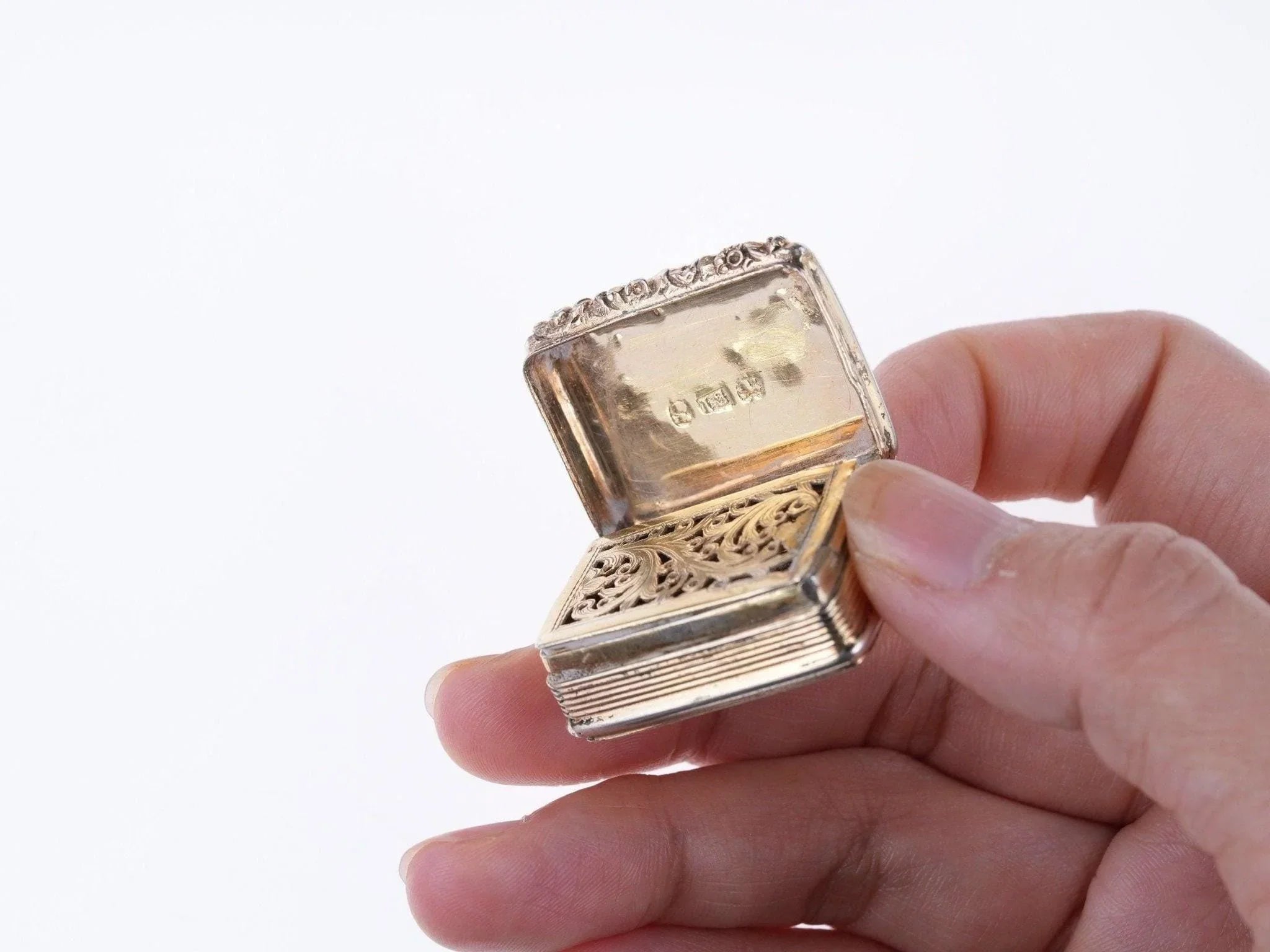 油醋汁的定义:银油醋汁是一种盛放香醋的小容器,女士们用它来防止头晕。已知最早的单独形式的例子可以追溯到 1492 年。此类作品从 18 世纪中叶开始流行,它们被制成无数的形式和风格(如圆形、椭圆形、多边形、心形或贝壳形,并以幻想形式呈现)。形状,如鞋子、书、表壳、钱包、橡子……),材质为银、金或瓷器,塞子下方有一个穿孔的金属格栅,或牢固地铰接的盖子,用于覆盖浸有香味物质的海绵。盖子和底座上均带有全纯银标记:制造商:TS。 Thomas Shaw 于 1818 年至 1837 年间在伯明翰注册,以制作银油醋汁和鼻烟盒而闻名。