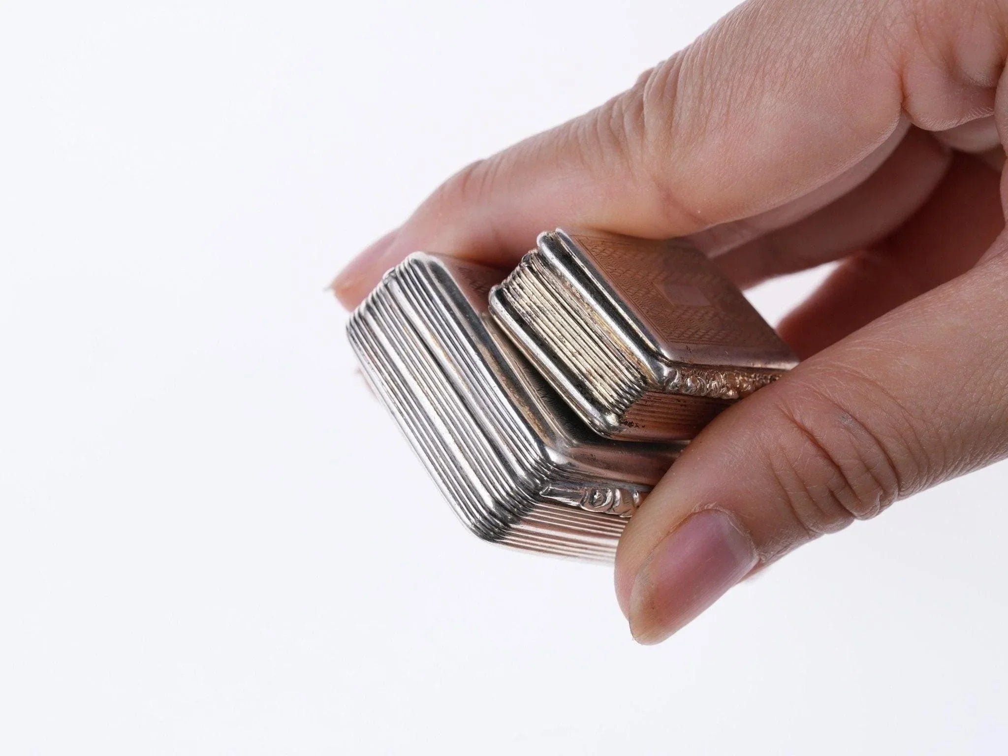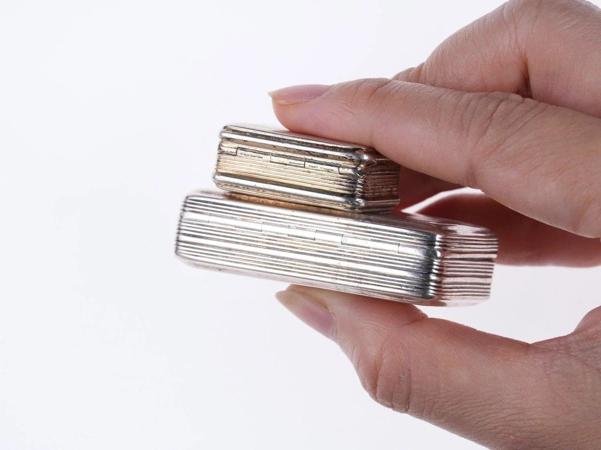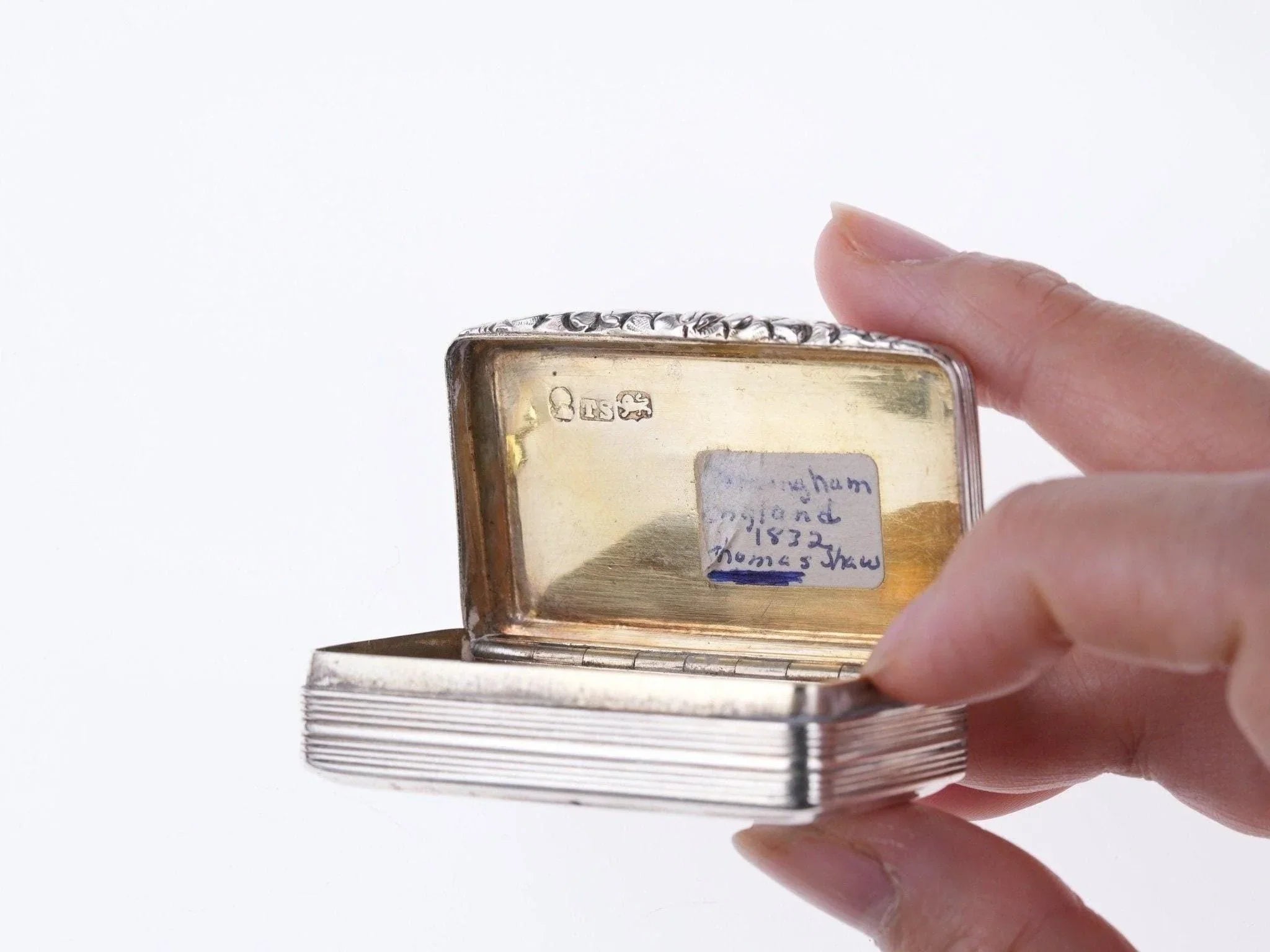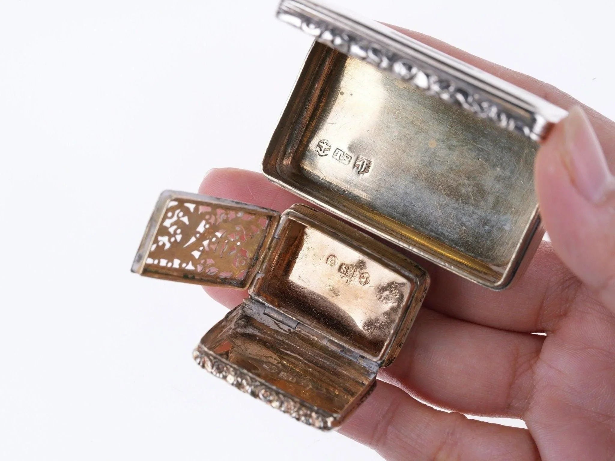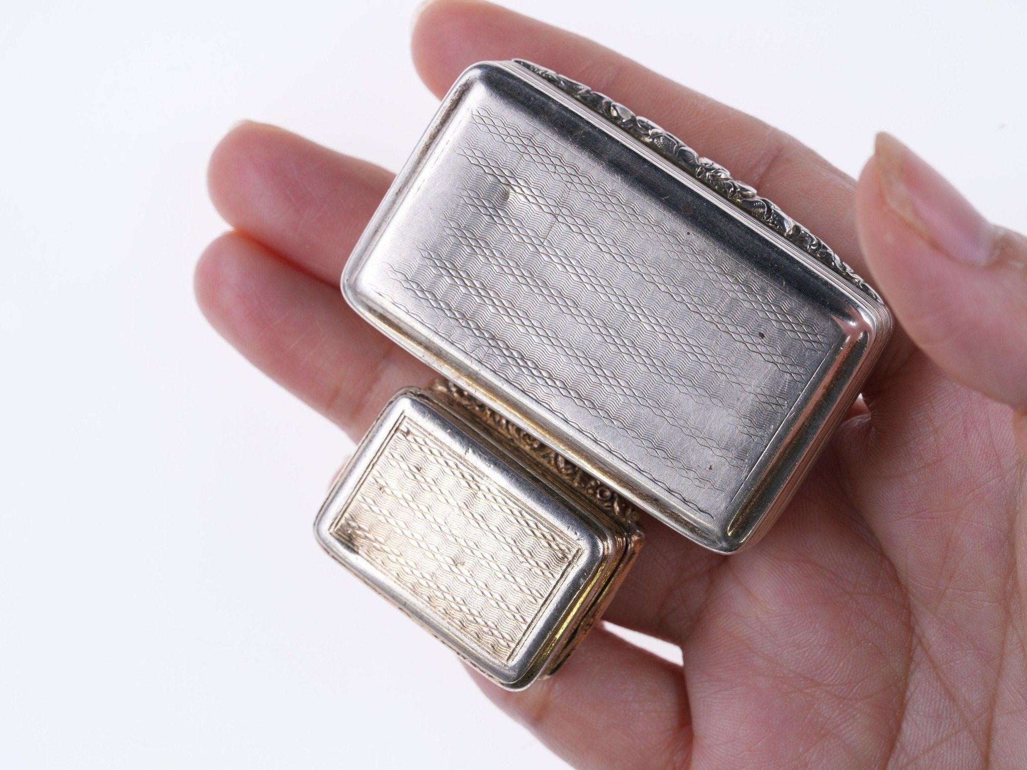 1832 年 Thomas Shaw 格鲁吉亚银鼻烟盒和油醋汁。最大的 2 1/8" x 1.25" x 0.5",油醋汁 1.25" x 7/8" x 0.4"。整体状况良好,铰链良好,闭合严密,有些人预计会有非常小的凹痕和整体磨损。两个都卖。