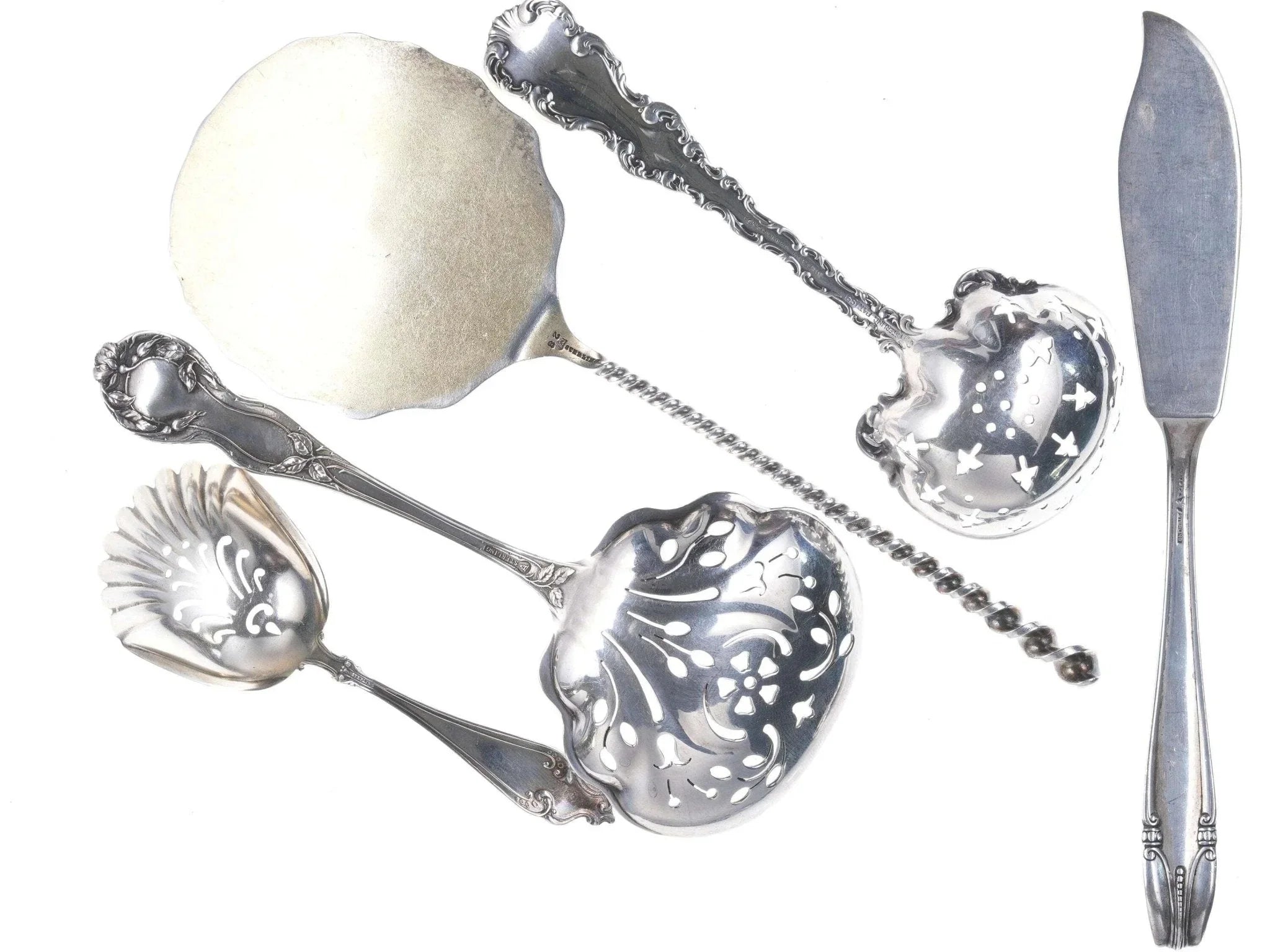 精美古董纯银收藏。出售所示批次,最大的是扭柄布里特切糕点服务器,长 7 7/8 英寸,宽 2.75 英寸,扁平服务器。总重182.4克。如图所示,有一些字母组​​合,但都是很棒的作品。