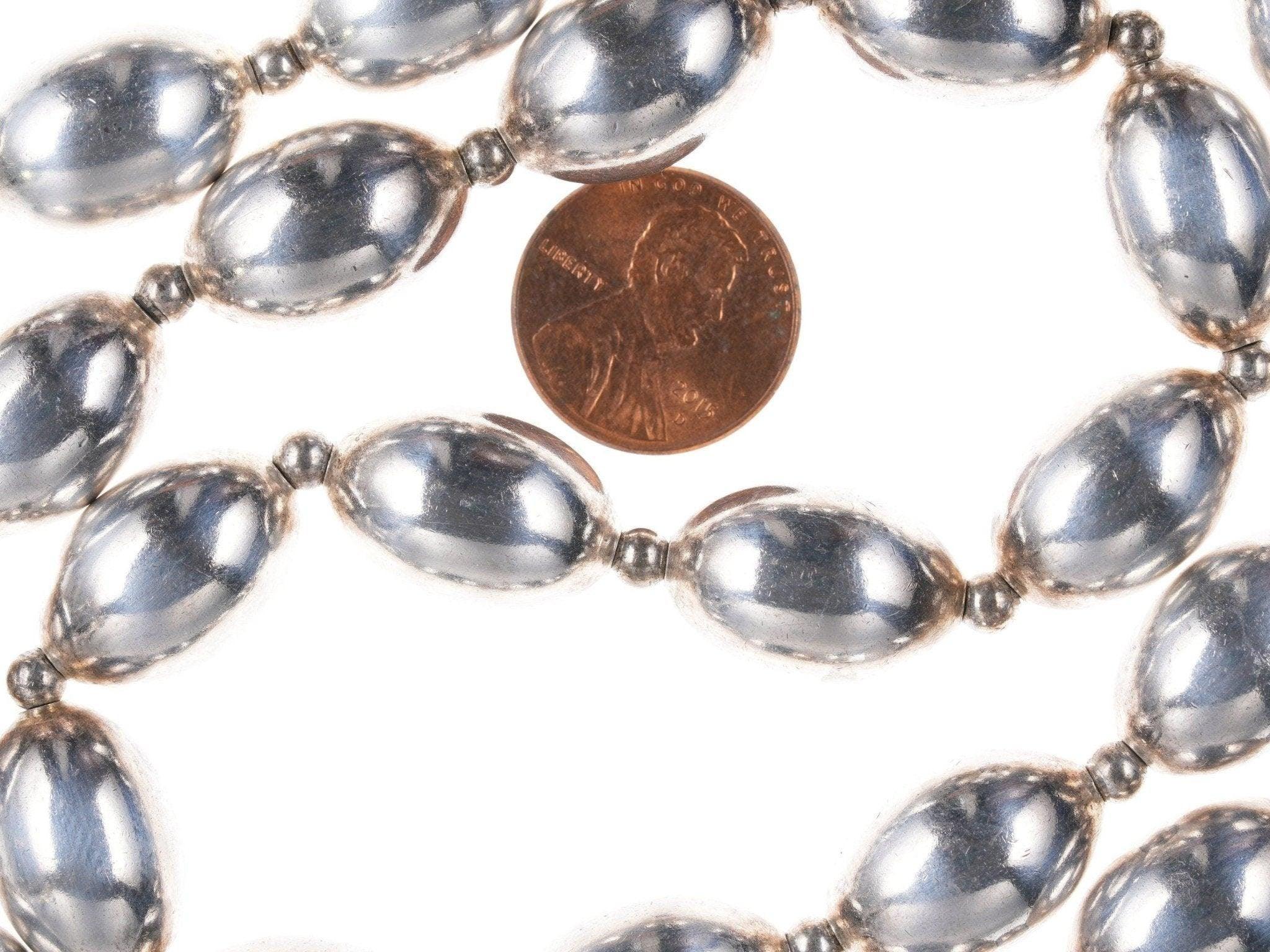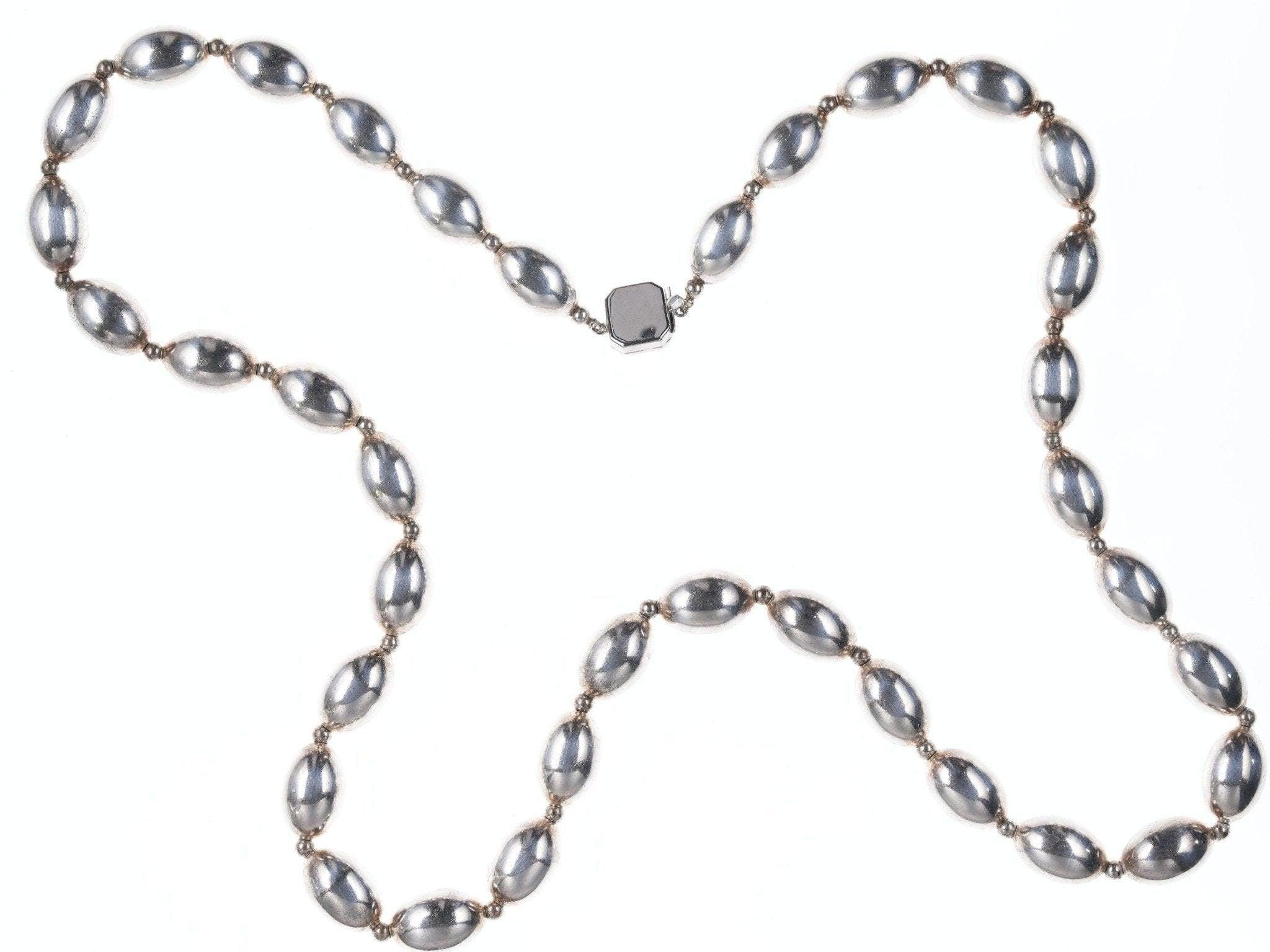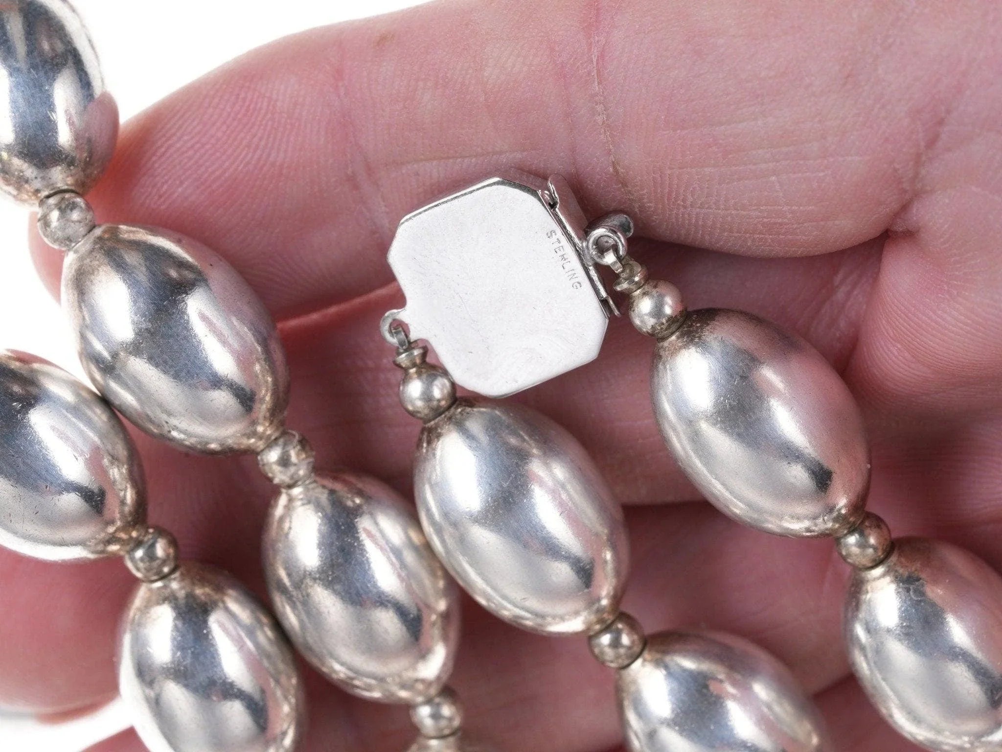 33 英寸长复古纯银串珠项链。经过测试并保证为纯银,珠子是空心的,但非常厚,总重量为 137.3 克。