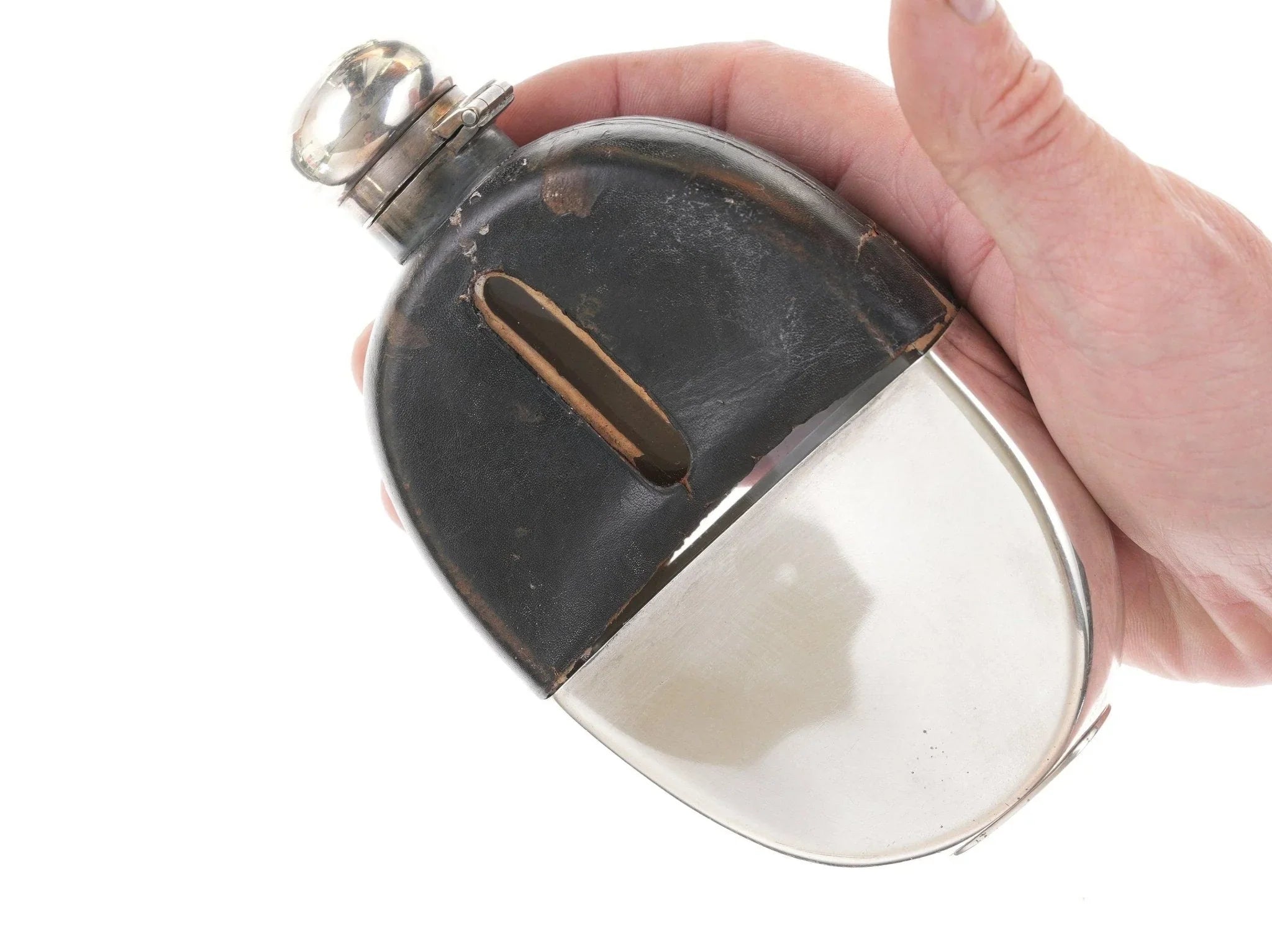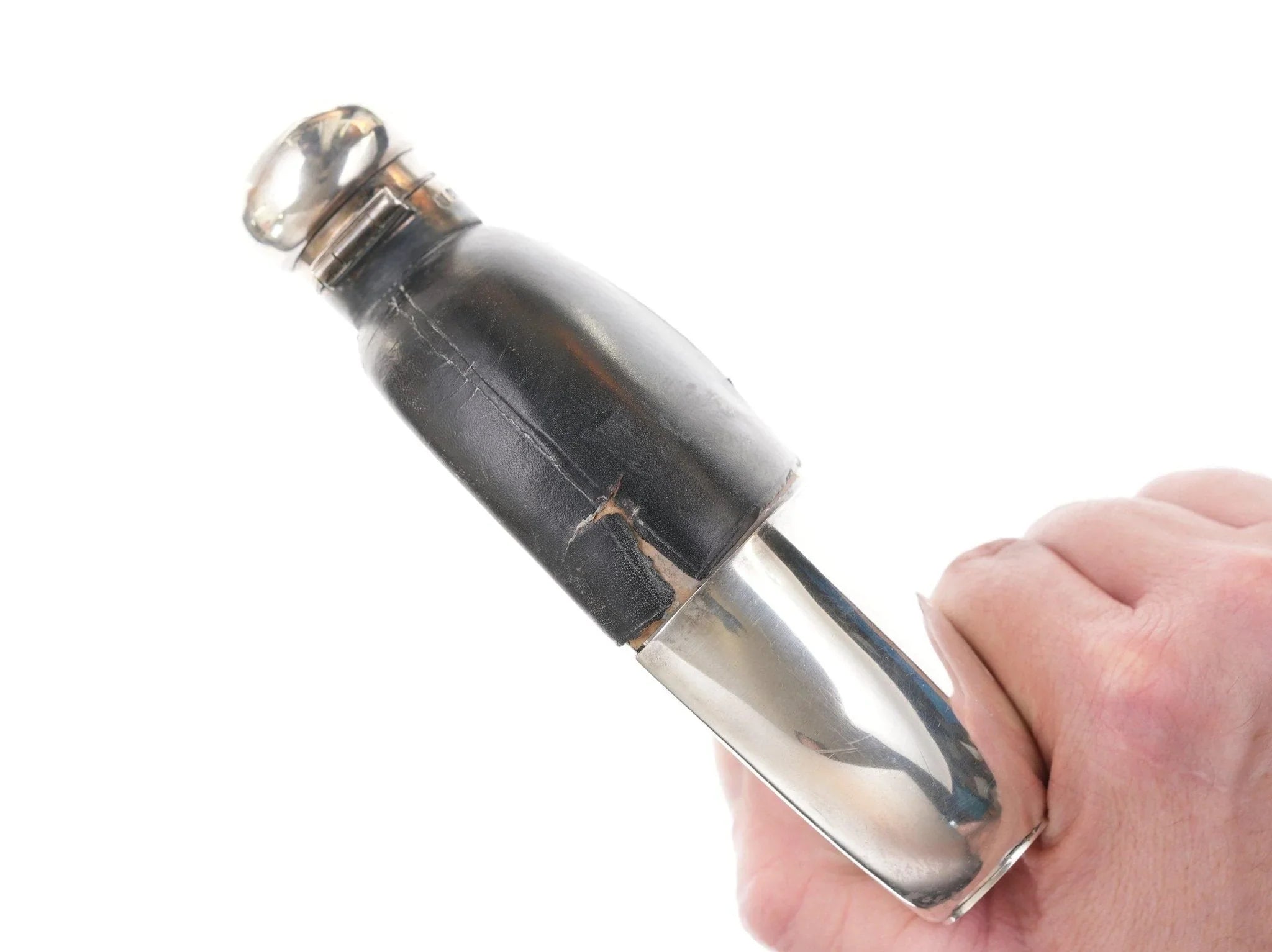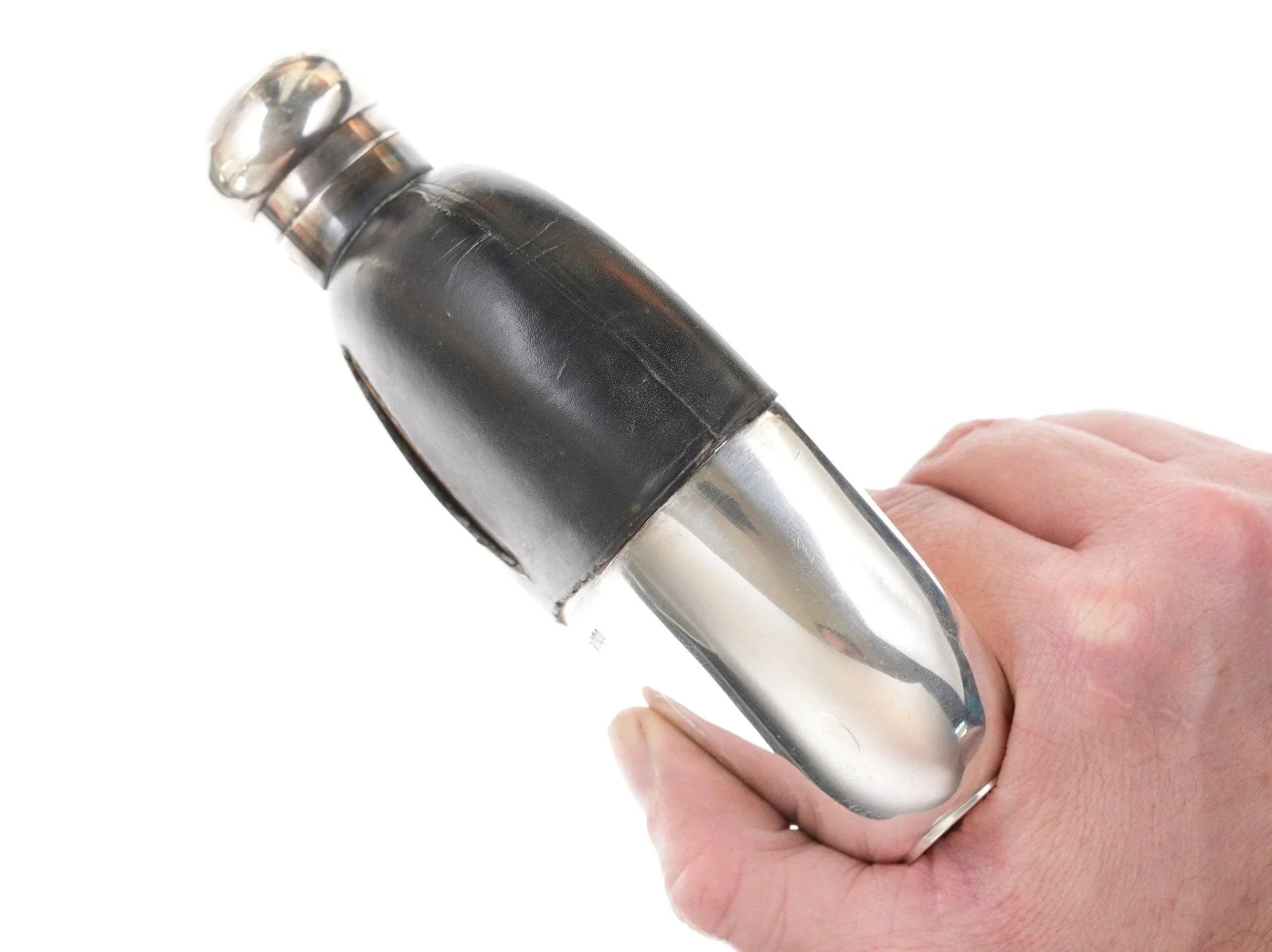 玻璃烧瓶上的古董纯银。高品质艺术玻璃,无损坏,购买所示的烧瓶,顶部有皮革盖。纯棉底部像手套一样合身,但可拆卸。