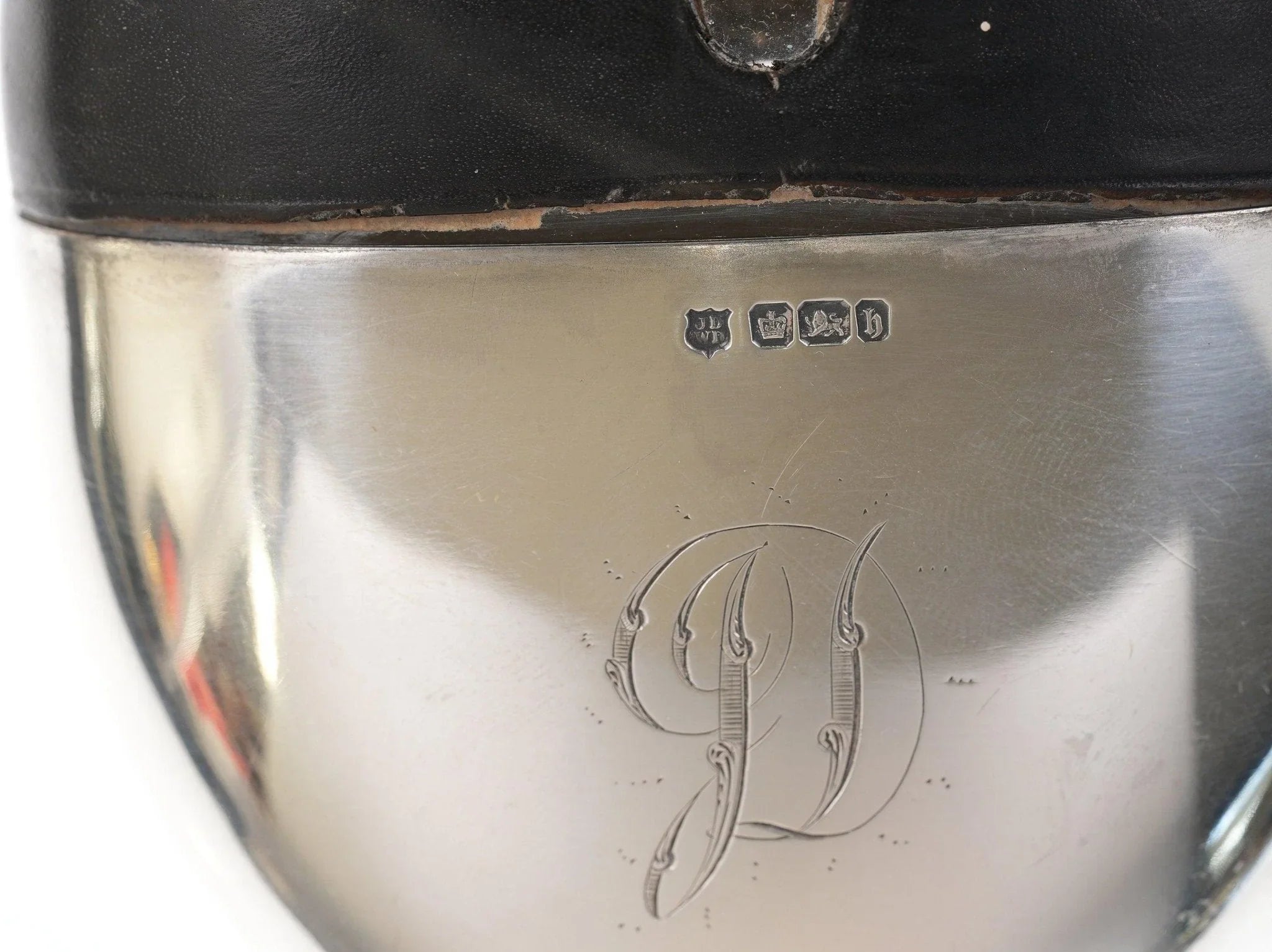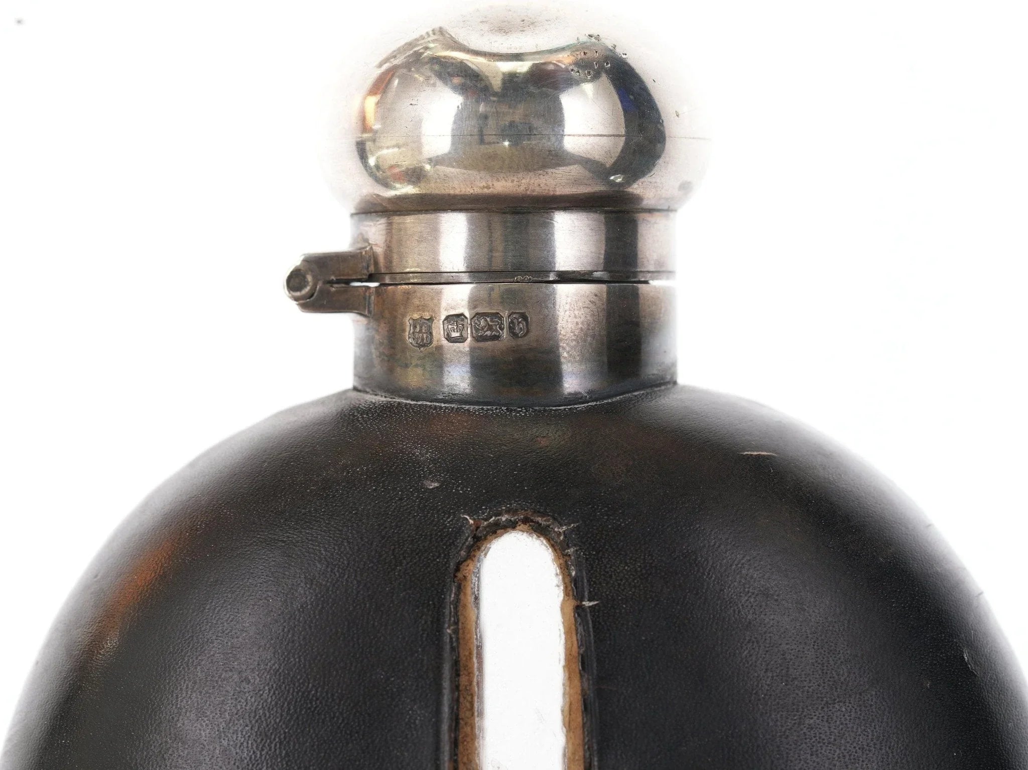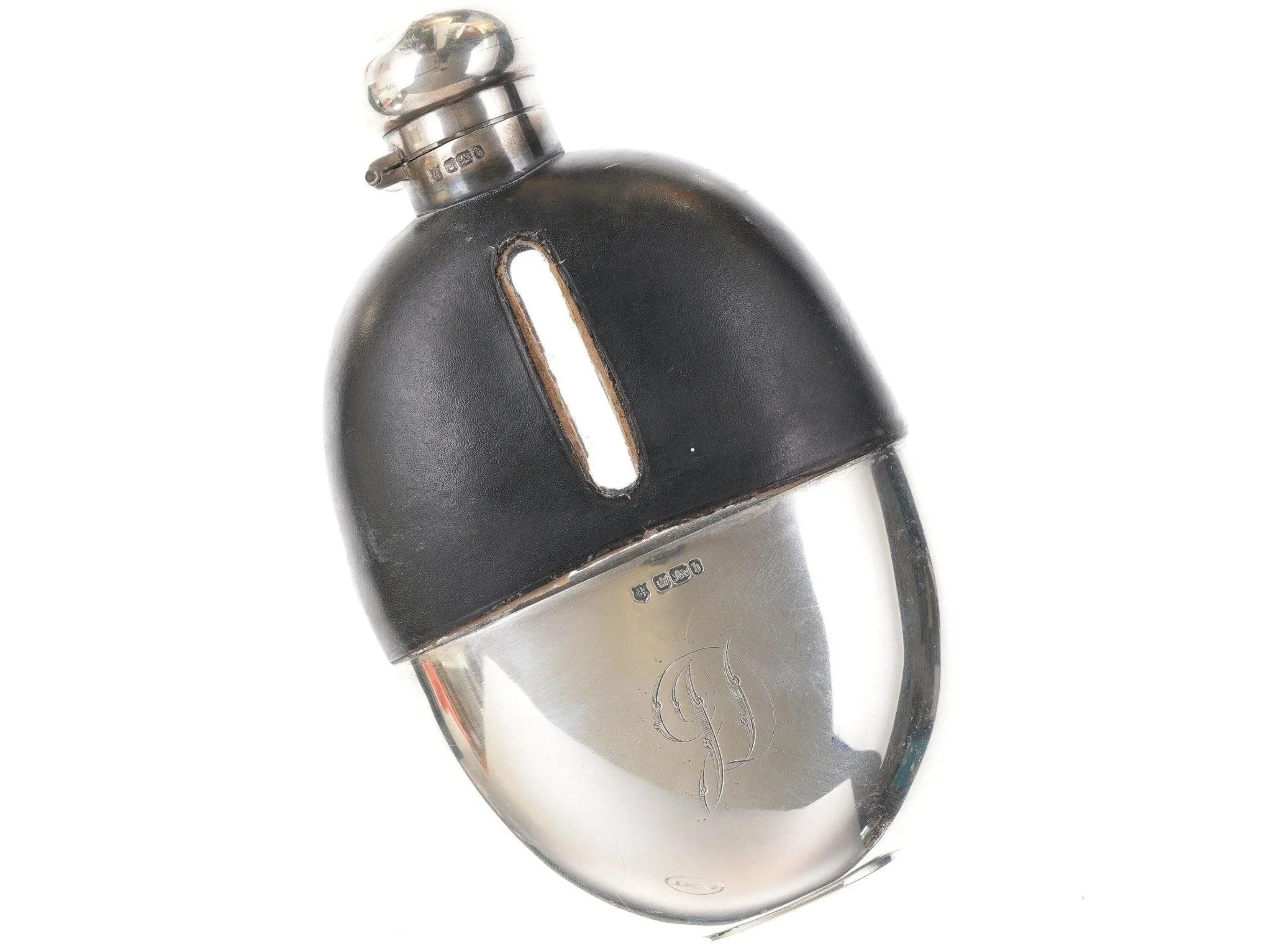 玻璃烧瓶上的古董纯银。高品质艺术玻璃,无损坏,购买所示的烧瓶,顶部有皮革盖。纯棉底部像手套一样合身,但可拆卸。