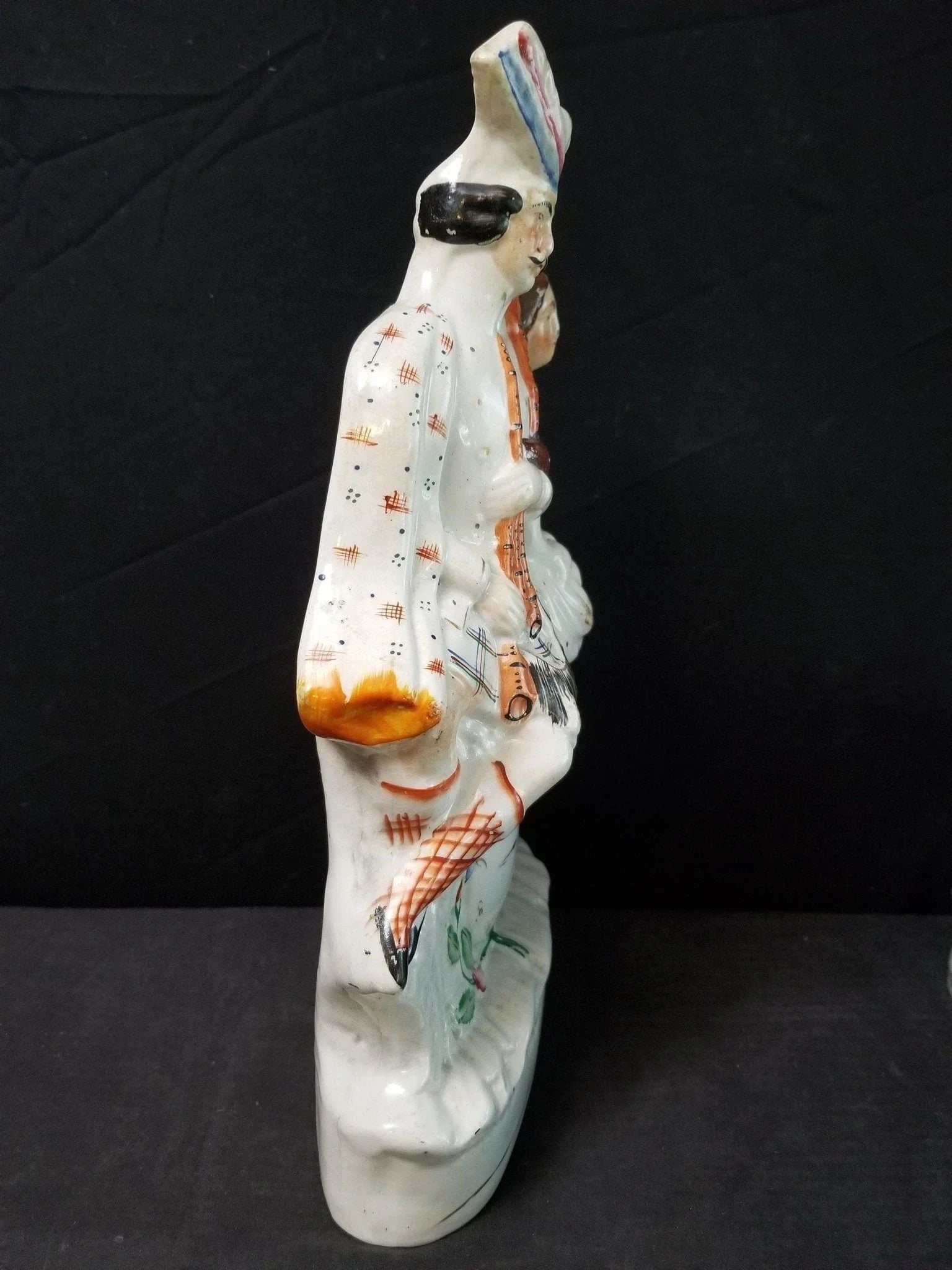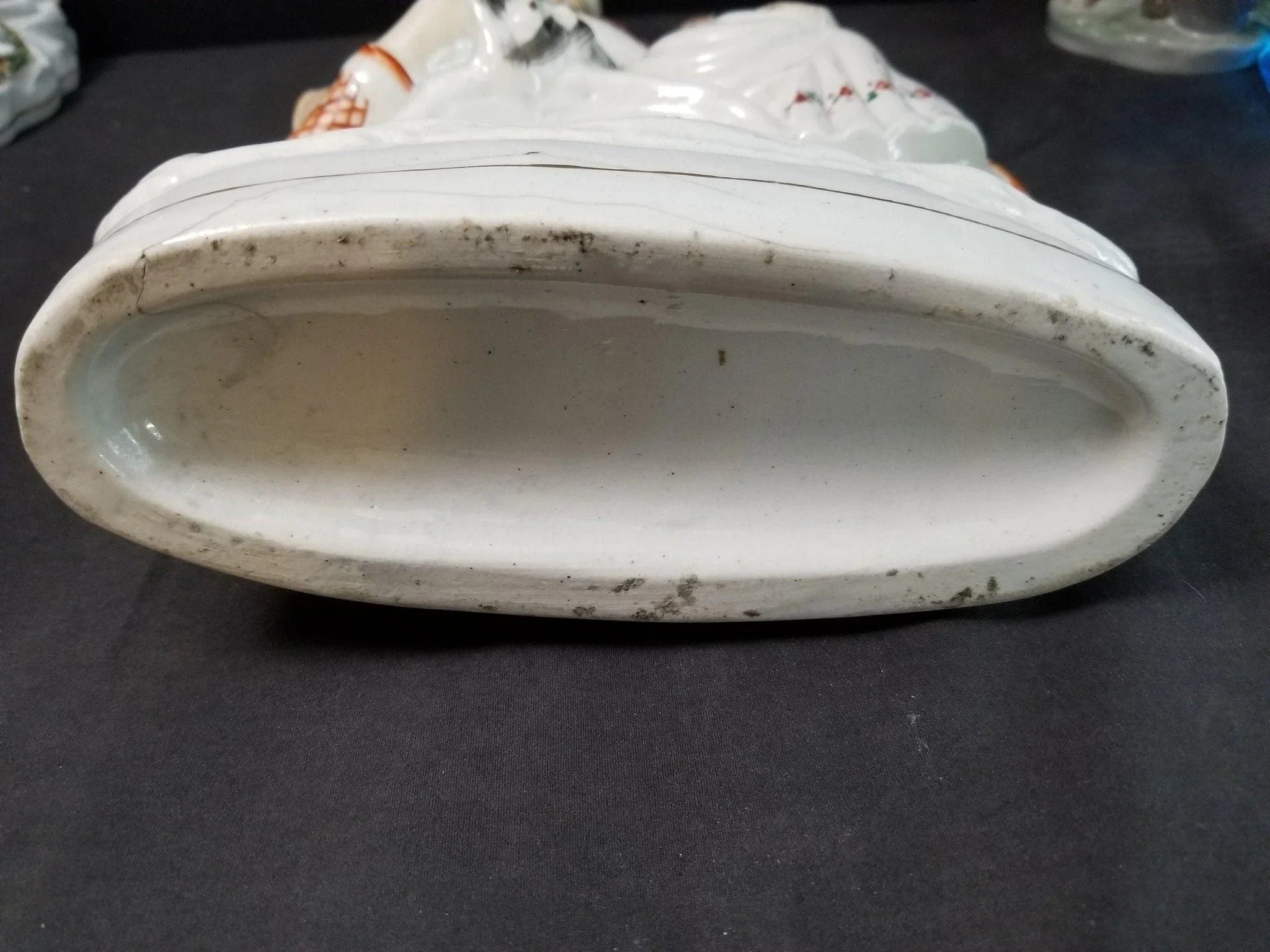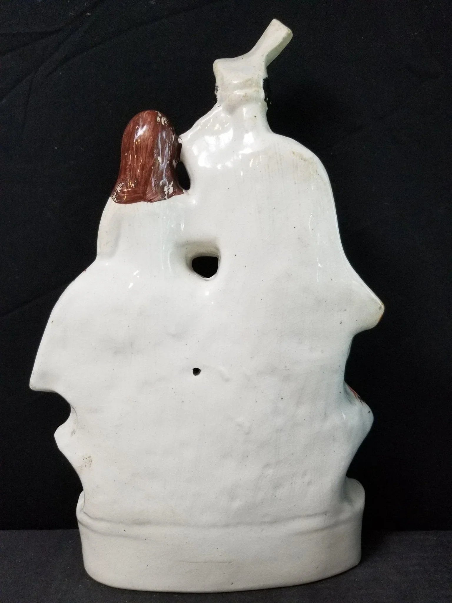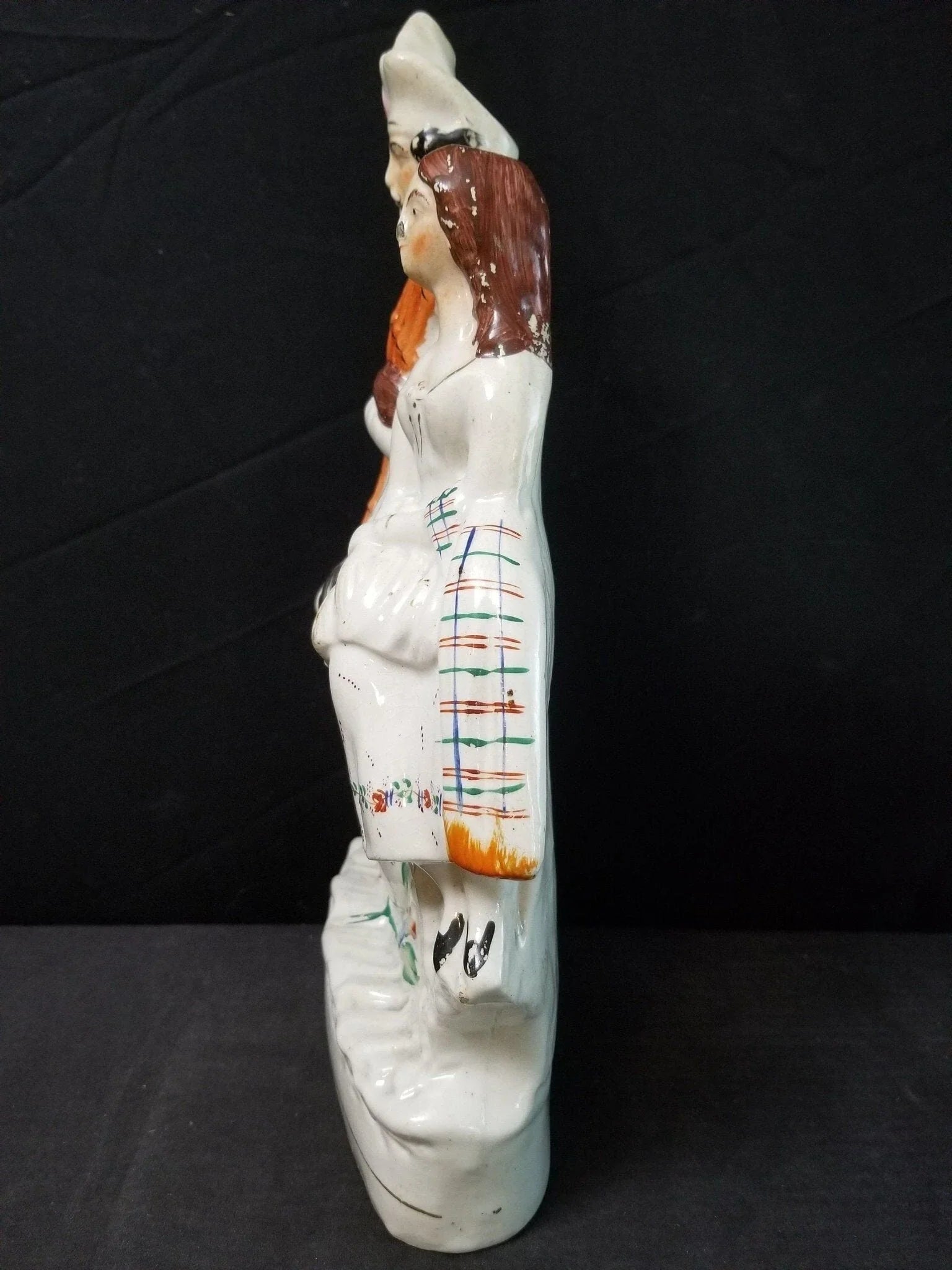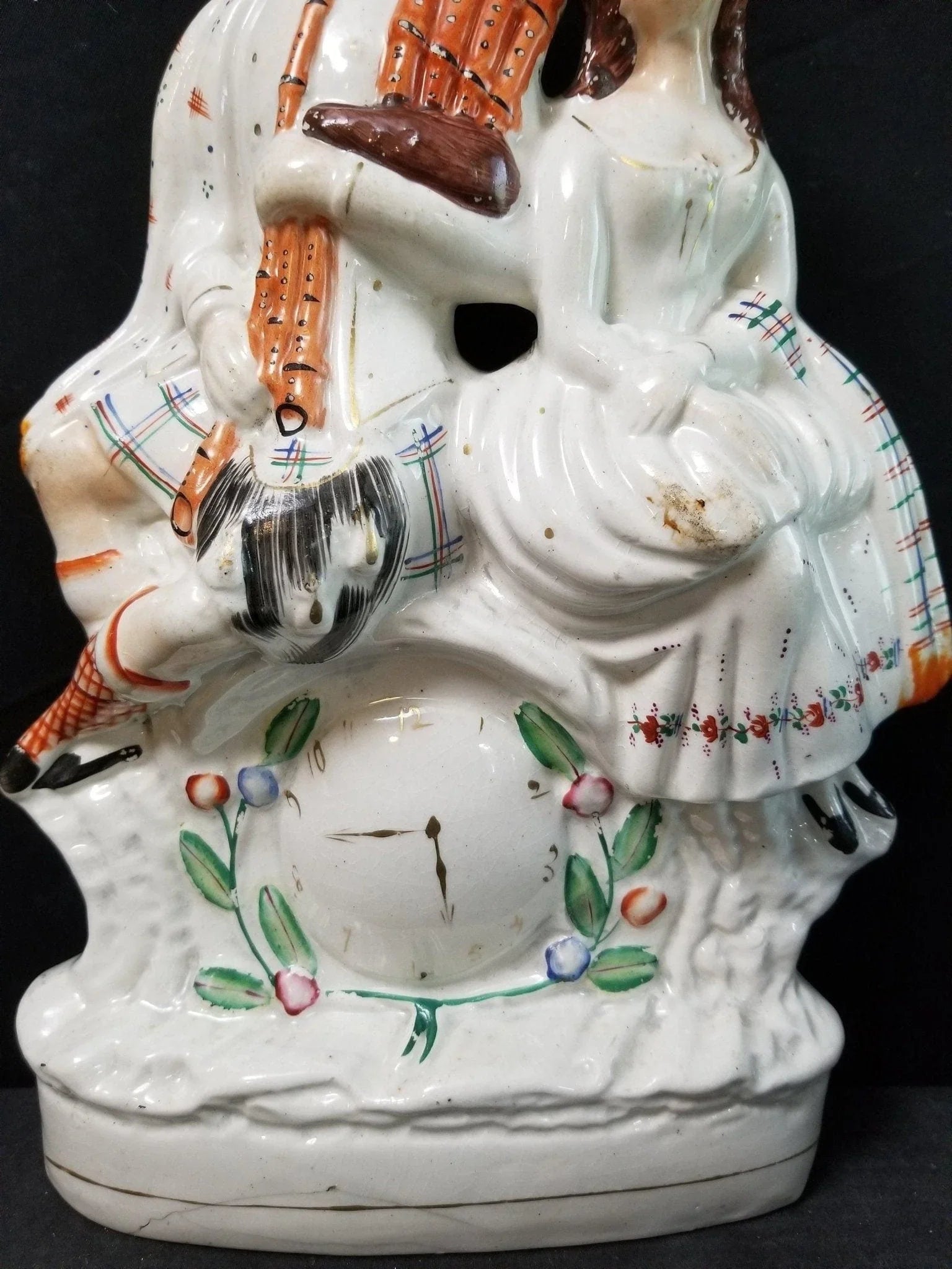 古董斯塔福德郡人物高地夫妇带时钟约 1870 年 14 英寸 x 9 英寸宽。底座附近有轻微的射击缺陷。除了前部底部有一条紧密的旧线(赋予它特色)之外,没有裂缝、缺口或修复,鼻子上有釉片。