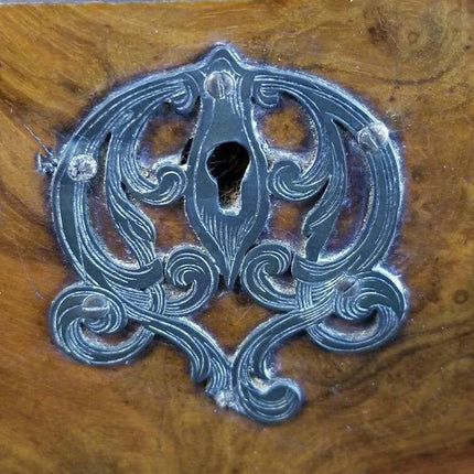古董瓷匾安装信箱秘书 c.1860。 9 3/8 英寸宽 x 6 3/8 英寸高 x 4.75 英寸深。令人难以置信的作品,牌匾完全是手绘的,安装是手工雕刻的。小件是锁周围的黄铜装饰缺失。对饰面有轻微损坏,仅严重损坏位置显示在顶角。