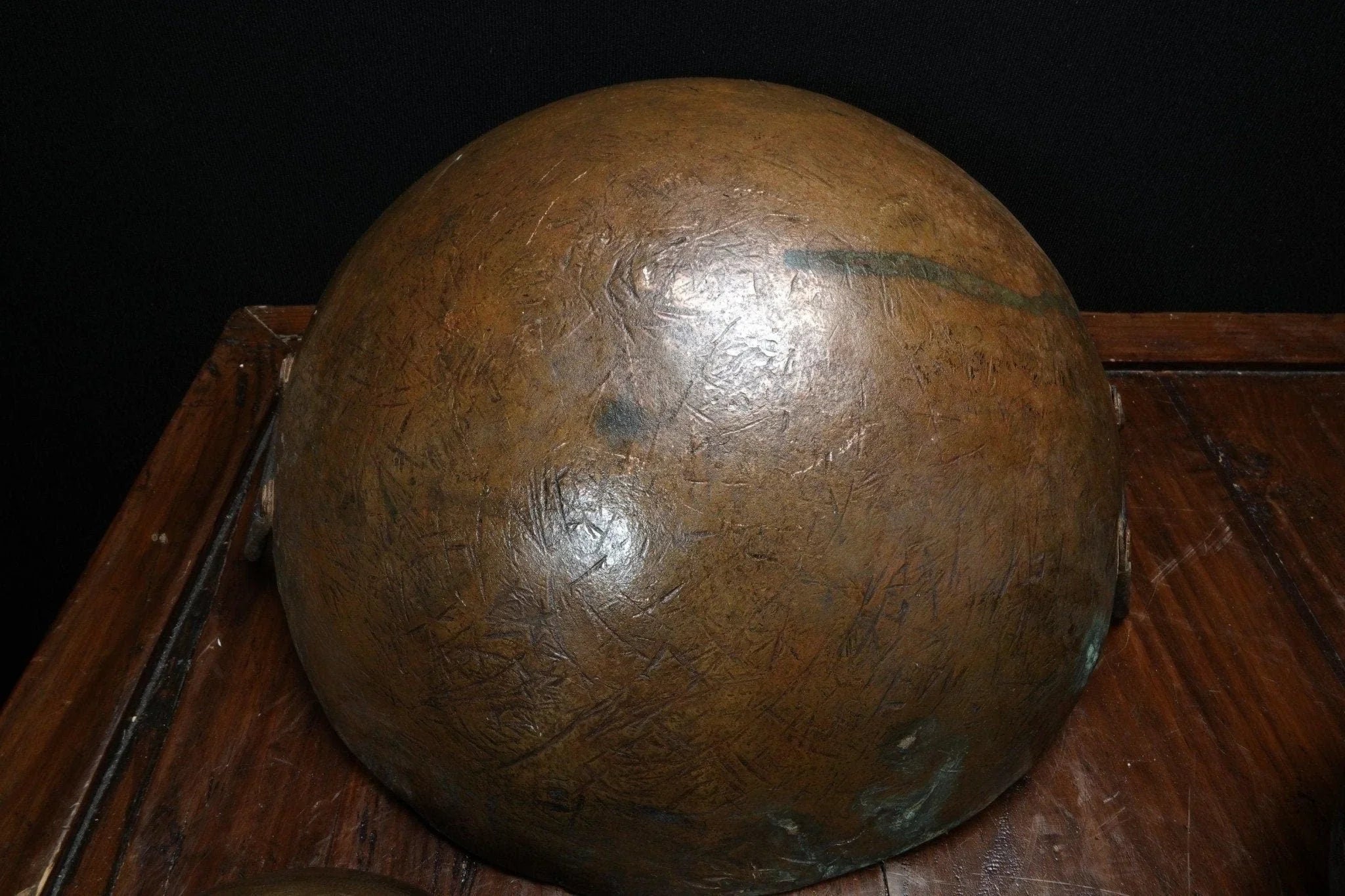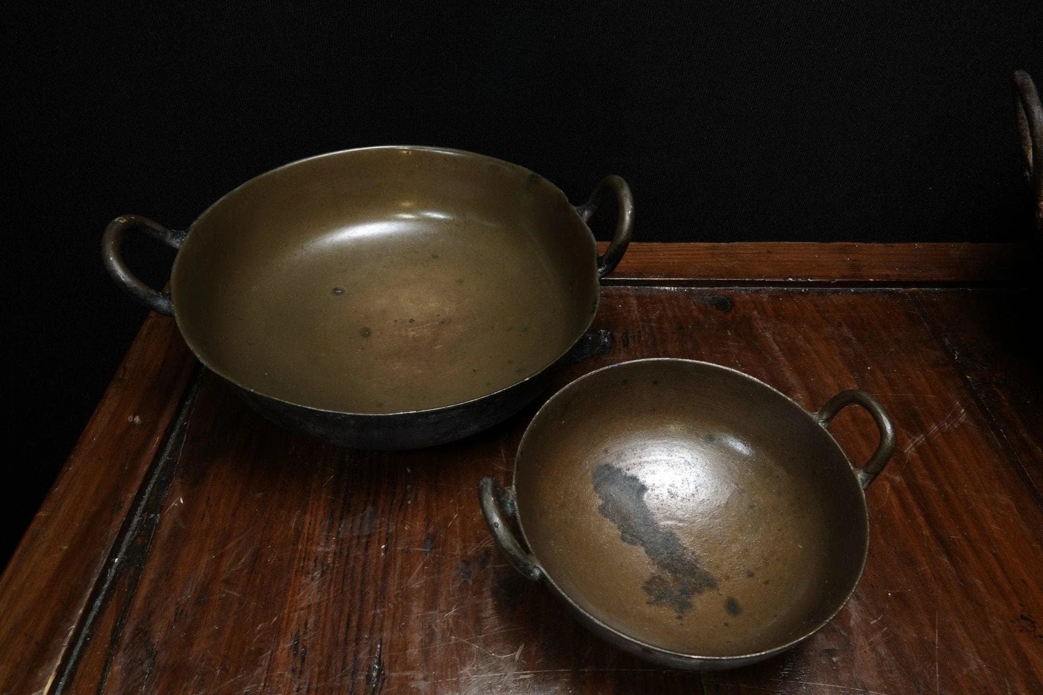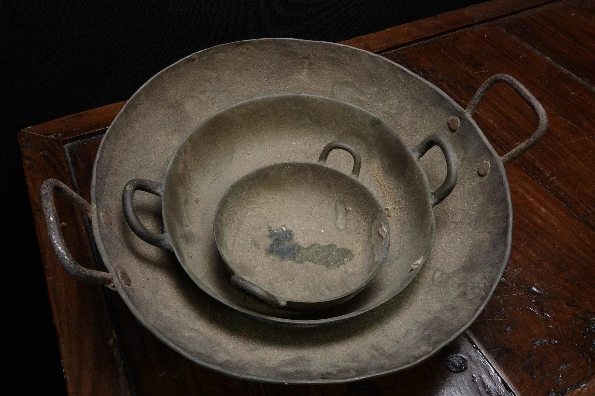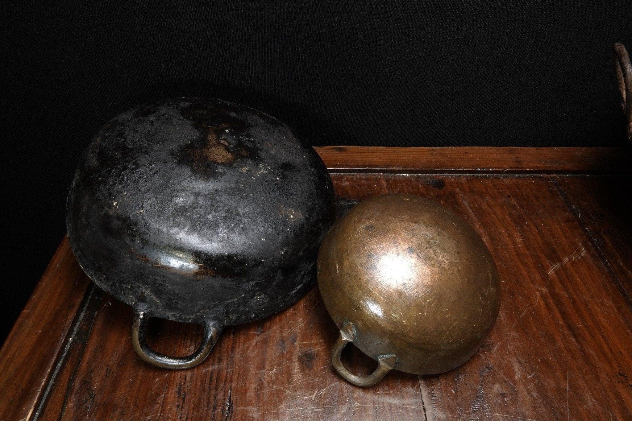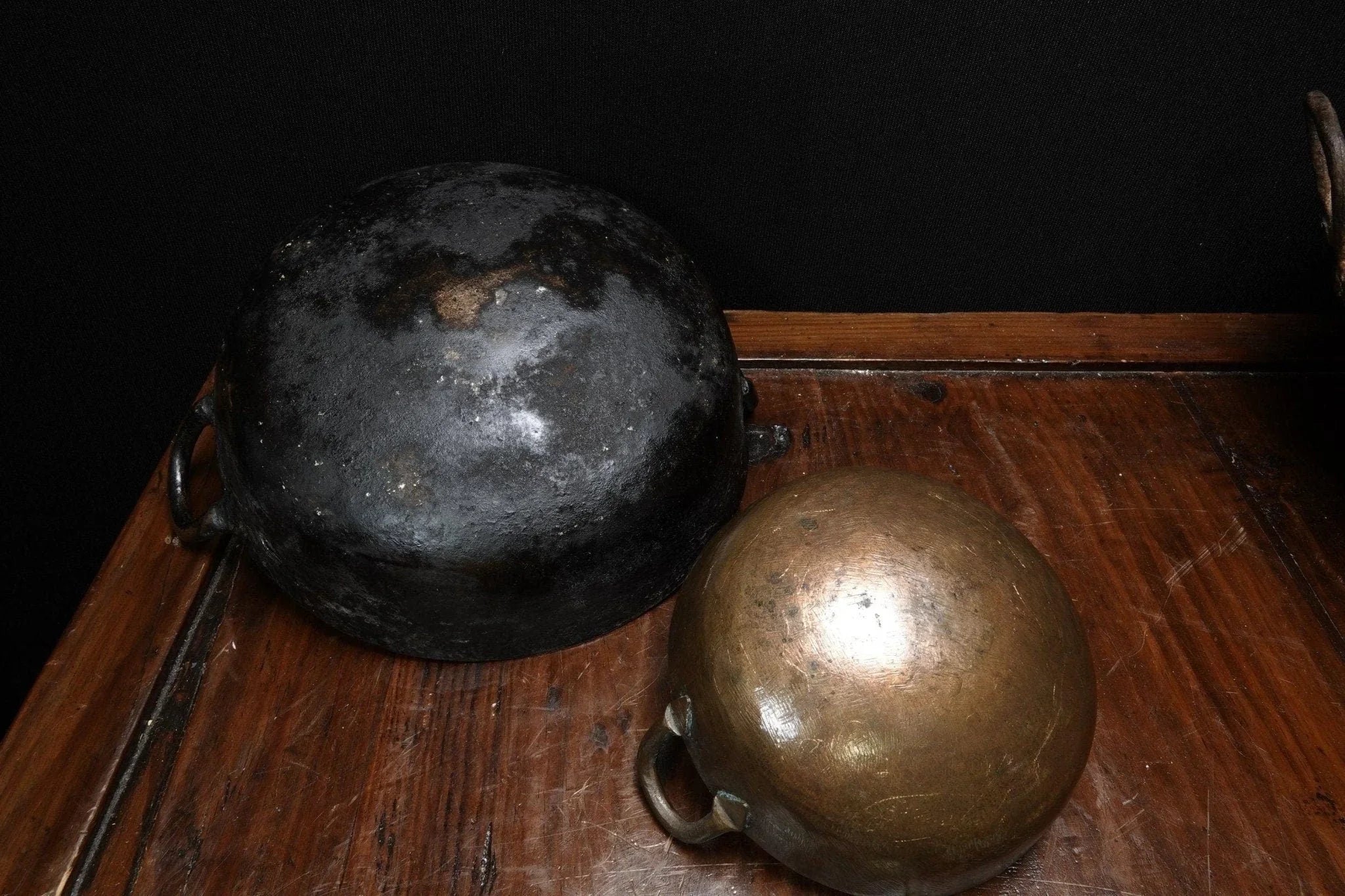 17-18 世纪毛皮贸易时代青铜手柄刻度水壶炒锅风格糖果罐。这些都是非常早期的罐子。它们是非常重的铜/青铜合金,我不相信它们是实心铜。它们很厚且不可延展。最大的是 10.5 英寸(无把手),中间 7.5 英寸(无把手),最小的是 4.75 英寸(无把手)。它们总共重 6 磅 11 盎司。最后一张照片是它们被发现的过程。我所做的就是轻轻地清洁、加热并涂上橄榄油。