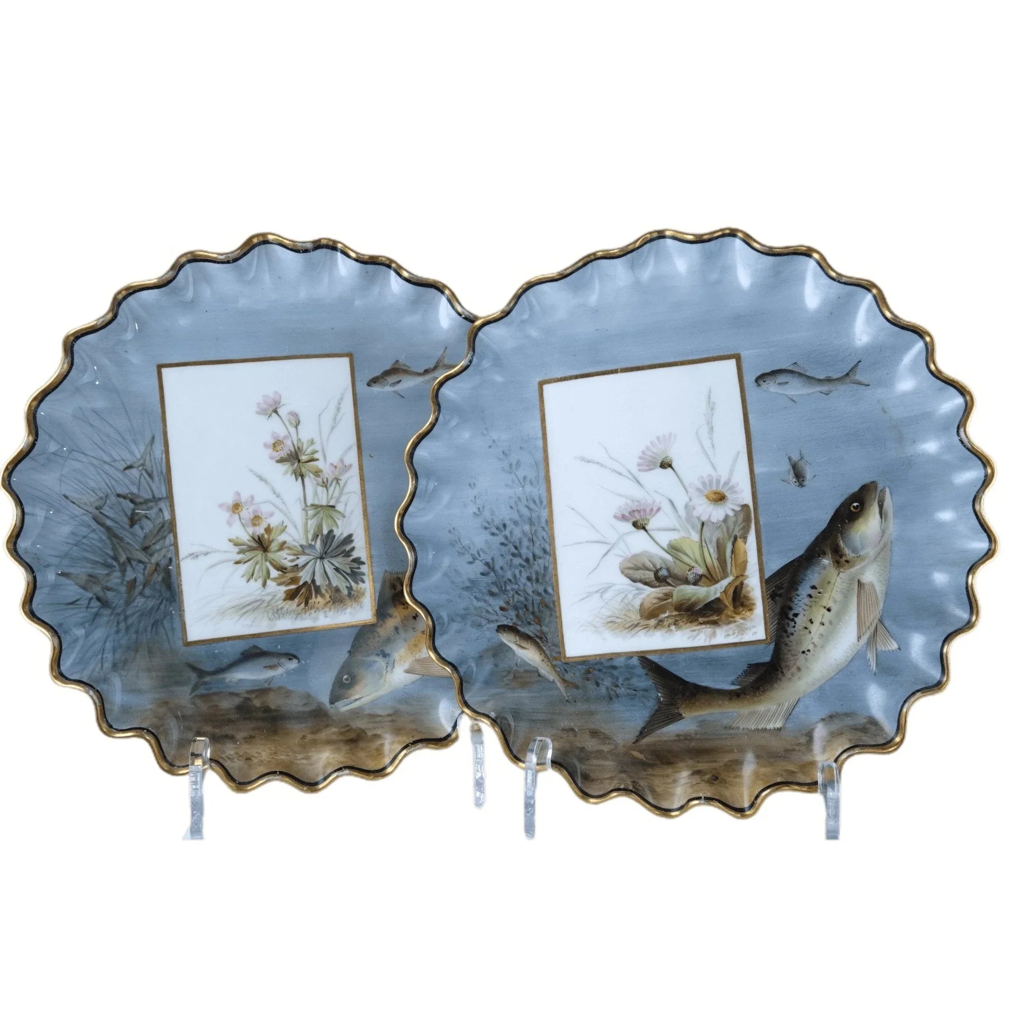 约 1890 年西奥多·B·斯塔尔 (Theodore B Starr) 纽约一对手绘鱼尾板,带褶边边缘,由英国乔治·琼斯 (George Jones England) 设计。 8 7/8 英寸宽,没有裂纹、缺口或修复,镀金有轻微磨损和一些划痕,总体来说很棒。