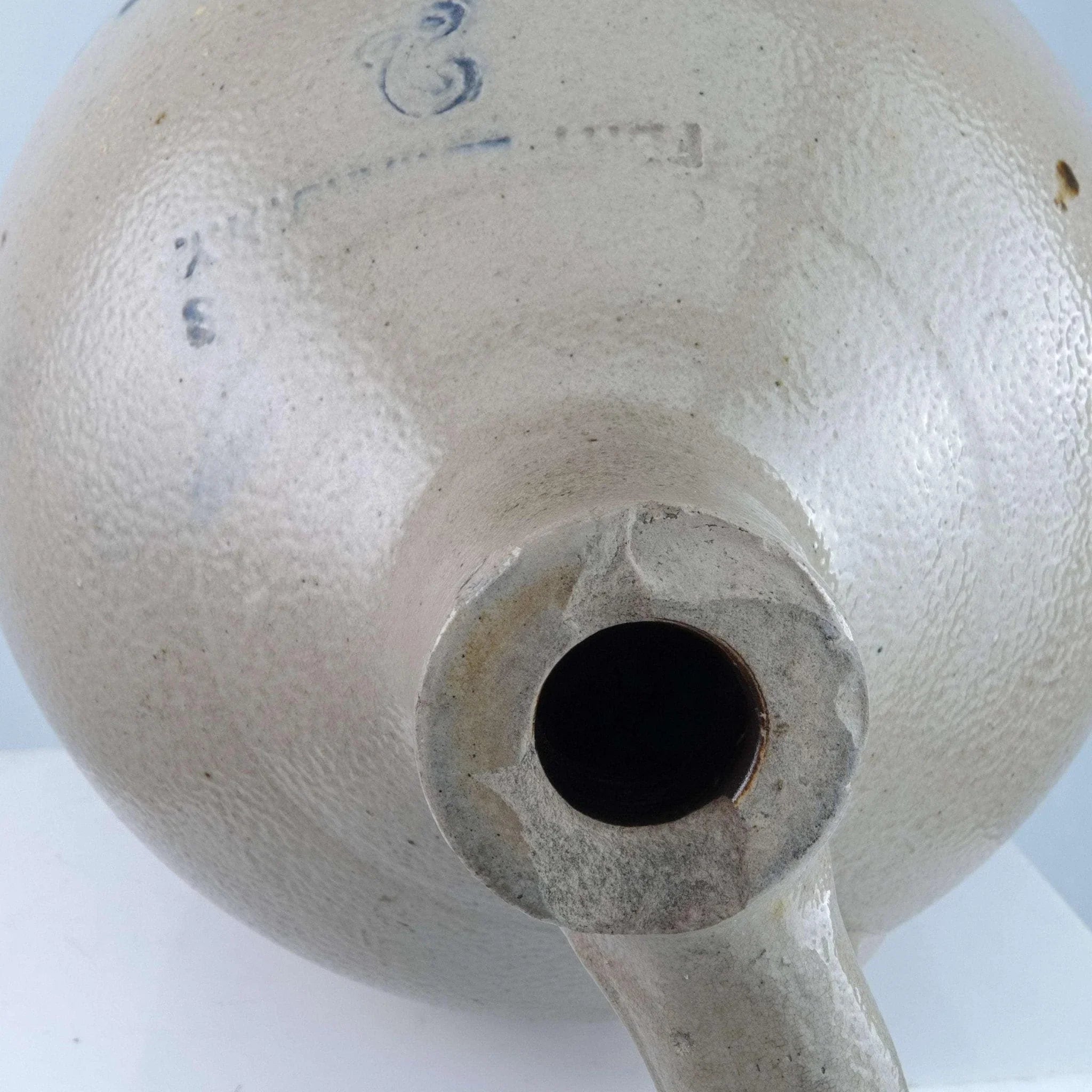 美国盐釉粗陶壶,褪色邮票 NY Stoneware Co.,爱德华堡,纽约,19 世纪,带有 O'Neil & Co.(约翰·奥尼尔,白厅,纽约)的钴釉广告,边缘有碎片,壶嘴,以及第二张图片中所示侧面的一小块釉片(不会穿透罐子),大约 14 英寸高,9.5 磅 **来源:O'Neill-Leonard Antiques,Westlake Hills,德克萨斯州