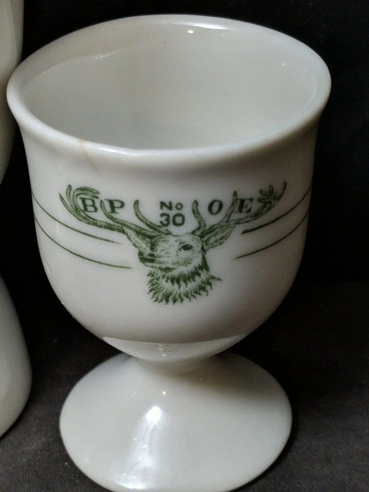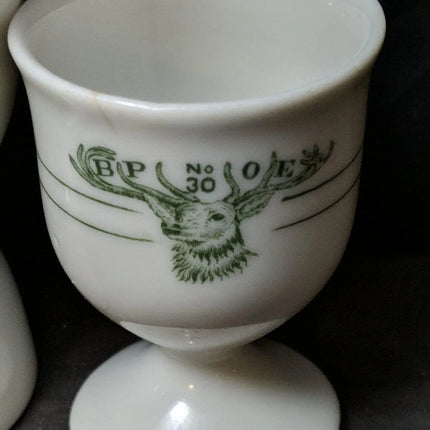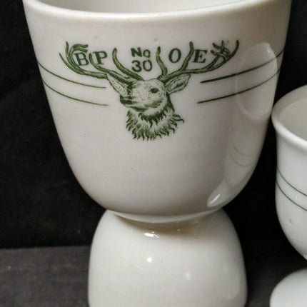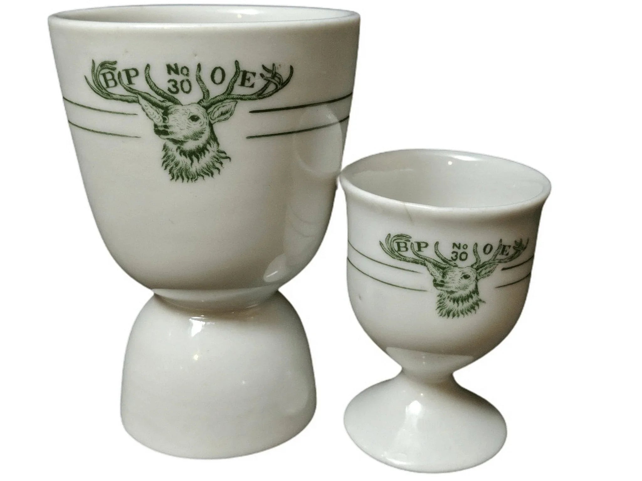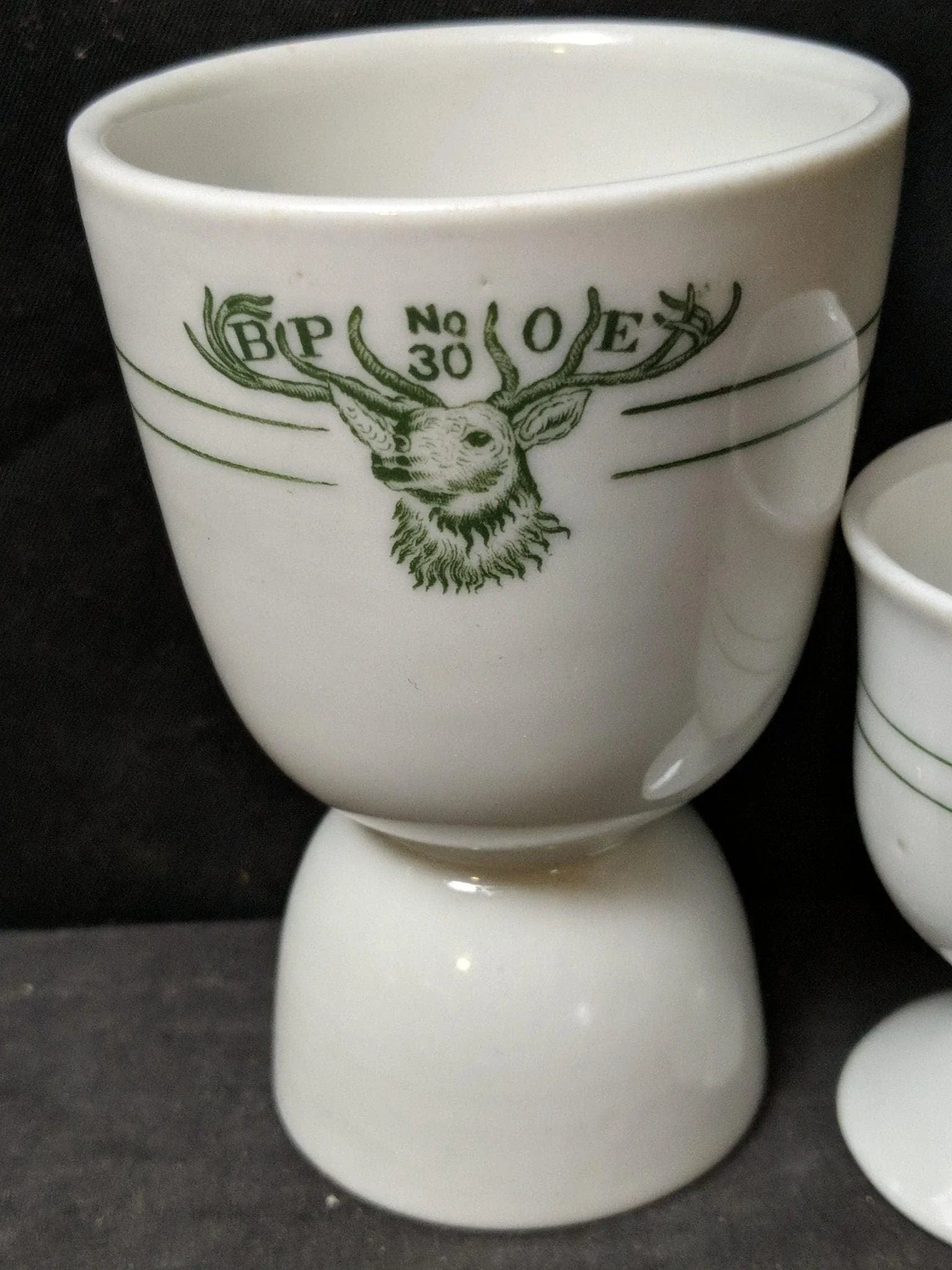 BPOE No 30 New Orleans Elk Lodge restaurant China Egg Cups early 20th century,<br>very uncommon. Small one shows a short hairline on exterior that doesn't go<br>through to interior. So it's really just stained crazing. No other issues.<br>Selling both.