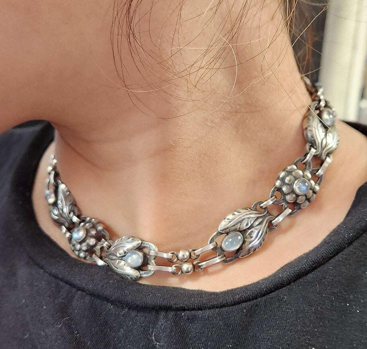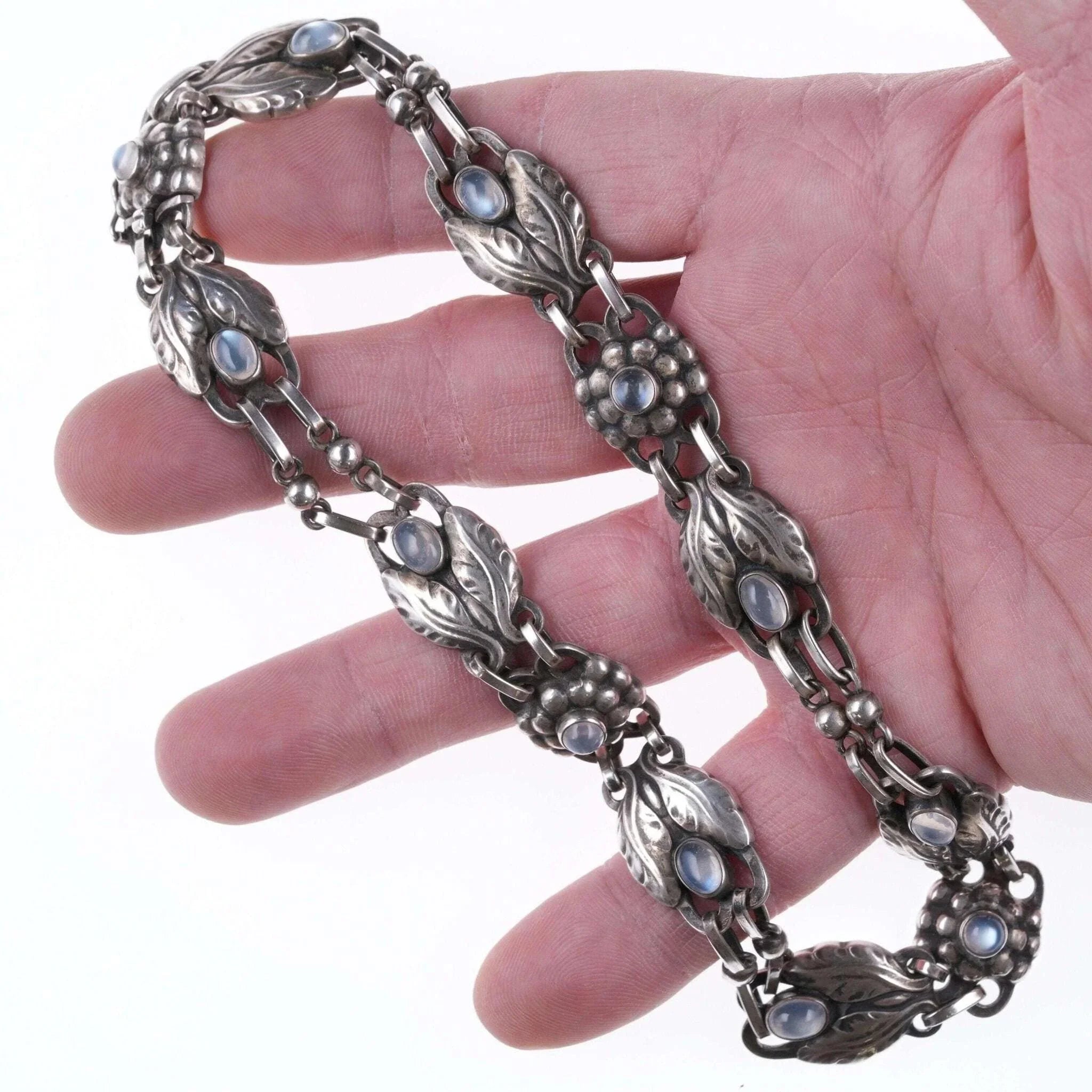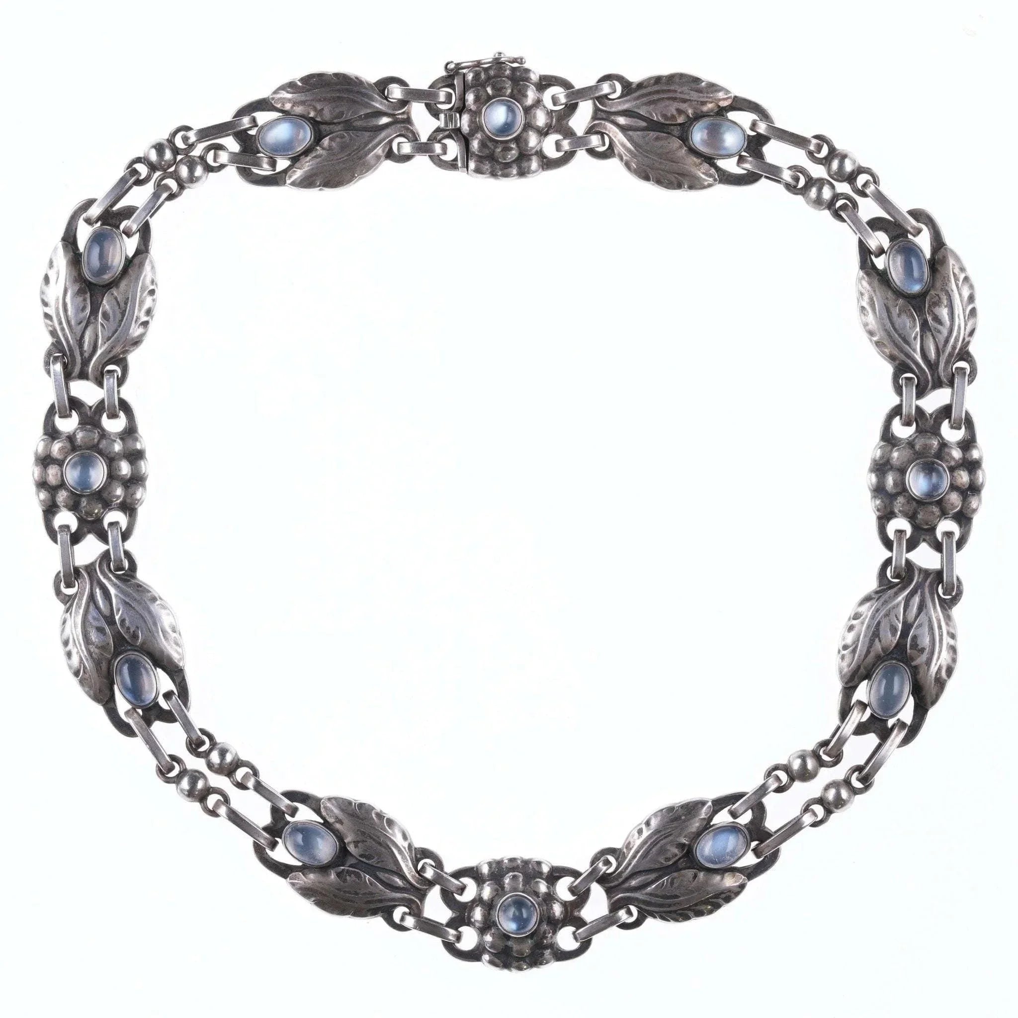 14.25" Georg Jensen Art Deco Sterling and moonstone Choker necklace. 14.25" long<br>closed x 5/8" wide x 48.4 grams. No issues whatsoever, pictured on a 12" neck.<br><br>Georg Jensen, (born August 31, 1866, Raadvad, Denmark—died October 2, 1935,<br>Copenhagen), Danish silversmith and designer who achieved international<br>prominence for his commercial application of modern metal design. The simple<br>elegance of his works and their emphasis on fine craftsmanship, hallmarks of<br>Jensen’s products, are recognized around the world.<br><br>Jensen was apprenticed to a goldsmith at age 14. His artistic talents were<br>briefly focused on sculpture, but he returned to metalwork, primarily jewelry<br>and silver pieces, produced in the workshop he opened in Copenhagen in 1904.<br>Jensen exhibited his works at several major foreign exhibitions (winning a gold<br>medal at the Brussels Exhibition of 1910) and quickly built a reputation as an<br>outstanding and highly original silversmith. He moved to a larger workshop in<br>1912 and acquired his first factory building in 1919.<br><br>Jensen’s silverware achieved immediate popularity and commercial success. He<br>was, in fact, the first silver maker to realize a profit from the manufacture of<br>modern silver. Until Jensen’s time virtually all successful silverware producers<br>had relied on a standard repertory of popular traditional designs. Jensen,<br>however, found that the market for his sleek, simple pieces was larger than<br>anyone had predicted. His firm grew rapidly, expanding throughout Europe and<br>opening branches in London and New York City. On both continents Jensen’s work<br>set trends for contemporary tableware. He was among the first designers to<br>fashion steel—formerly considered fit only for low-quality, inexpensive<br>flatware—into handsome, serviceable cutlery.
