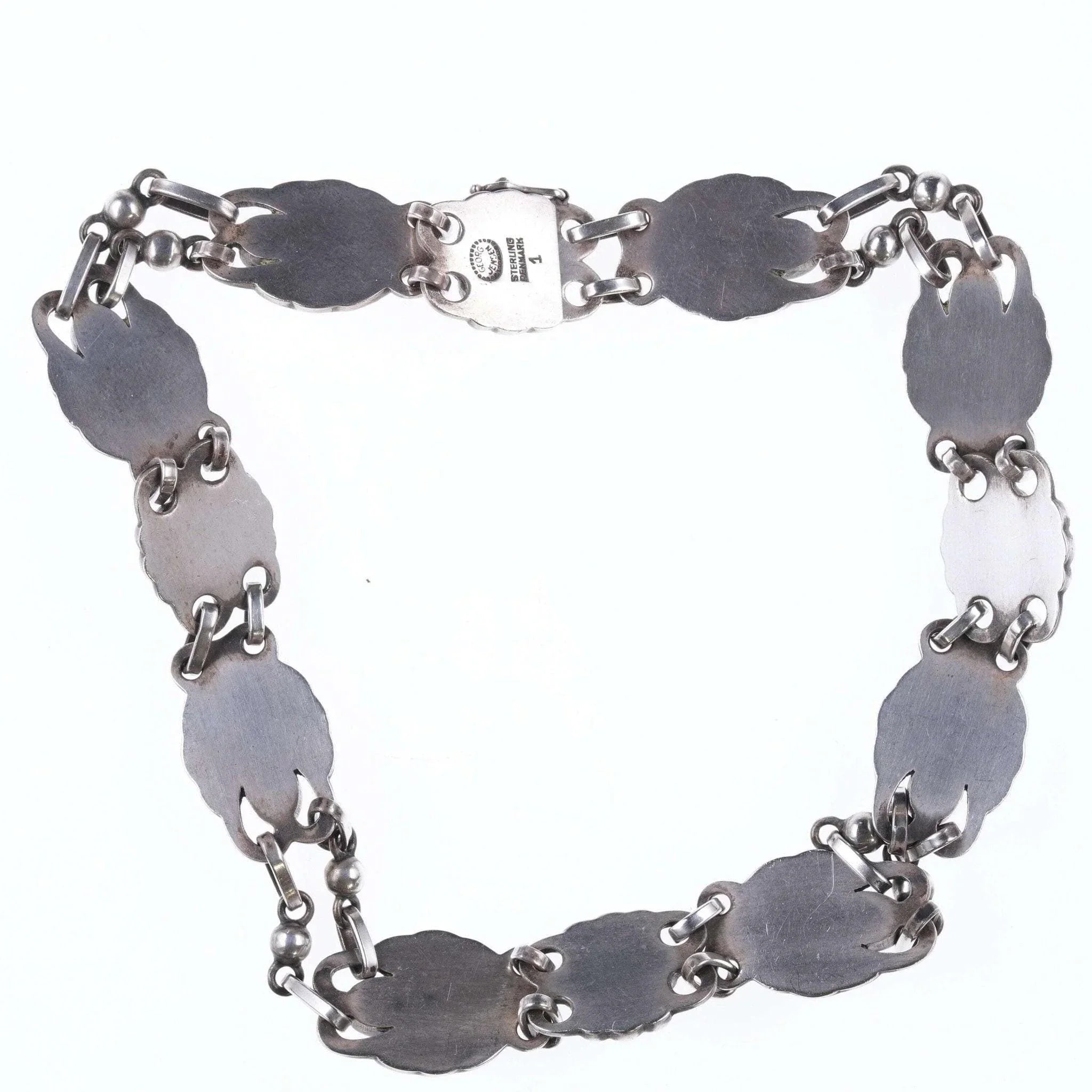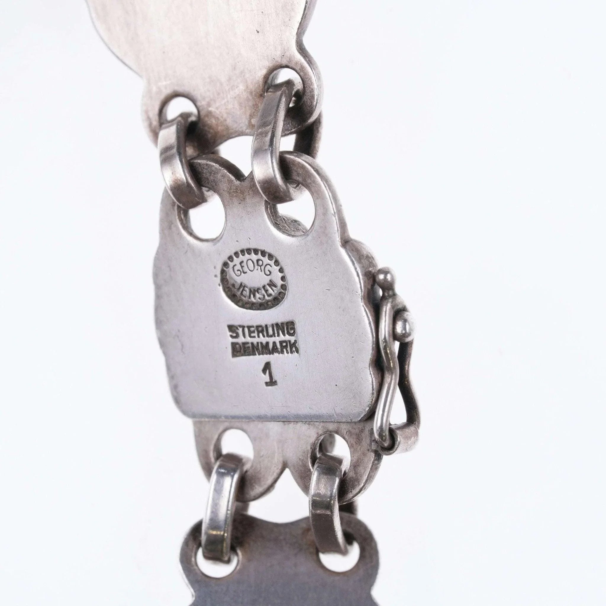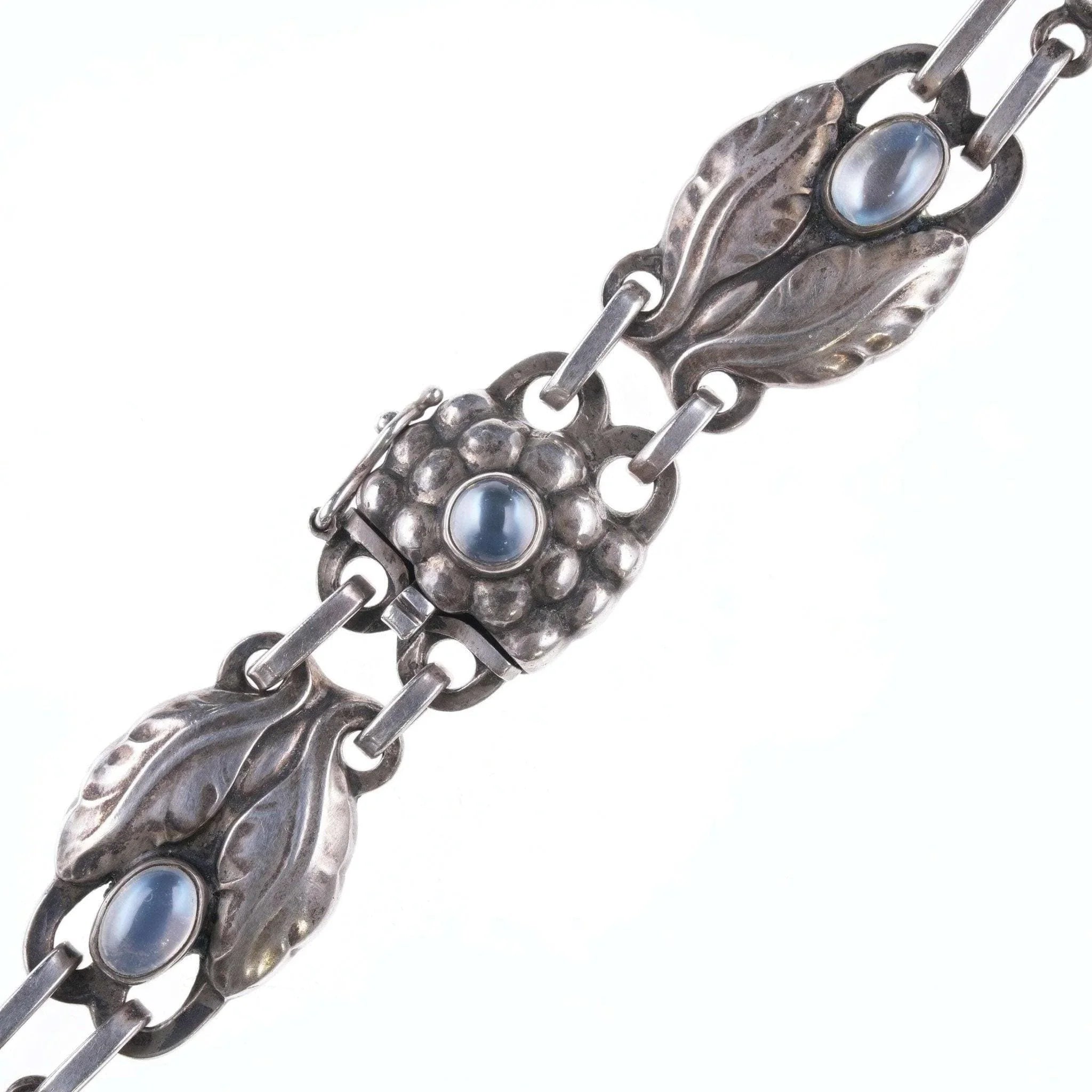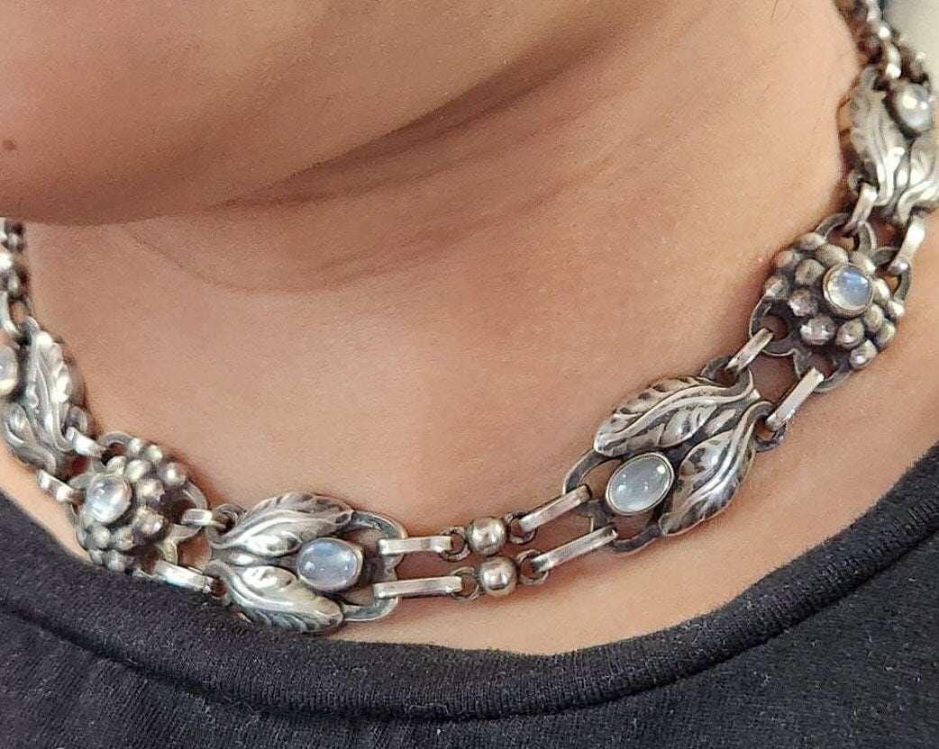 14.25" Georg Jensen Art Deco Sterling and moonstone Choker necklace. 14.25" long<br>closed x 5/8" wide x 48.4 grams. No issues whatsoever, pictured on a 12" neck.<br><br>Georg Jensen, (born August 31, 1866, Raadvad, Denmark—died October 2, 1935,<br>Copenhagen), Danish silversmith and designer who achieved international<br>prominence for his commercial application of modern metal design. The simple<br>elegance of his works and their emphasis on fine craftsmanship, hallmarks of<br>Jensen’s products, are recognized around the world.<br><br>Jensen was apprenticed to a goldsmith at age 14. His artistic talents were<br>briefly focused on sculpture, but he returned to metalwork, primarily jewelry<br>and silver pieces, produced in the workshop he opened in Copenhagen in 1904.<br>Jensen exhibited his works at several major foreign exhibitions (winning a gold<br>medal at the Brussels Exhibition of 1910) and quickly built a reputation as an<br>outstanding and highly original silversmith. He moved to a larger workshop in<br>1912 and acquired his first factory building in 1919.<br><br>Jensen’s silverware achieved immediate popularity and commercial success. He<br>was, in fact, the first silver maker to realize a profit from the manufacture of<br>modern silver. Until Jensen’s time virtually all successful silverware producers<br>had relied on a standard repertory of popular traditional designs. Jensen,<br>however, found that the market for his sleek, simple pieces was larger than<br>anyone had predicted. His firm grew rapidly, expanding throughout Europe and<br>opening branches in London and New York City. On both continents Jensen’s work<br>set trends for contemporary tableware. He was among the first designers to<br>fashion steel—formerly considered fit only for low-quality, inexpensive<br>flatware—into handsome, serviceable cutlery.