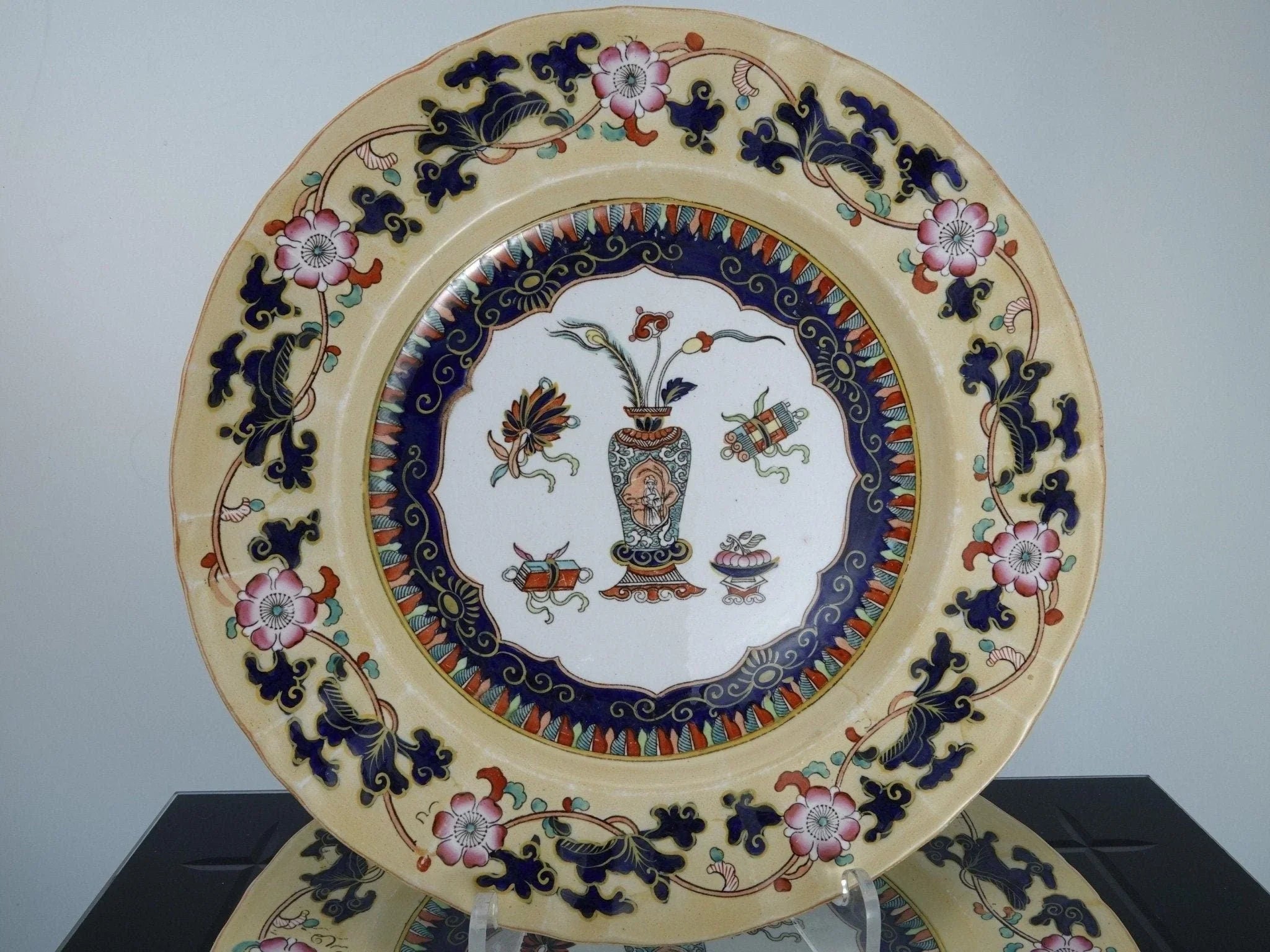 c1870 Ashworth Chinoisiere 英国 Ironstone 中式餐盘。出售 19 世纪第三季度展示的三个餐盘,没有缺口、裂缝、裂纹、污渍或修复。 10.25 英寸宽,由于 150 年的堆叠而有轻微磨损,它们的展示效果非常好。 Ashworth 还制作了其他几种与此类似的中国风图案,因此虽然这是一种非常罕见的图案,但这些图案彼此相得益彰,可以制作出令人惊叹的组装套装。非常漂亮的手绘彩色装饰。