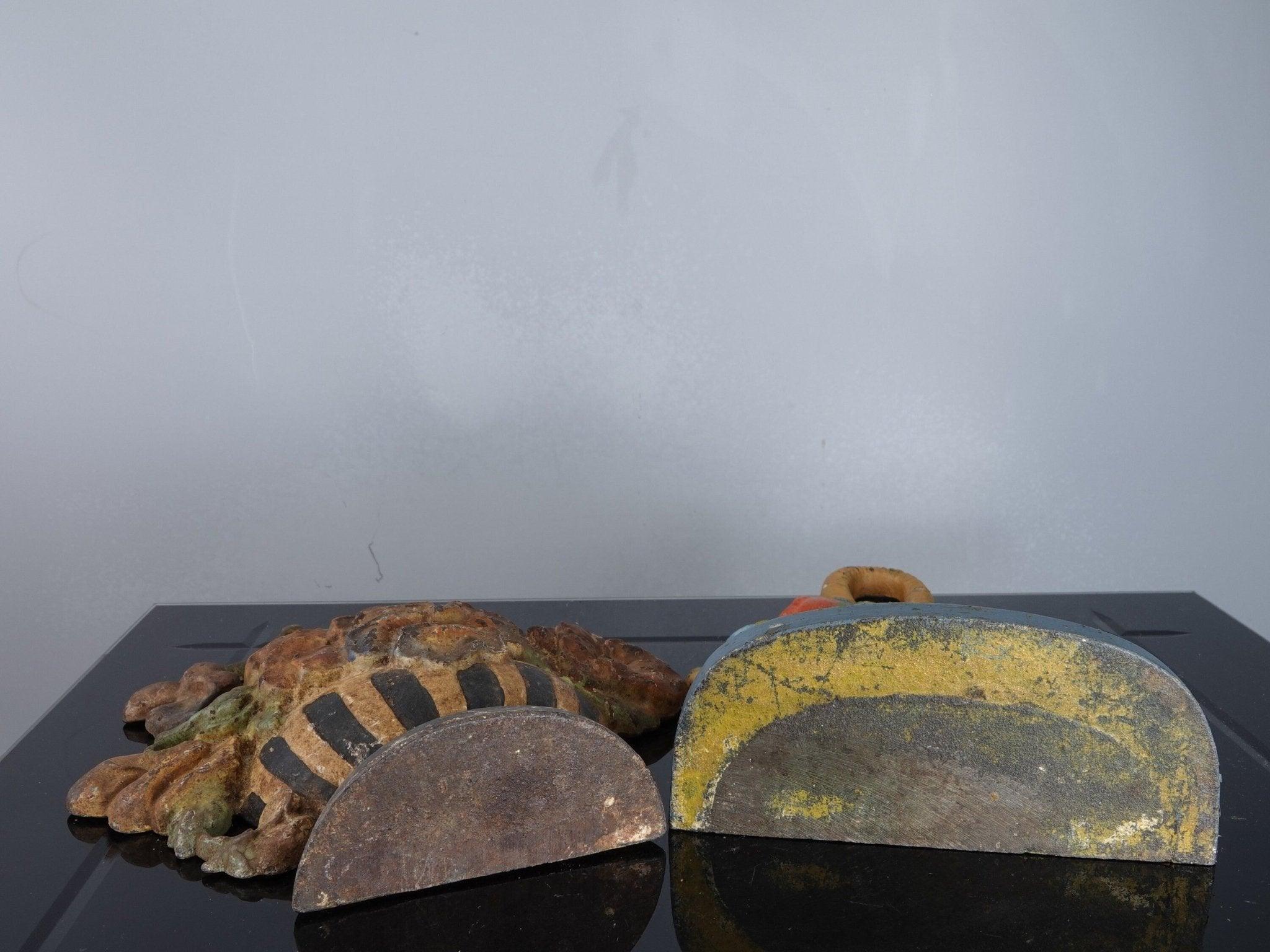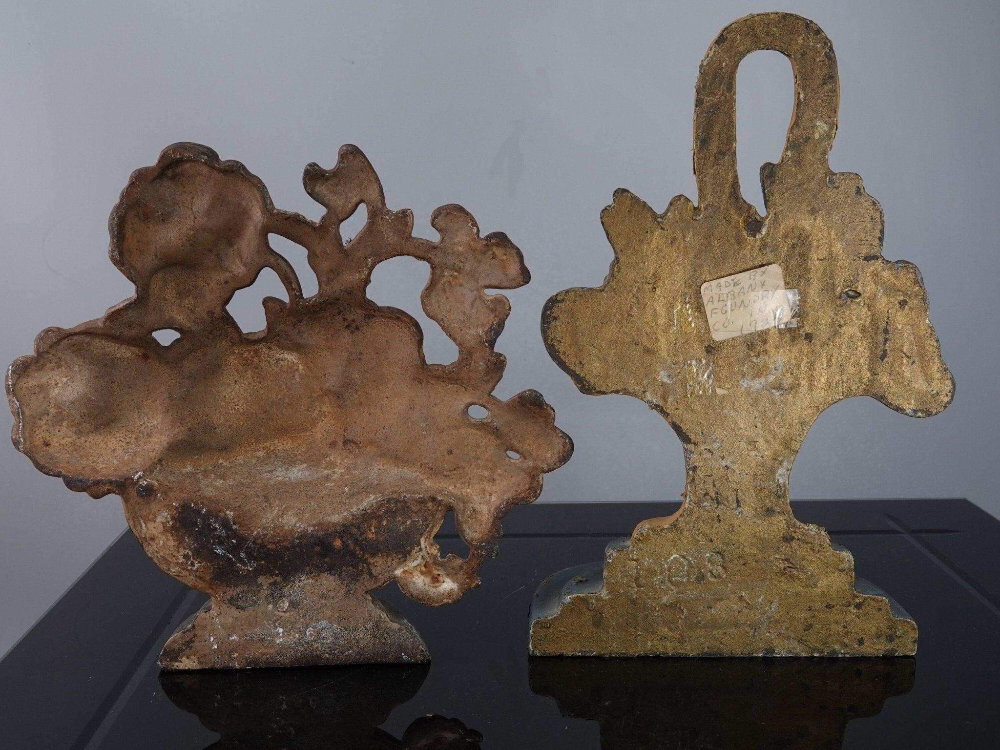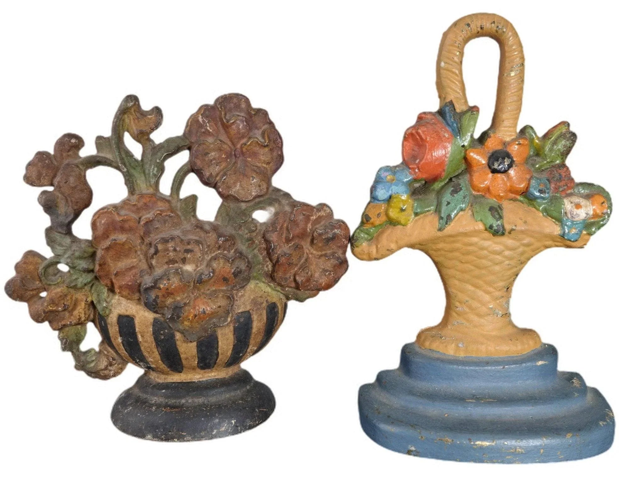1920 年代 2 个花篮门挡。出售两架 Hubley 256 6.75 英寸高,一架归属于奥尔巴尼工厂 1924 年 8 3/8 英寸高。都是 20 世纪初的好旧门挡。奥尔巴尼工厂的一层有几层油漆,这层下面的一层是金色的。