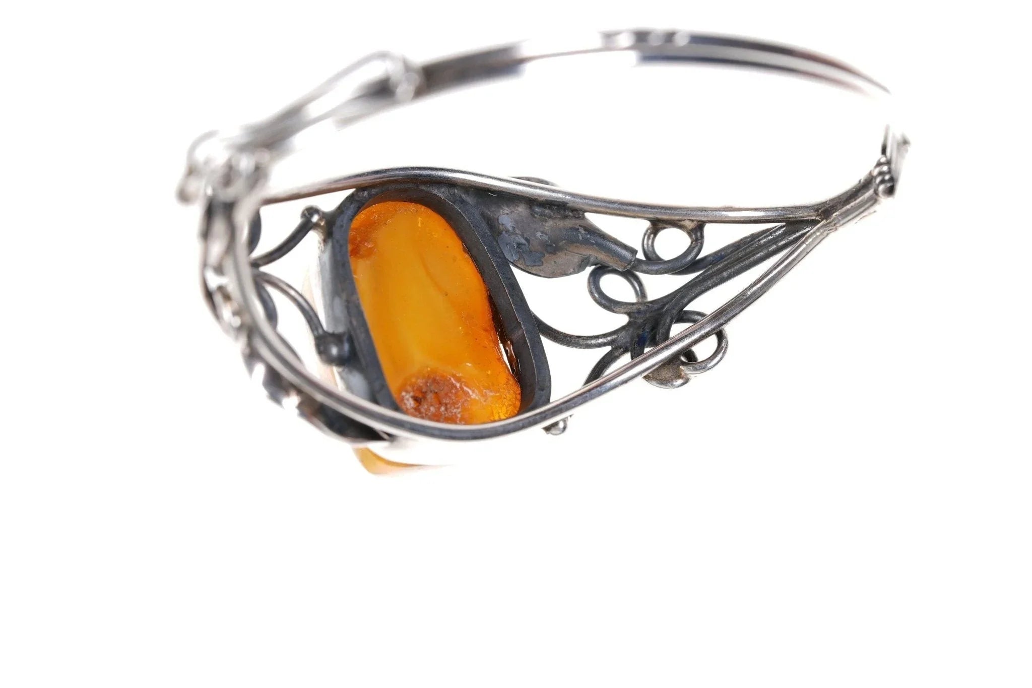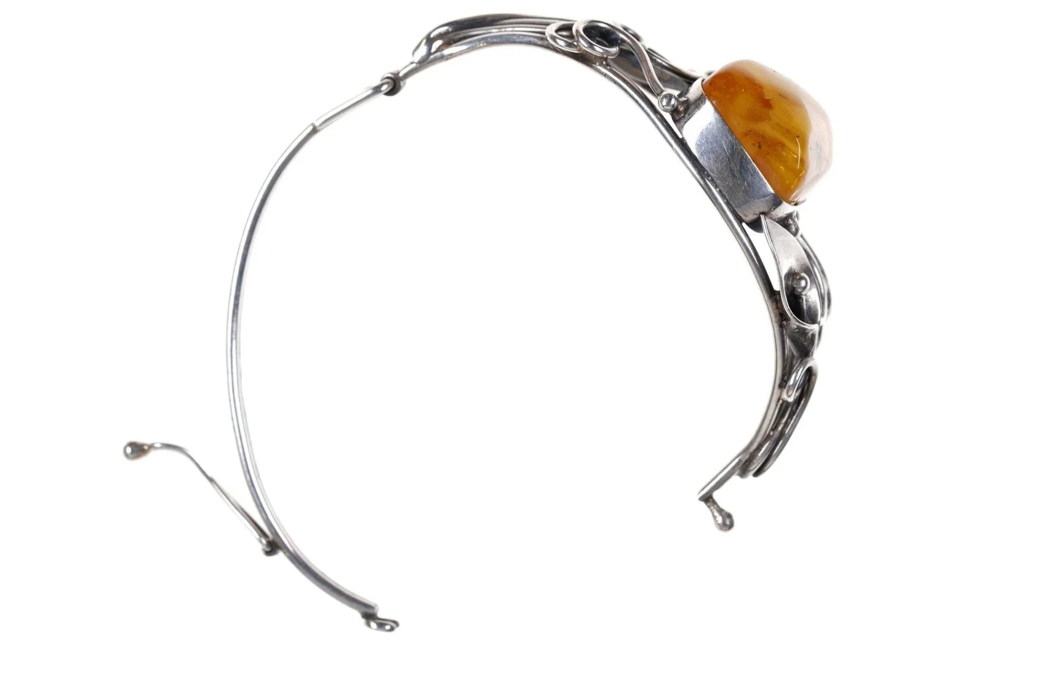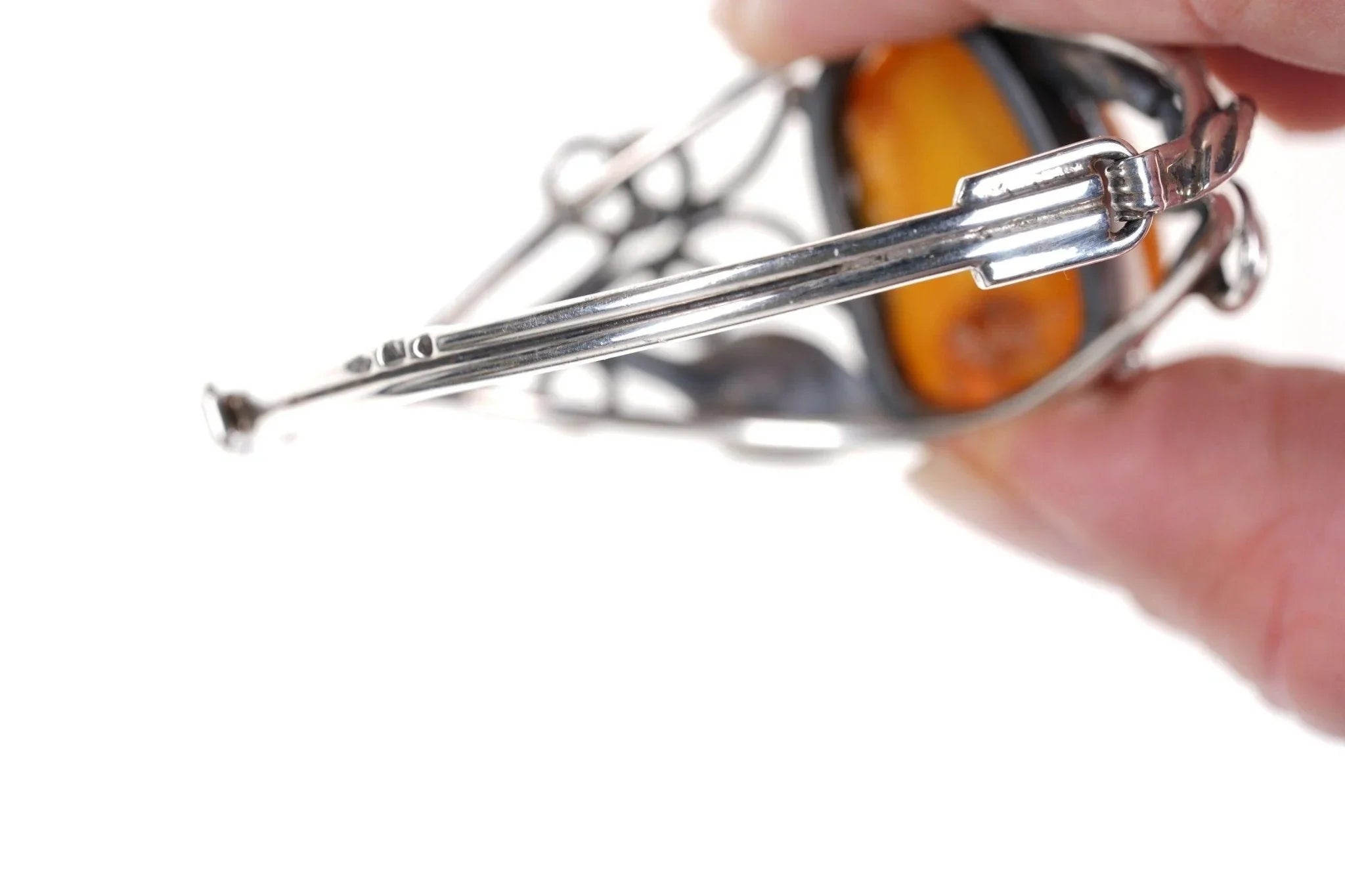 奶油糖琥珀纯银新艺术风格手镯。手镯底部的标志如上图所示。经过英镑标记和测试。非常高品质的天然琥珀手链,没有任何问题。内径 7 英寸,中心宽 1 1/8 英寸。 28.3克。