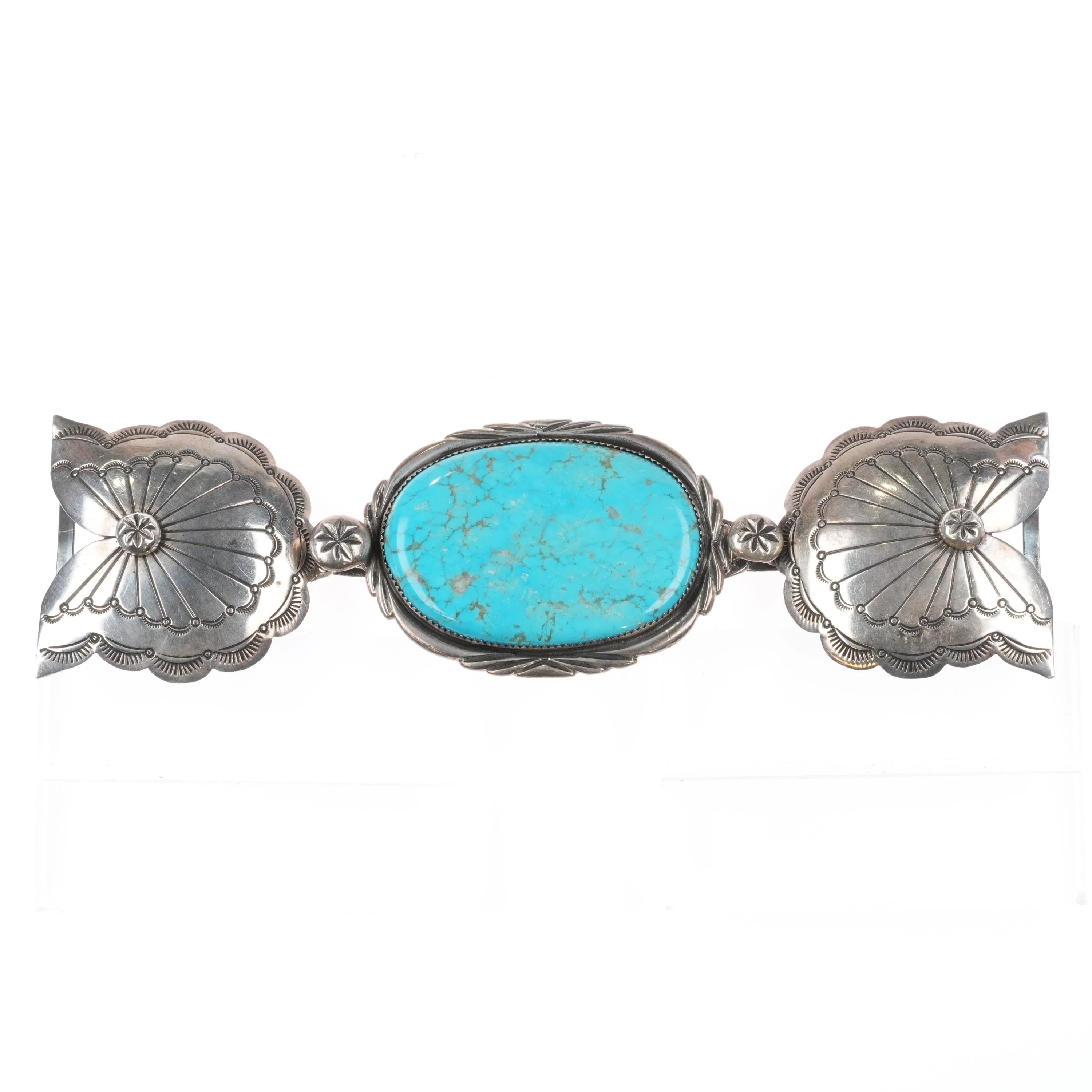 Foster Yazzie Navajo sterling silver large turquoise combo belt buckle set. Tested and guaranteed solid sterling silver, fits up to a 1.5" wide belt. No issues, some expected wear. Circa last quarter of the 20th century. Weight and measurements in pictures.