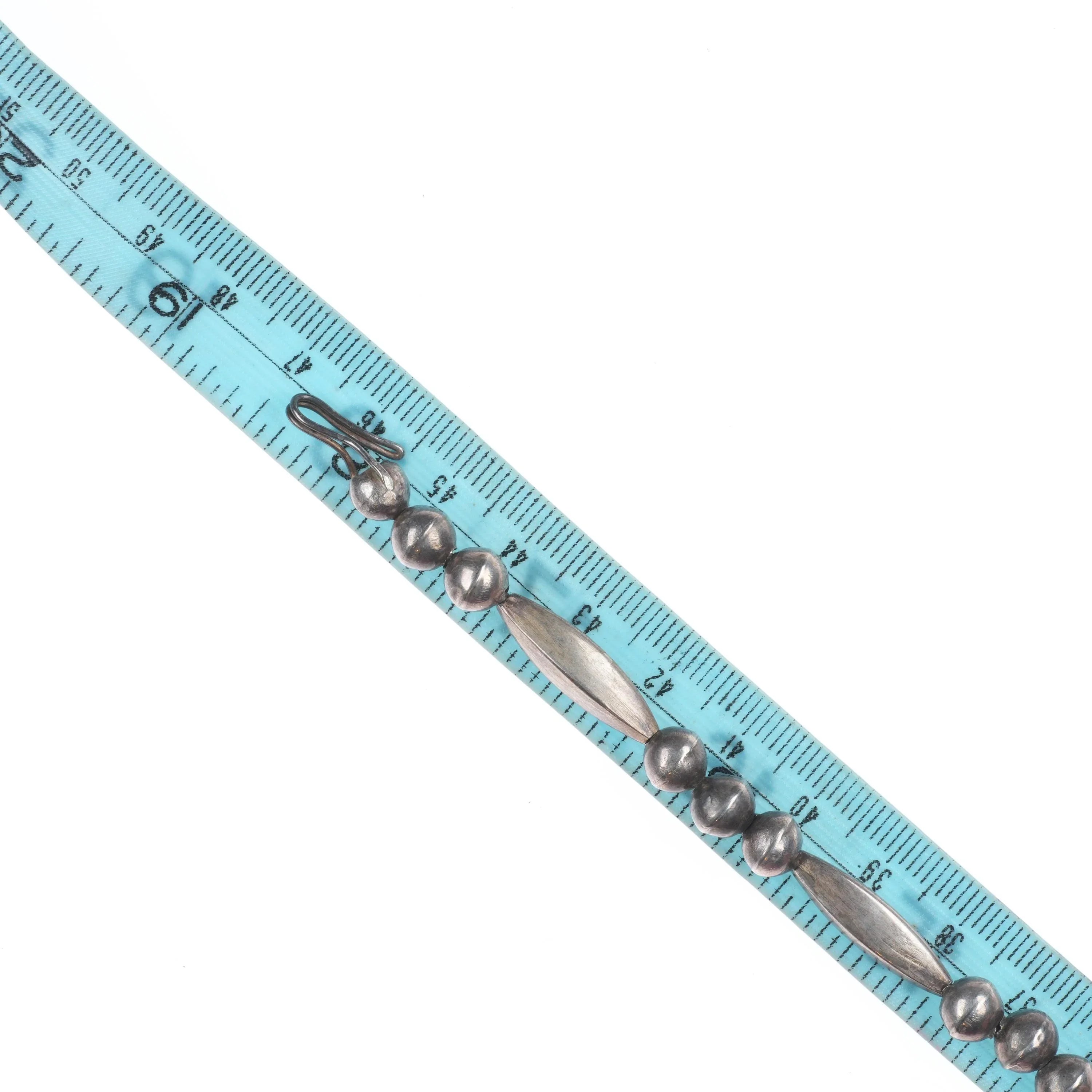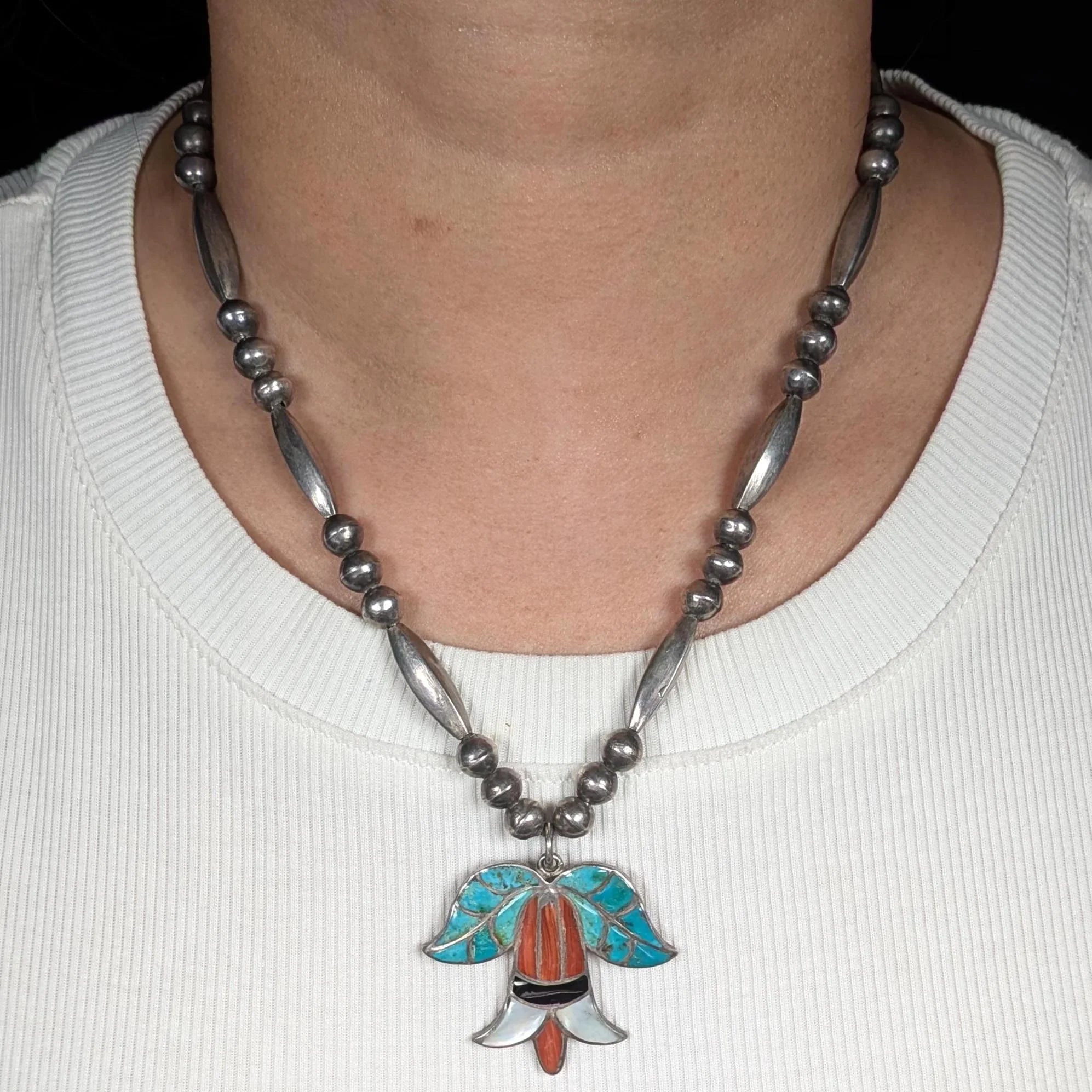 The pendant bears the artist‘s hallmark, a distinctive fleur-de-lis symbol. Vacit, active between the 1930s and 1950s, was a prominent figure in Zuni jewelry making. He was married to the daughter of Leekya Deyuse, the legendary Zuni fetish carver, and his own artistic talents are celebrated in renowned collections like the Smithsonian National Museum of the American Indian and the Heard Museum in Phoenix.