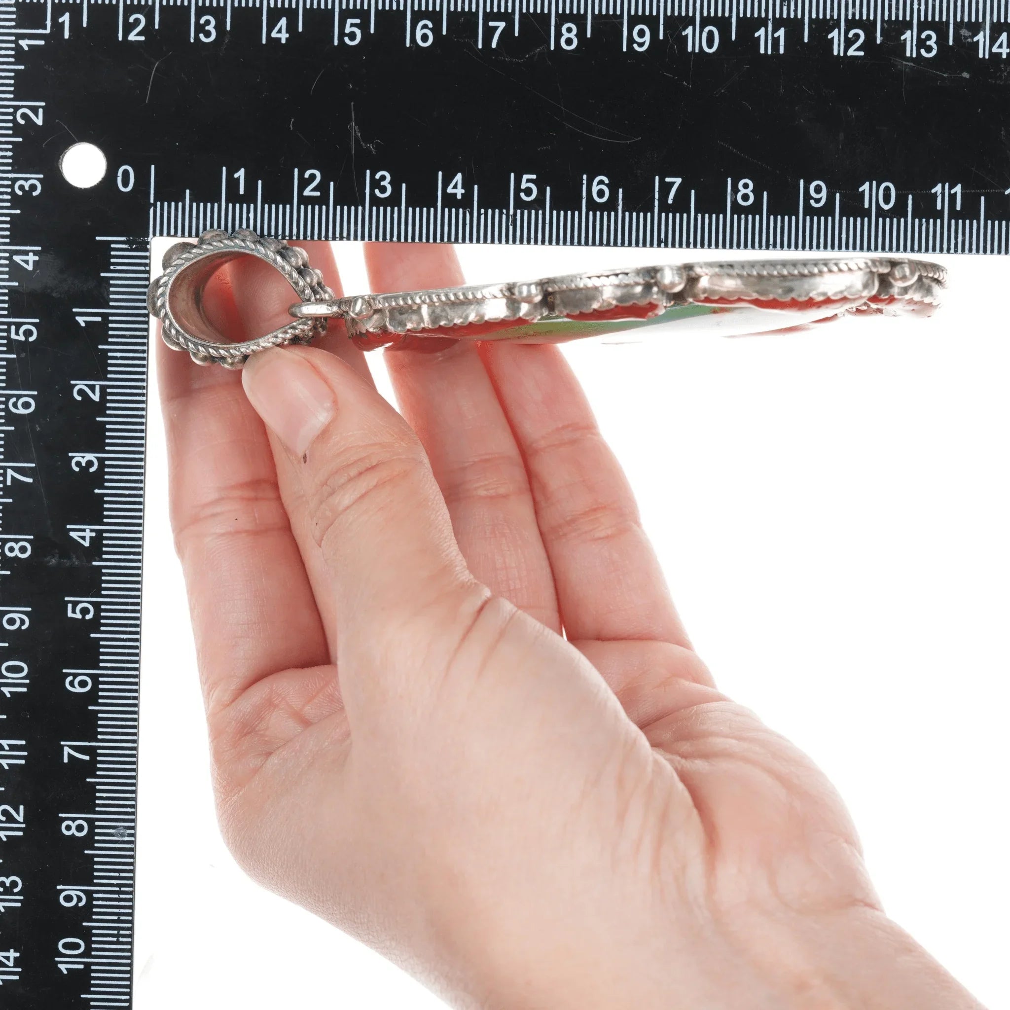 Huge Ashley Navajo sterling turquoise, and coral pendant. Very substantial and well made piece. There are several Ashley Navajo silversmiths, most related I believe. I don't have time to find out which one this is. No issues. Measurements in pics.