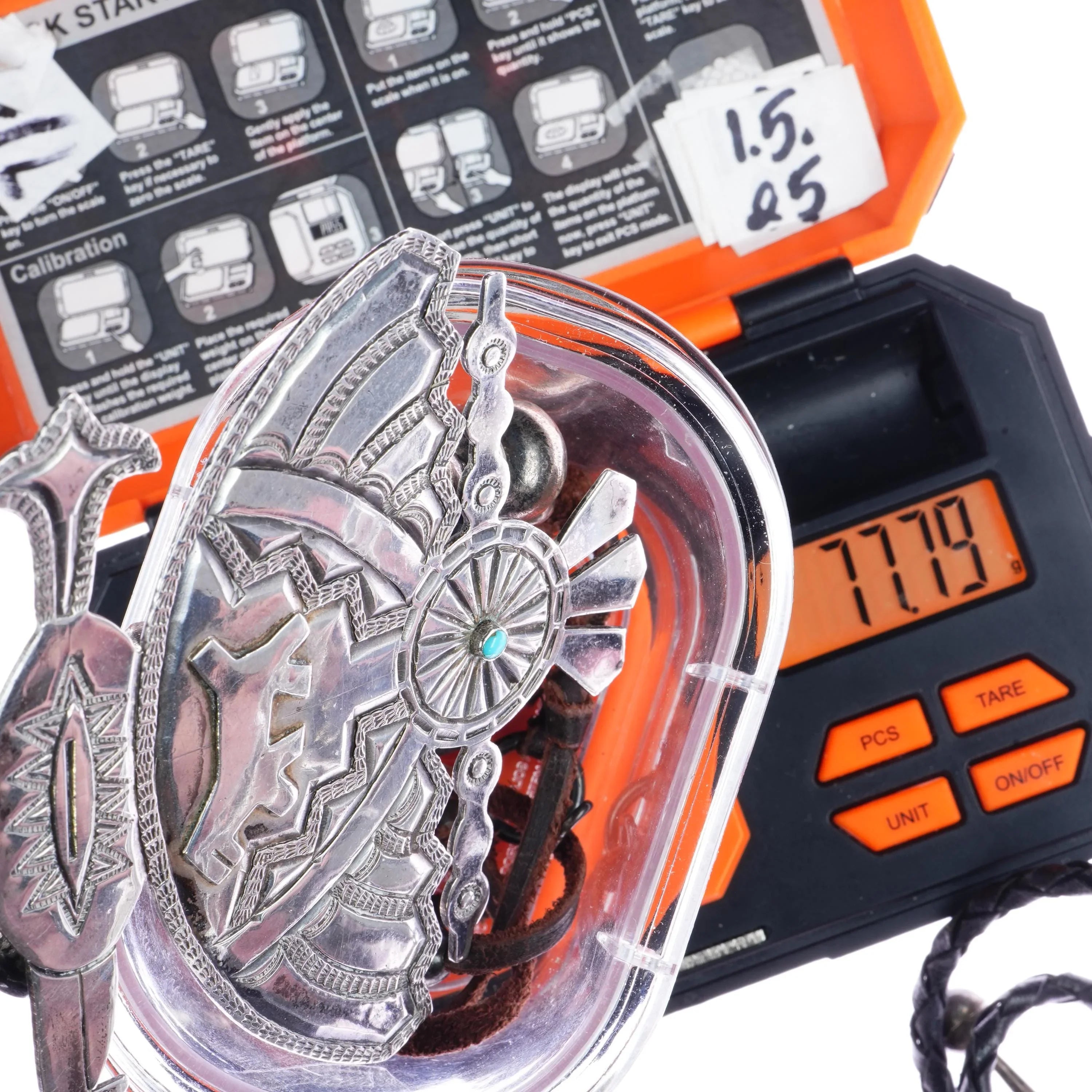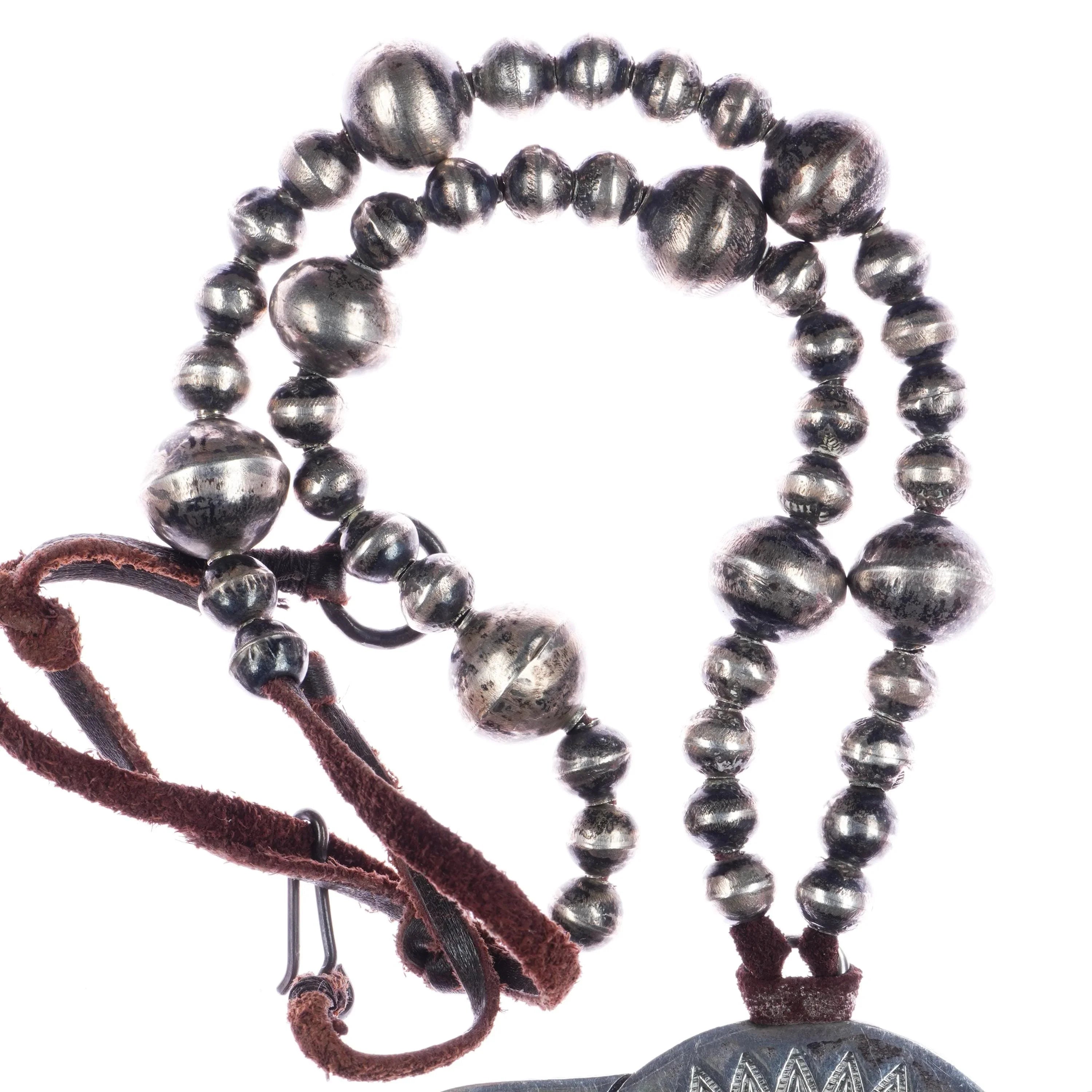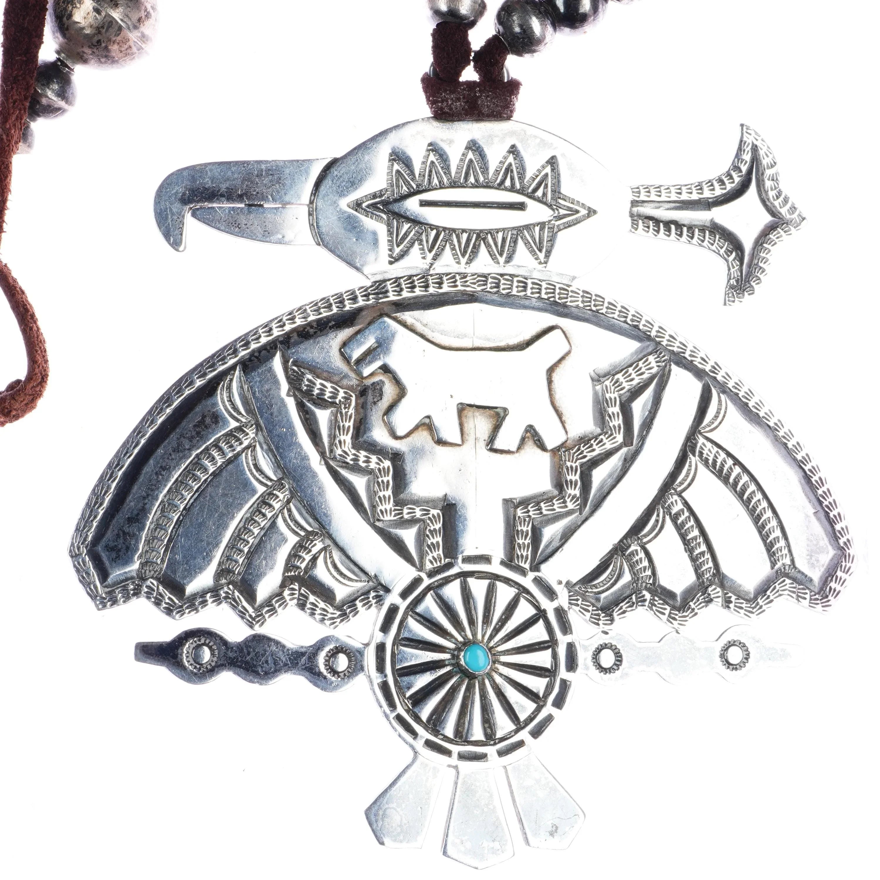Huge c1930‘s Navajo pearls/Fred Harvey thunderbird pendant. Both pendant and necklace from the second quarter of the 20th century. Beads have worn stampings if you look closely. Necklace 28" long, beaded part extends 7" up on each side. Pendant 4" x 4". previous owners initials on back of pendant. I feel stupid for having to say this, but all solid sterling/high content silver. Leather possibly not original, but old enough to look good, and young enough that it doesn‘t seem brittle.
