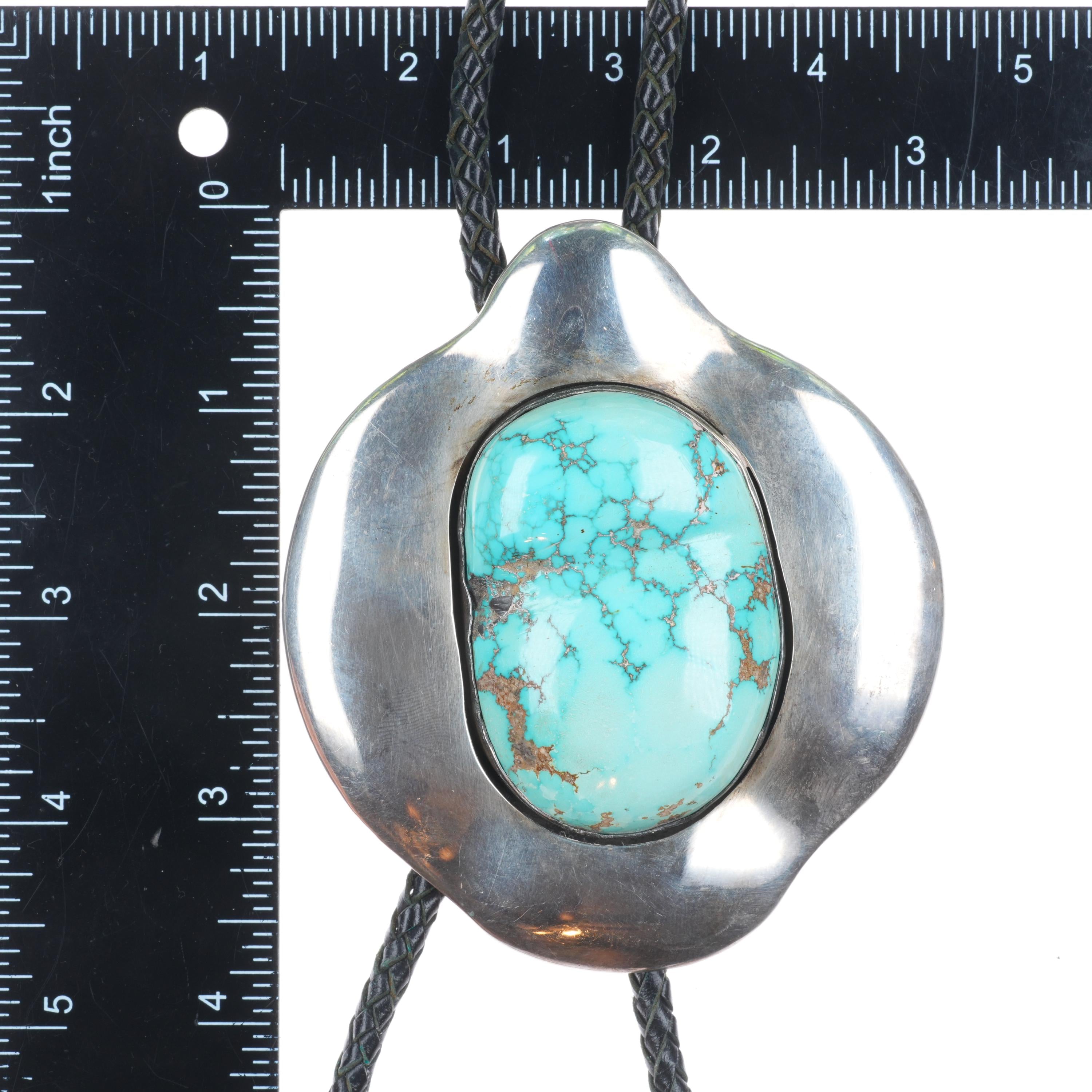 Huge Vintage c1970 Navajo sterling silver freeform bolo tie with nice turquoise. Tested and guaranteed solid sterling silver slide and tips. Weight and measurements in pictures. 36" long tight/old fracture towards top of stone. Stone is secure and going nowhere.. Tray is tared out, so weight shown is just the bolo of course. Very nice natural American turquoise, I‘ve seen this stone used in mostly older Native American jewelry but never figured out what mine it was.