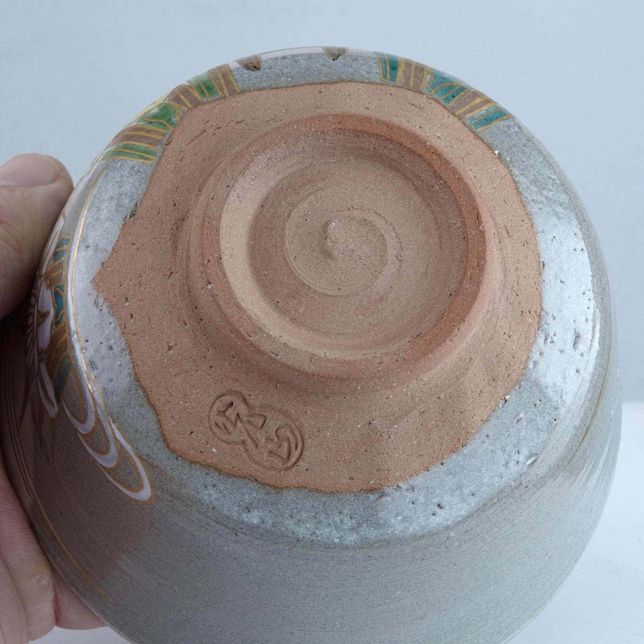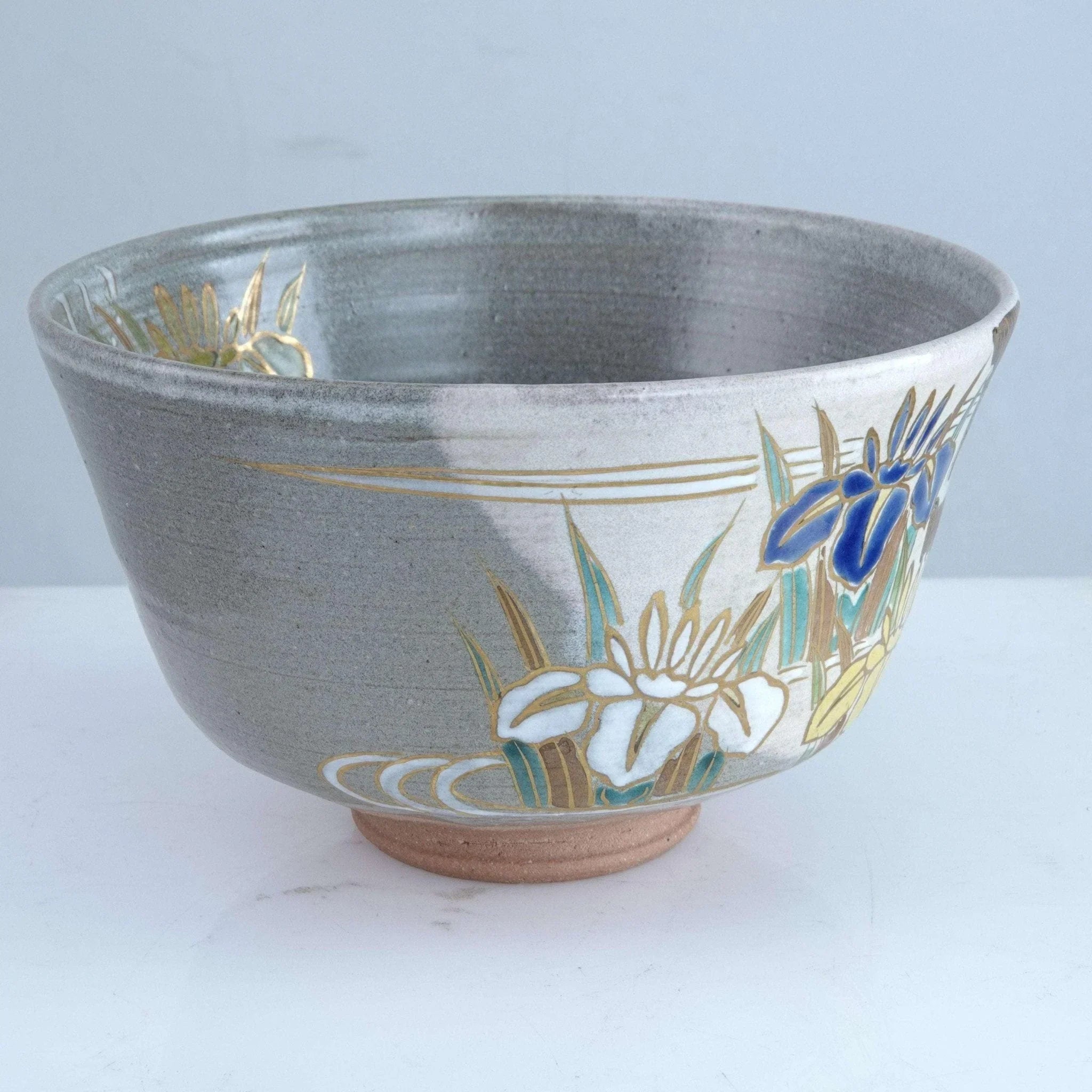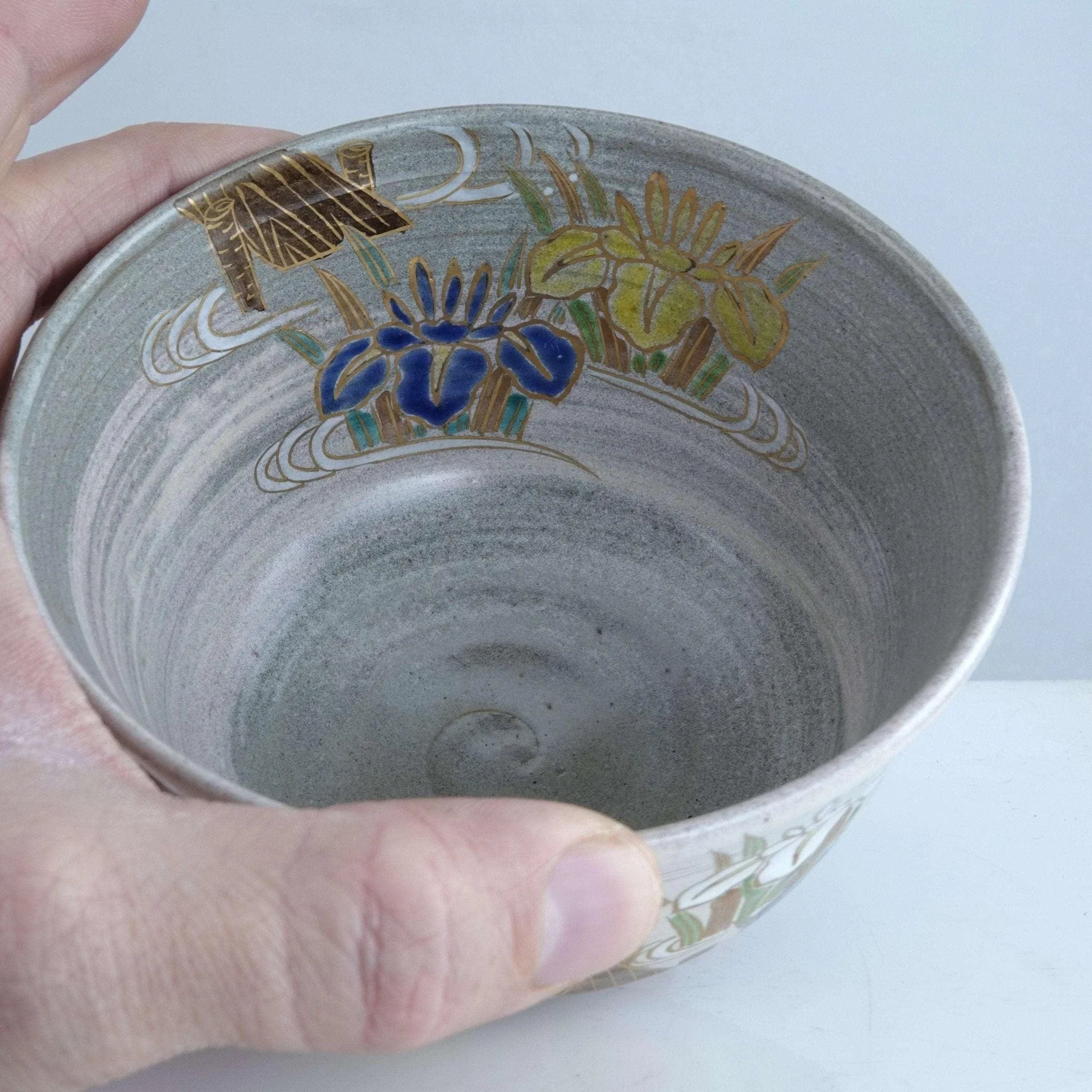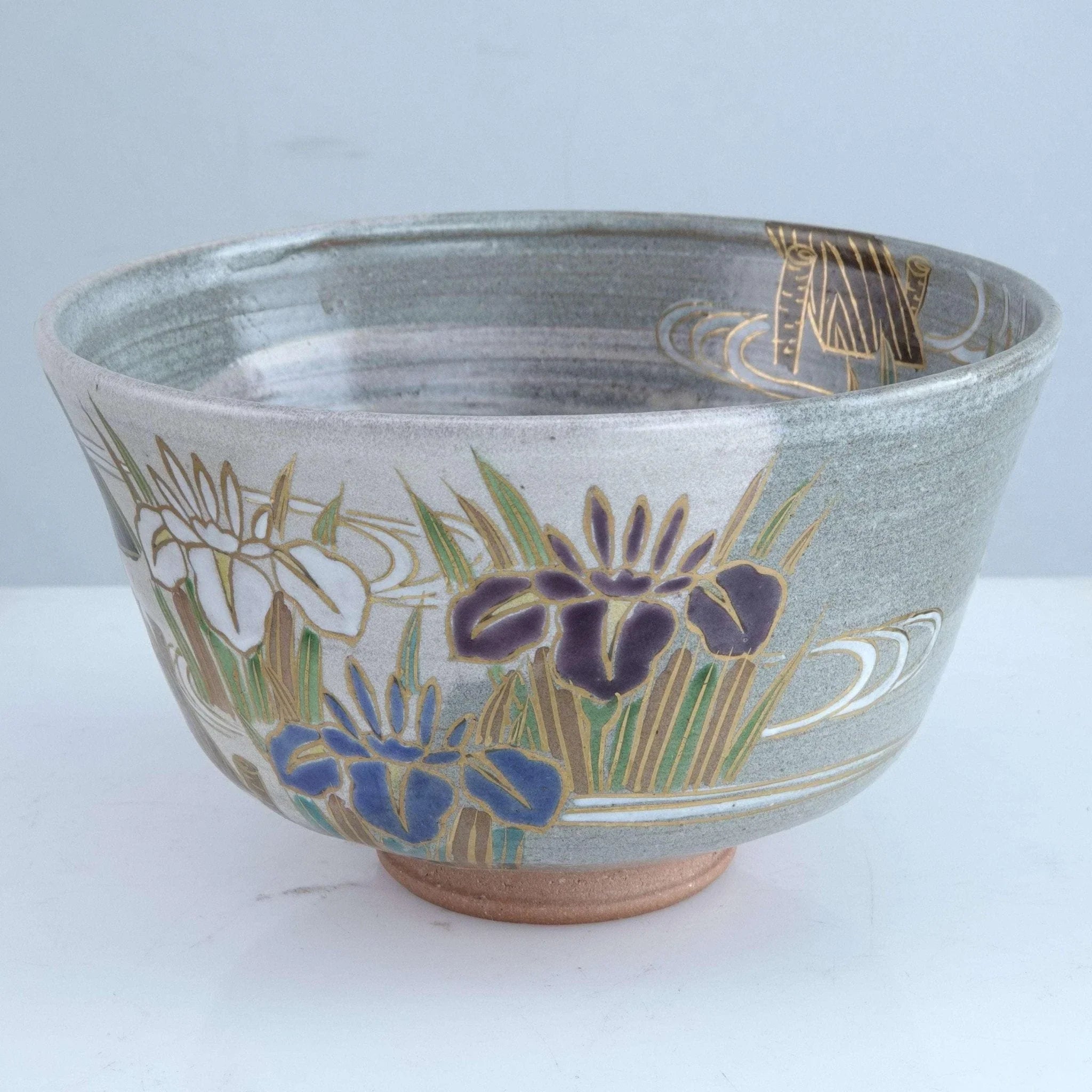 日本工作室陶器手绘鸢尾花与金茶碗。漂亮的作品很可能是 20 世纪中后期手绘的,认为它会被认为是一个茶碗,不确定制造者。 4.75 英寸宽 x 3 英寸高。无损坏、磨损或修复。