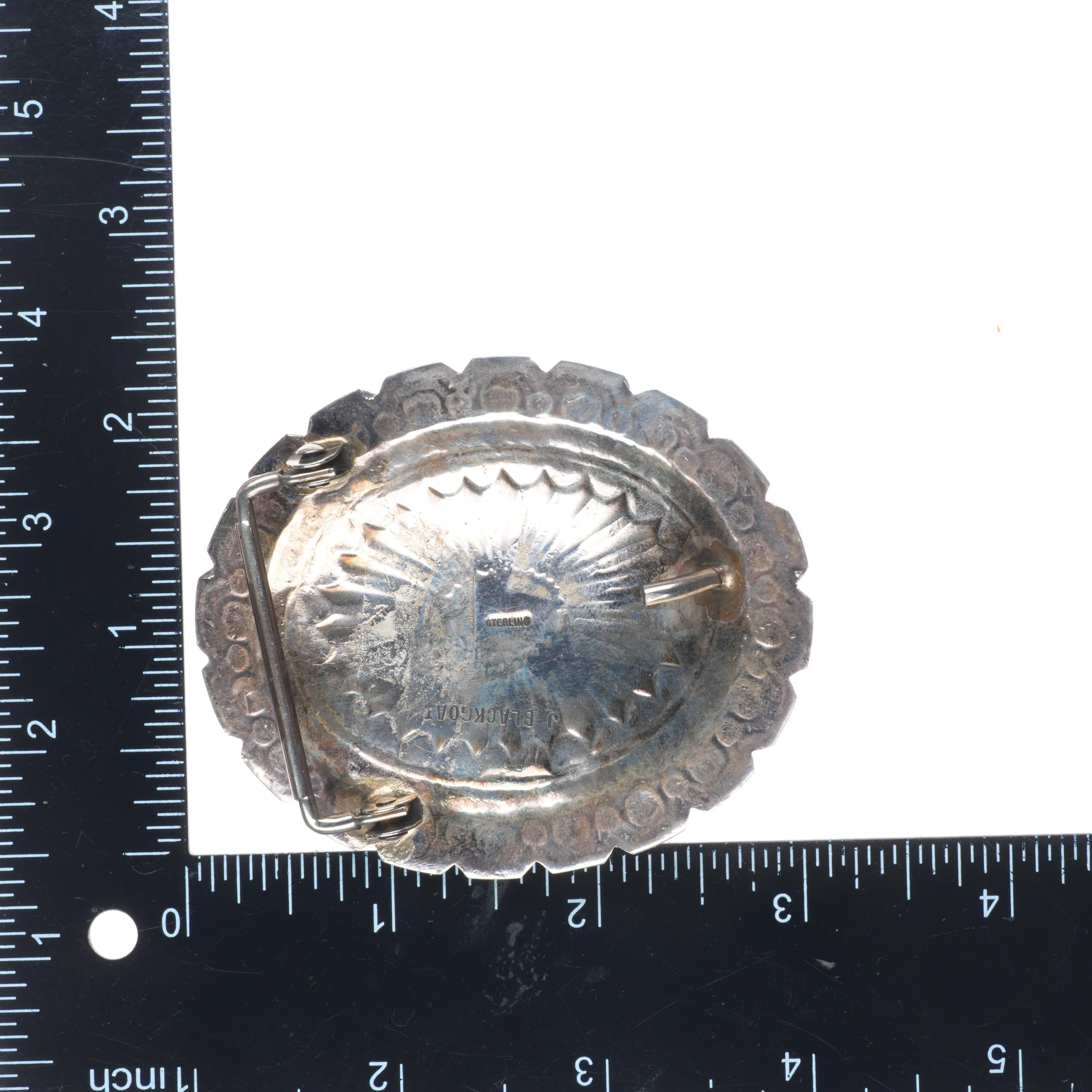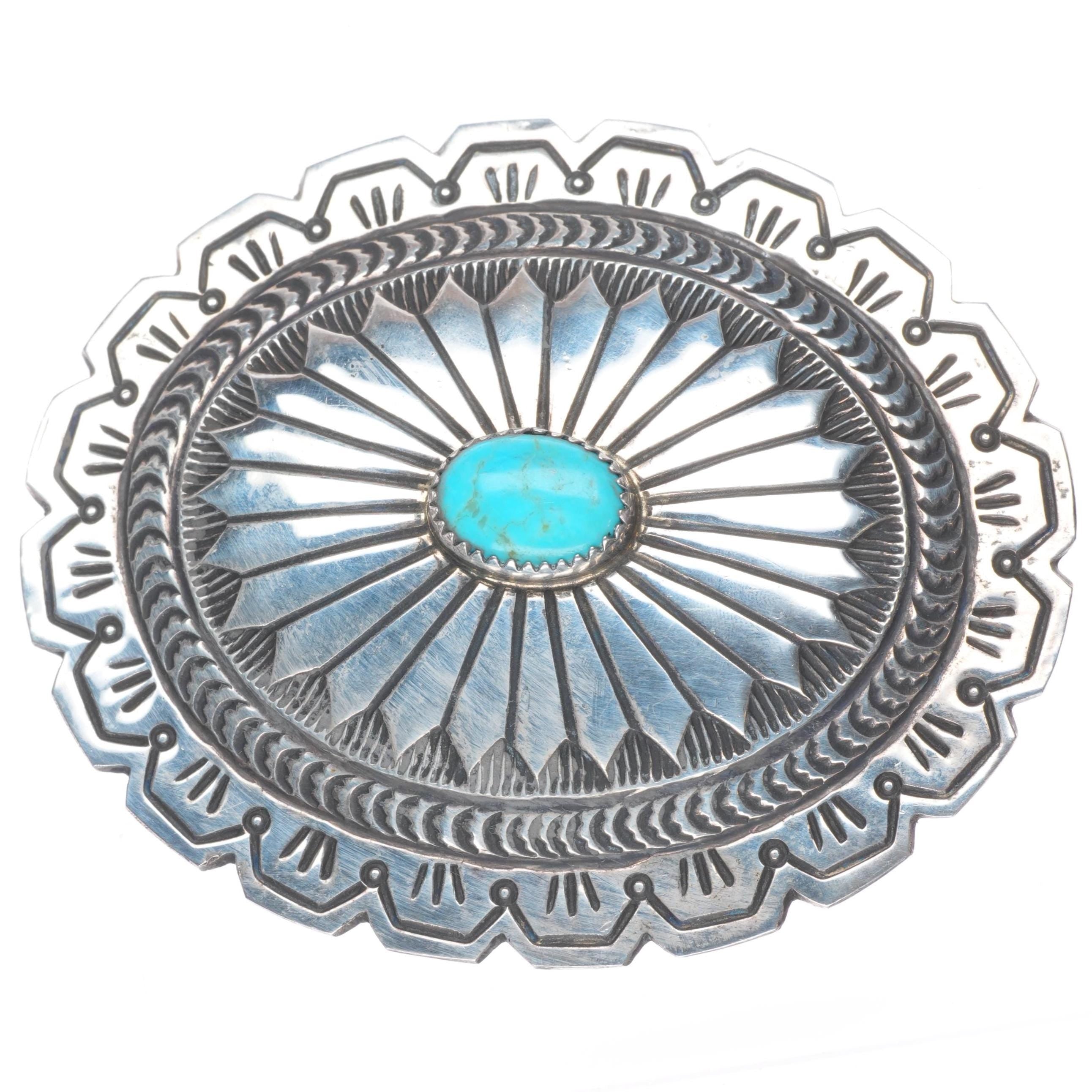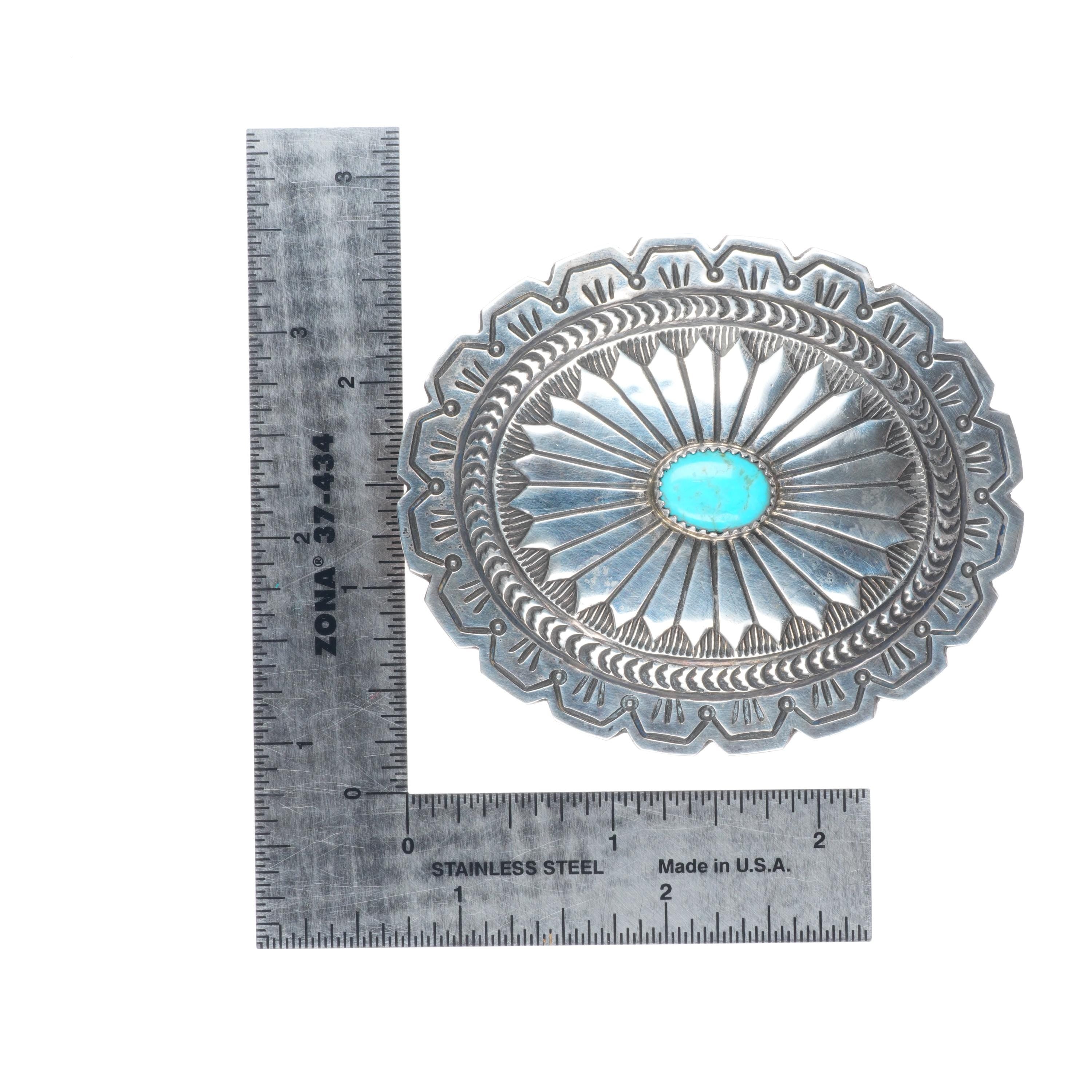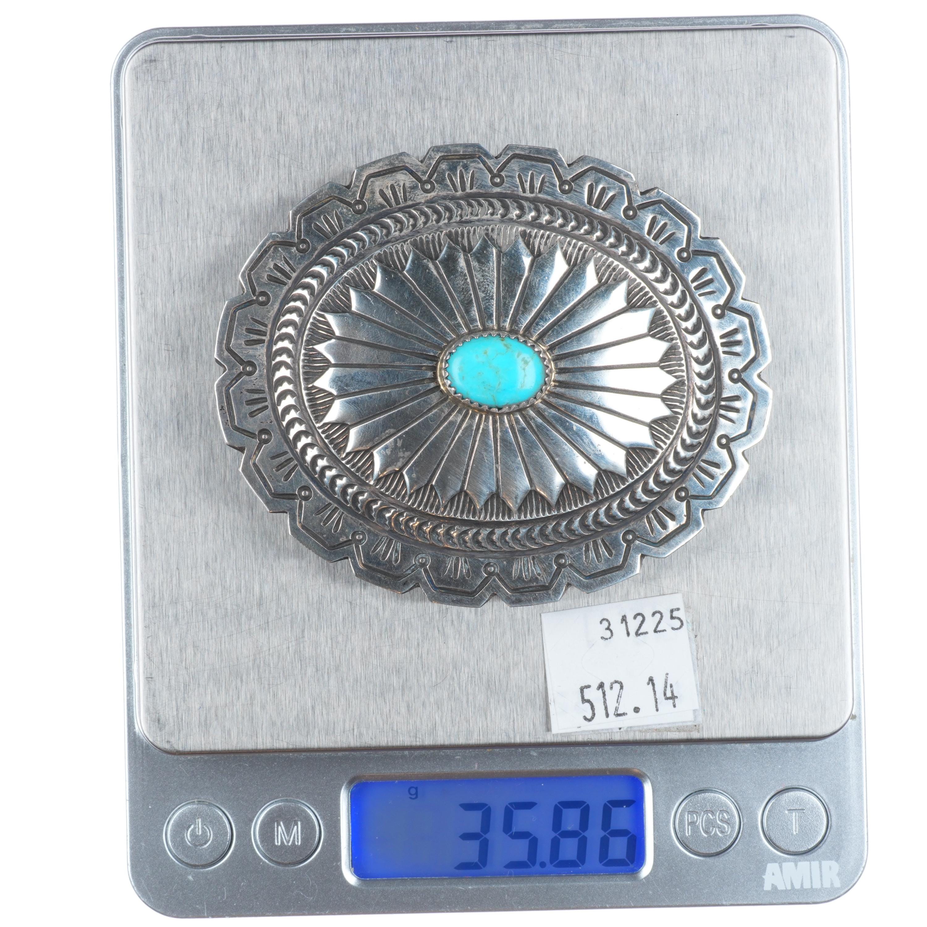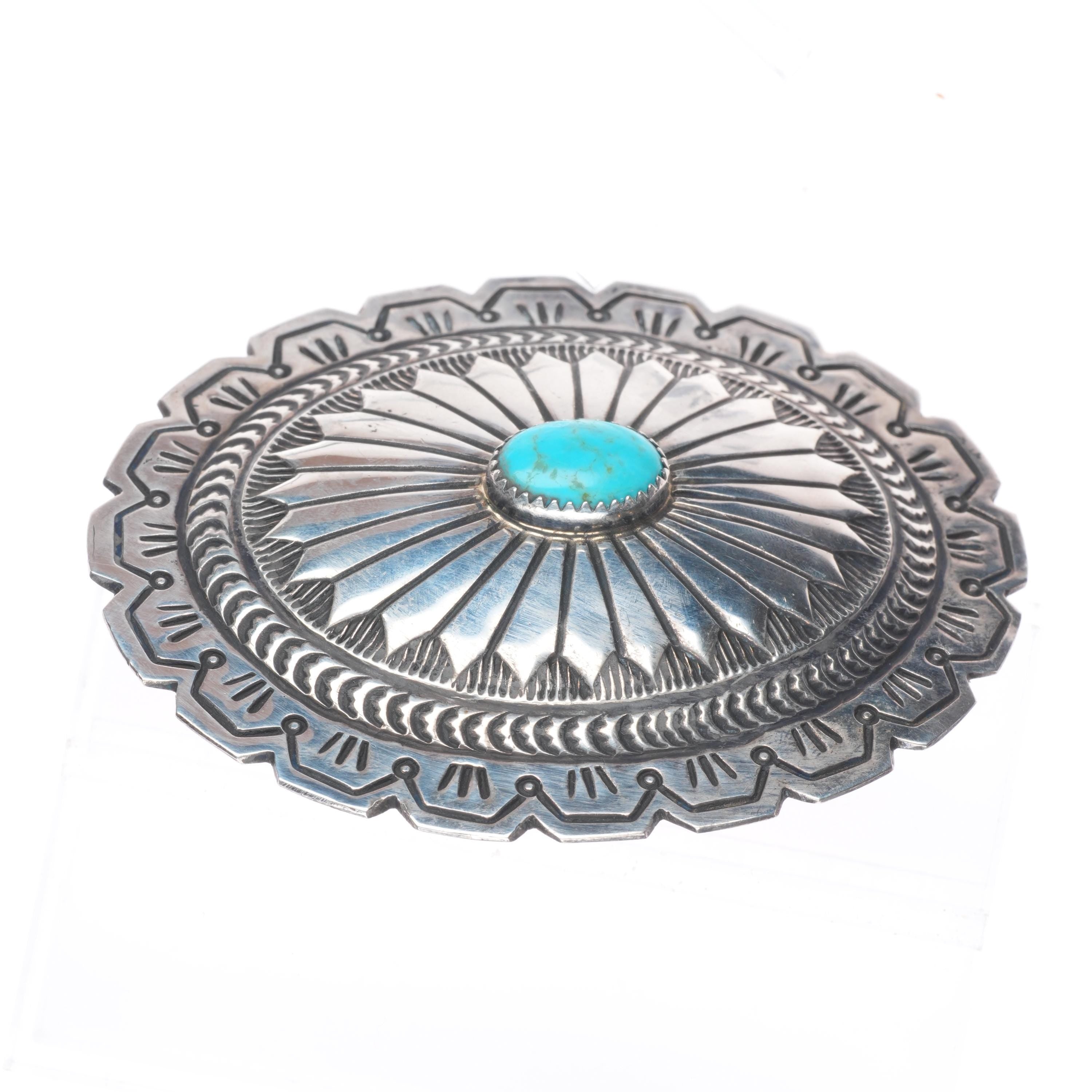 Jenny Blackgoat Navajo sterling silver concho style belt buckle with turquoise. Tested and guaranteed solid sterling silver with weight and measurements in pictures. Fully functional. All items will likely have some age appropriate/expected wear, the older they are the more wear they should have. Circa third quarter of the 20th century.. Fits a 1.5" belt.