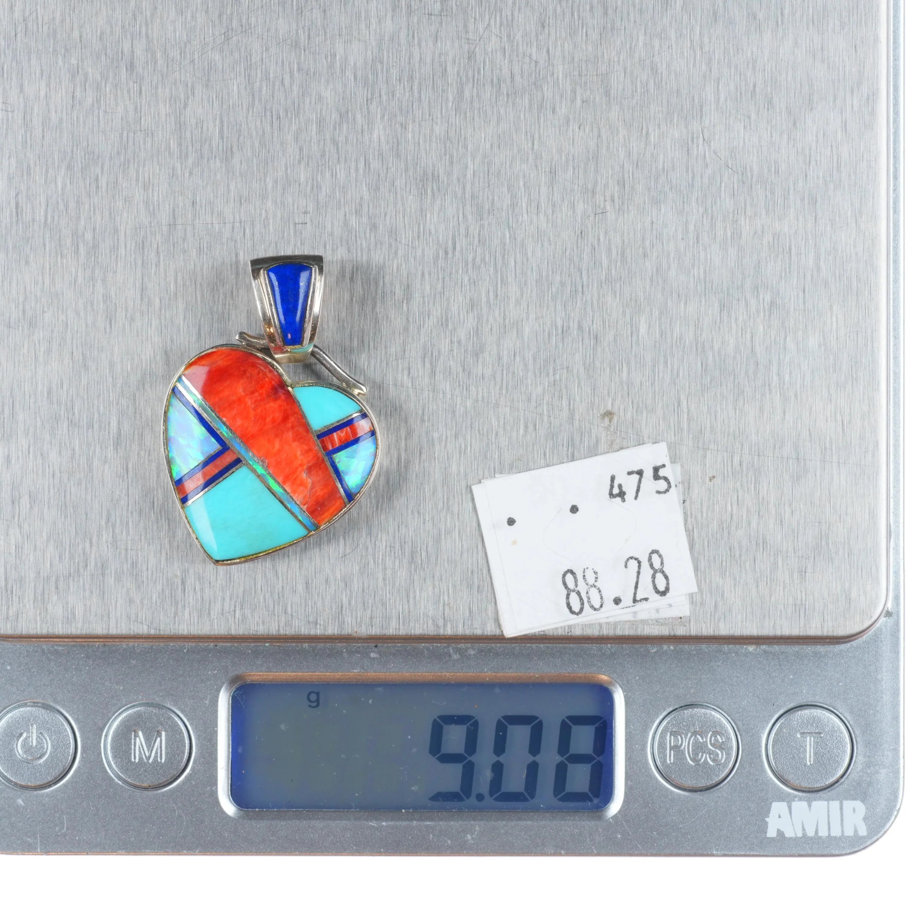 Kenneth Bitsie Navajo sterling silver, turquoise, spiny oyster heart pendant