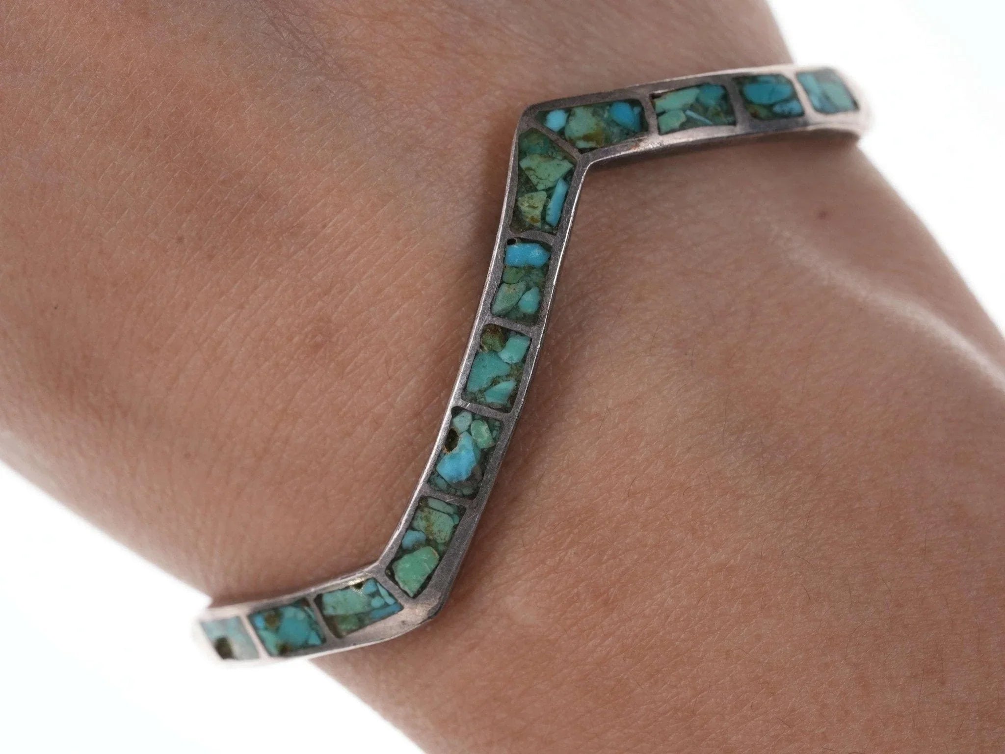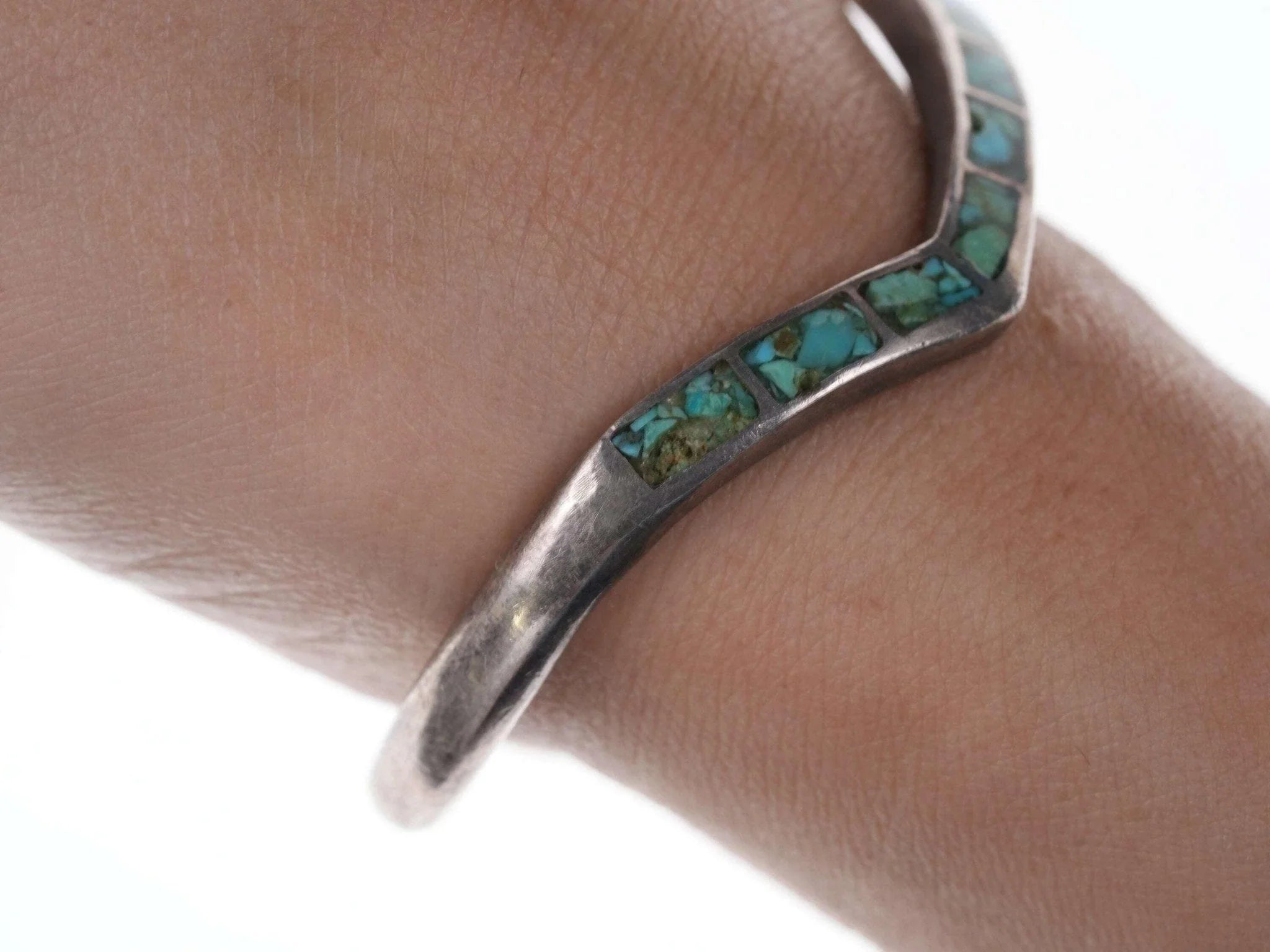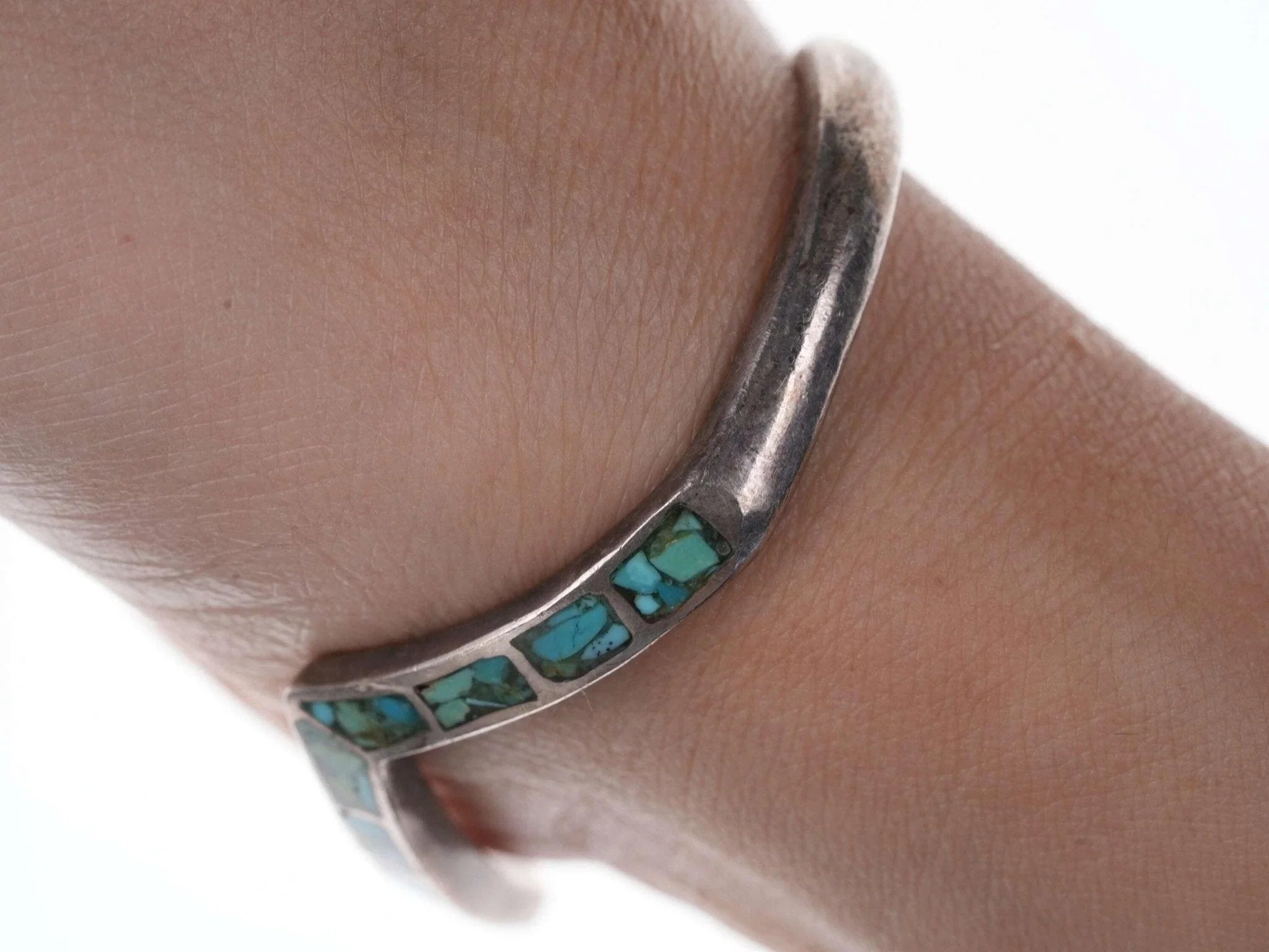 美洲原住民纯银/绿松石芯片通道镶嵌手镯。 20 世纪第三季度的漂亮小手镯。无标记,经过纯正测试,无损坏。