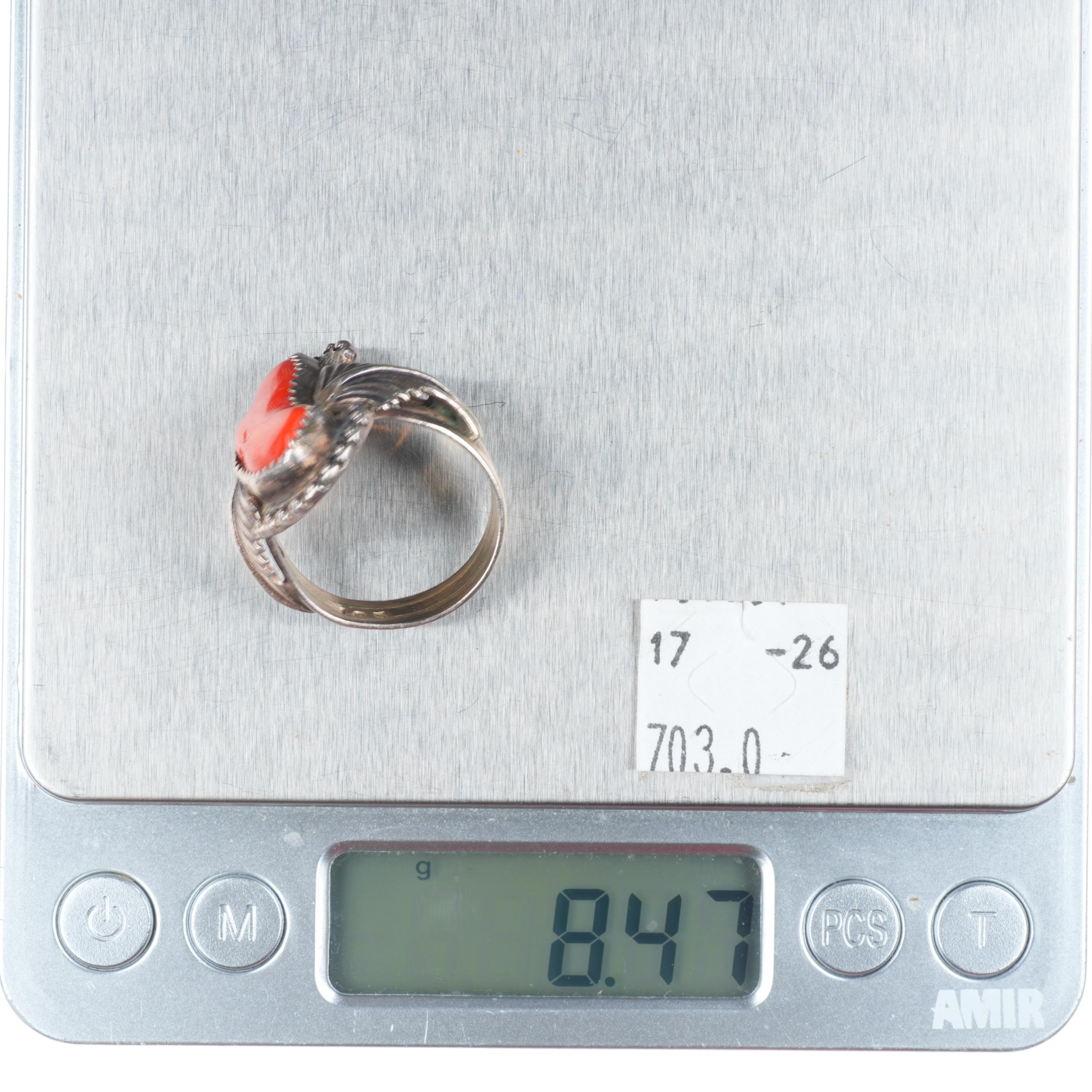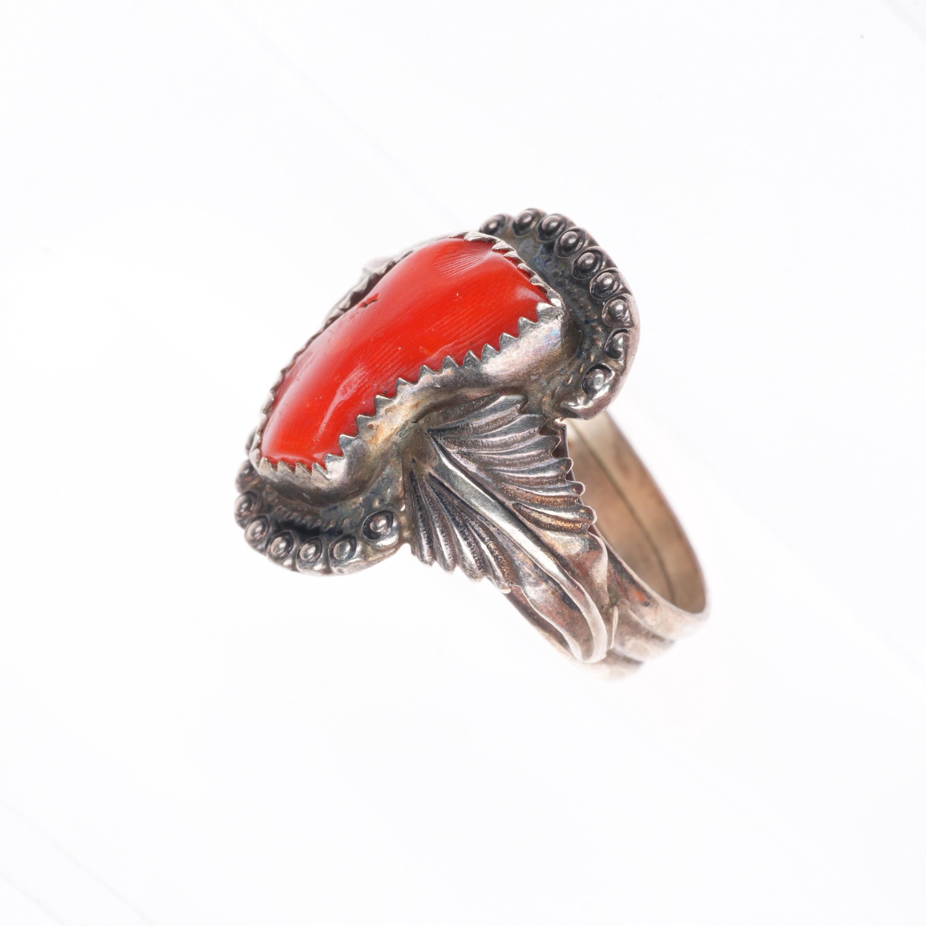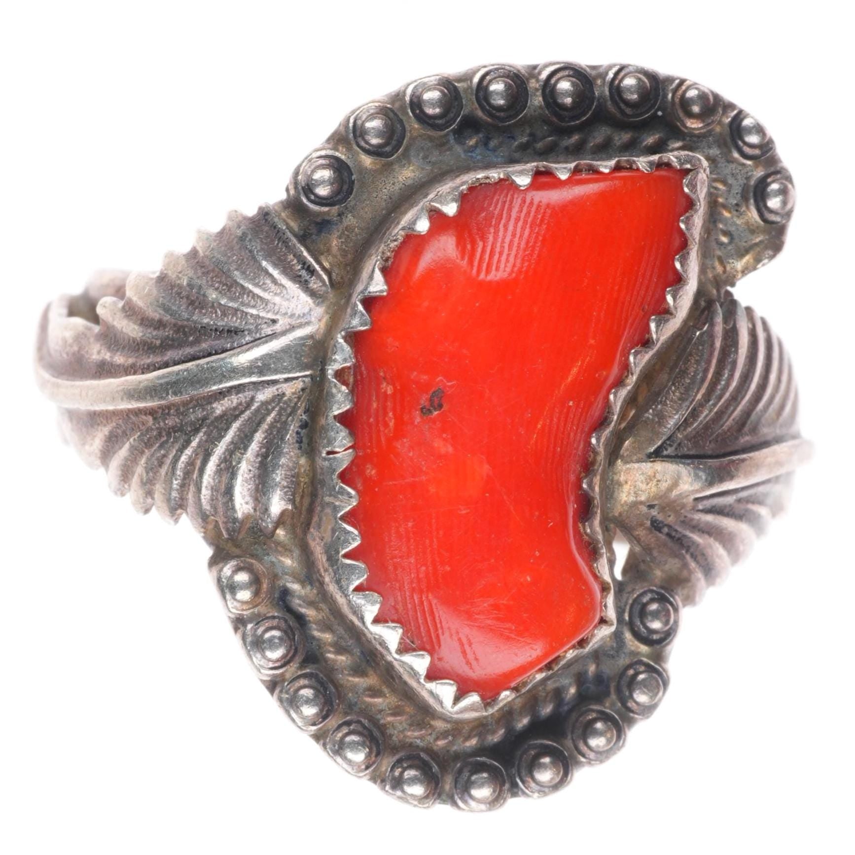 sz10.5 JS Native American sterling silver branch coral ring feather accents