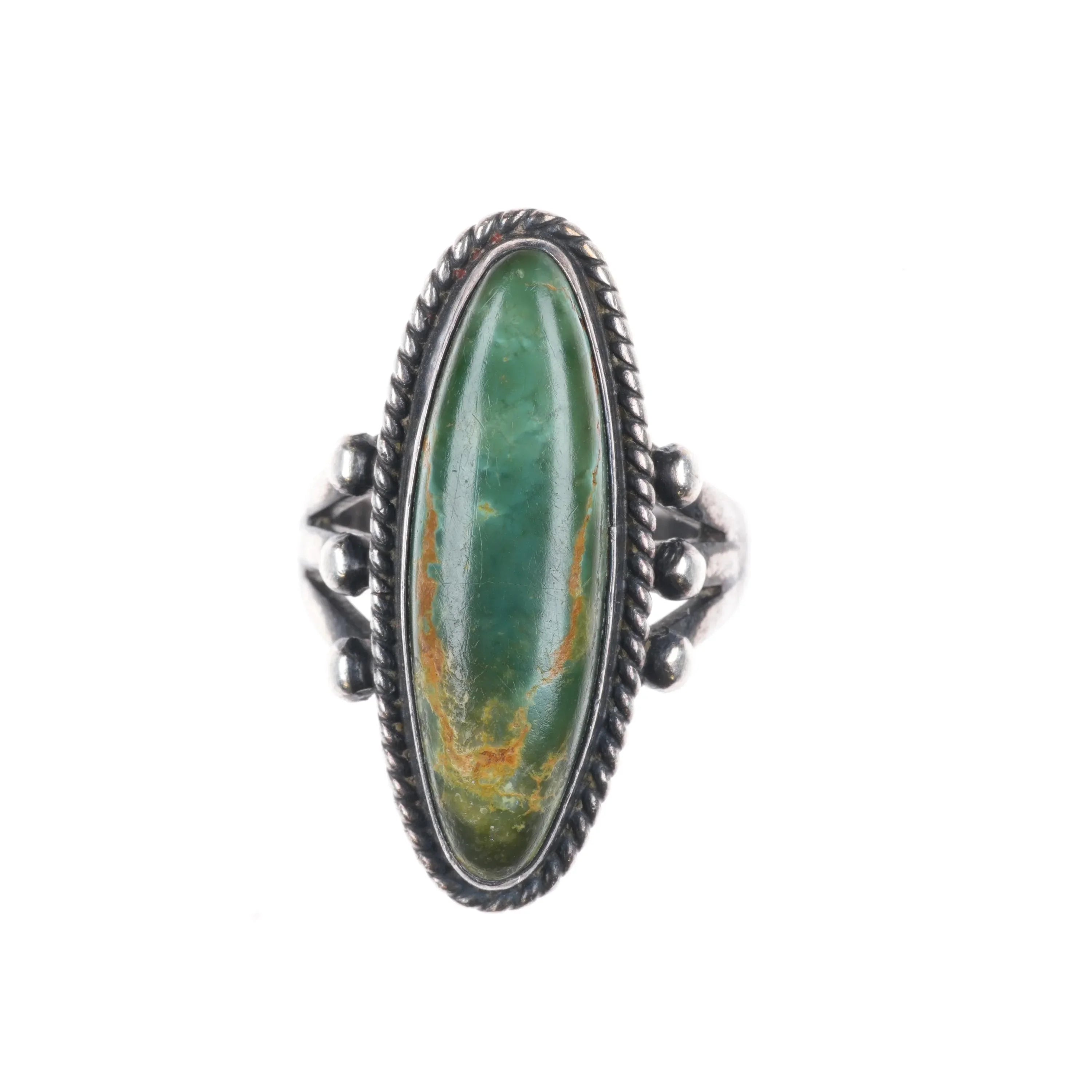 sz6 40‘s-50‘s Navajo Cerrillos turquoise sterling silver beaded sides ring. Weight and measurements in pictures. Solid sterling silver (tested), with no markings. Vintage ring with no issues. Very attractive stone.