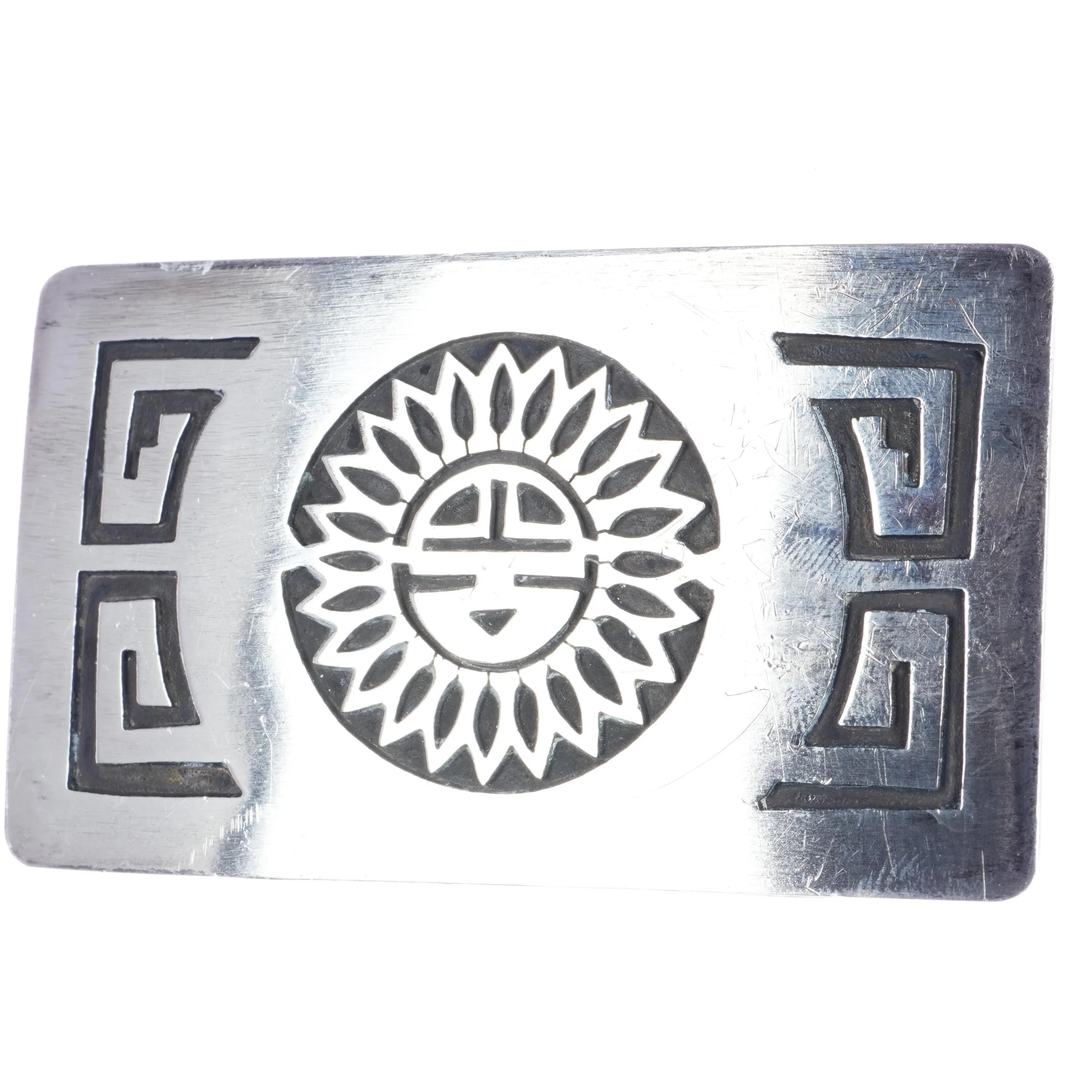 Vintage Native American sterling sunface belt buckle overlay design. Solid sterling silver with weight and measurements in pics. Fully functional, with appropriate wear as shown in the pictures. Picto-hallmarked as shown with sterling mark.