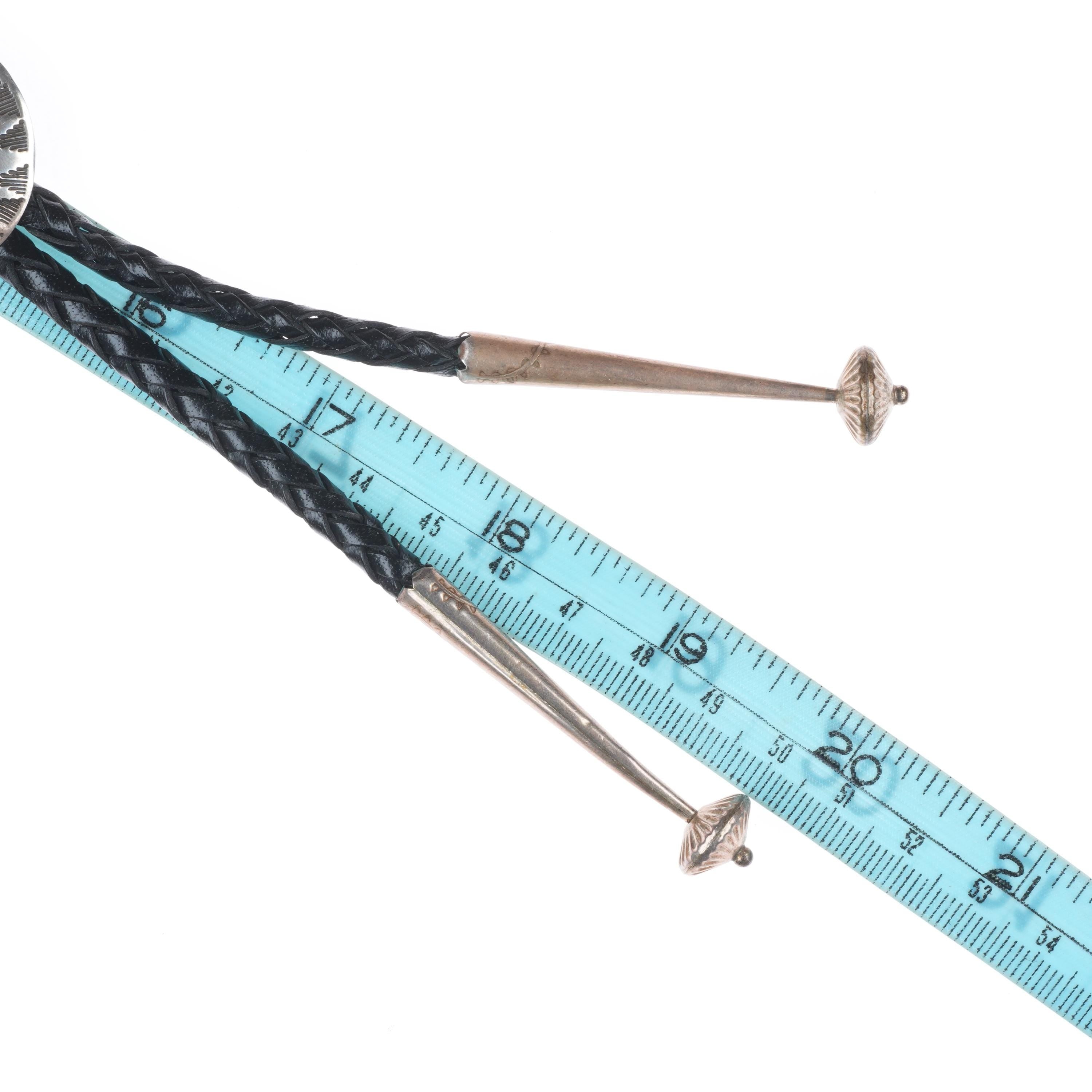 Vintage Navajo sterling silver bolo tie with stamped concho style slide. Tested and guaranteed solid sterling silver slide and tips. Weight and measurements in pictures. Great bolo, 39" long with no issues. Weight shown is the entire bolo.