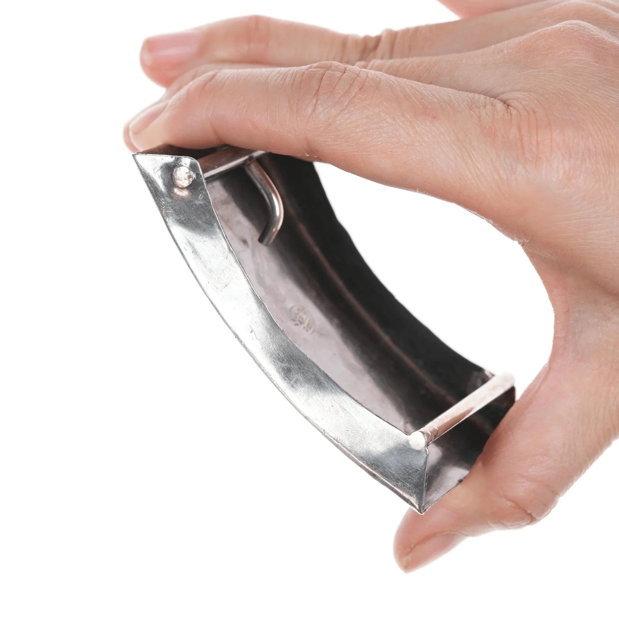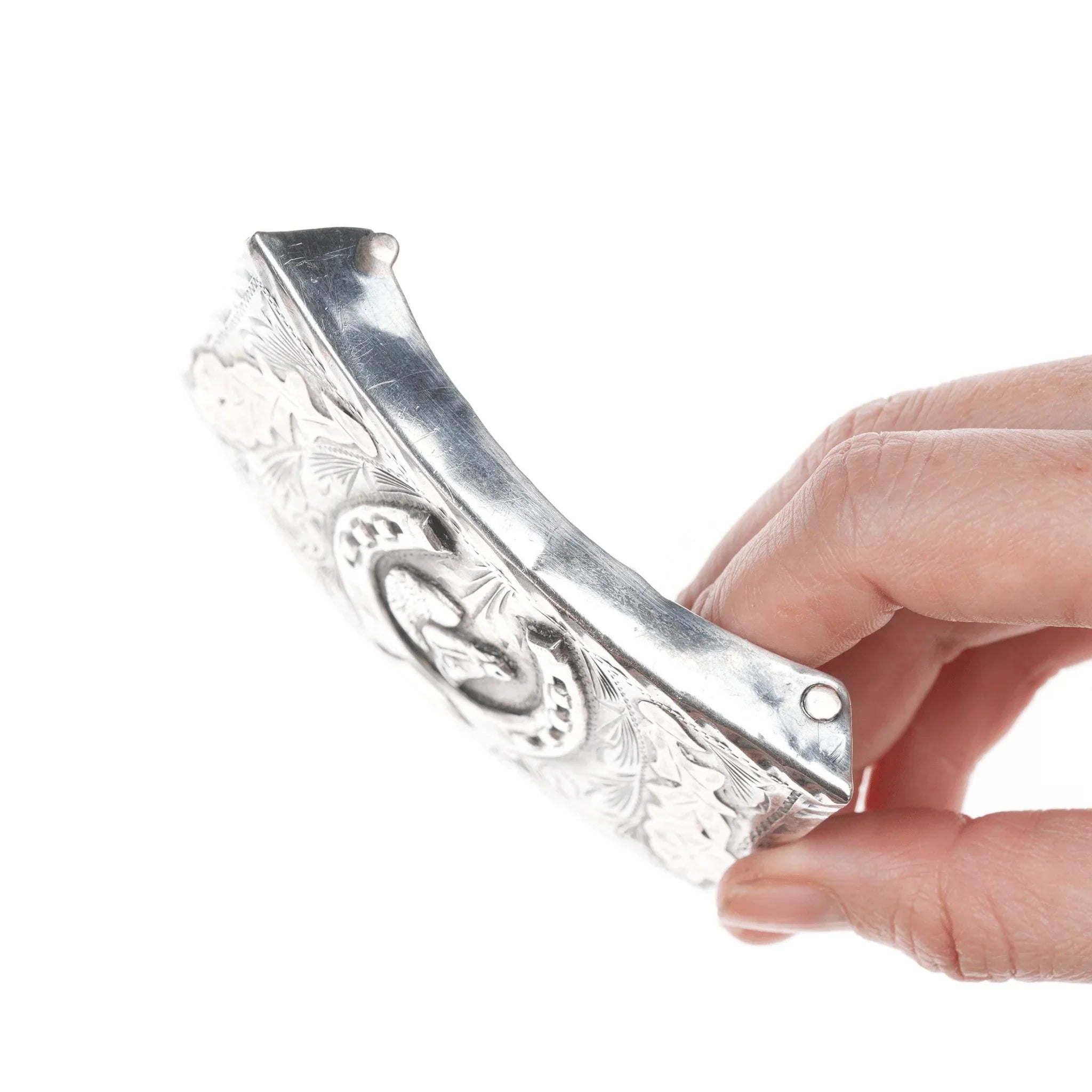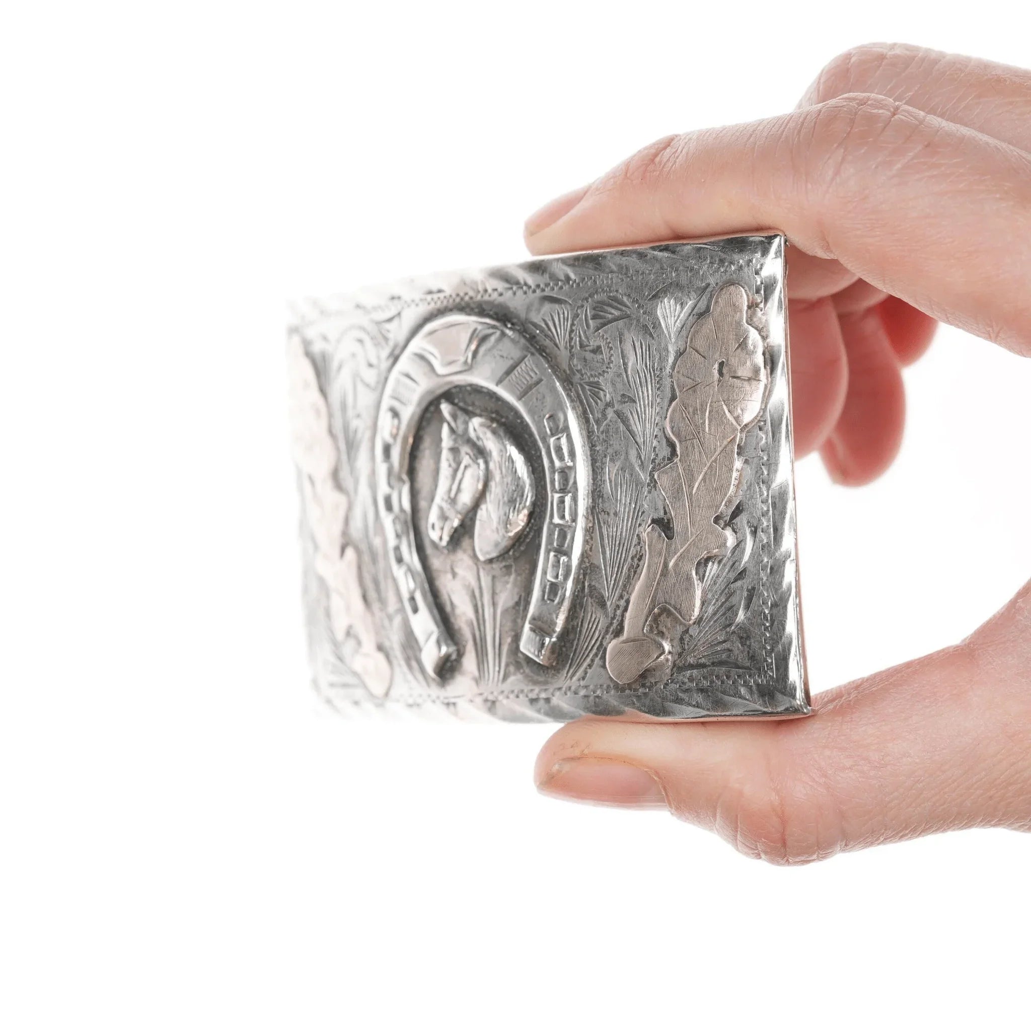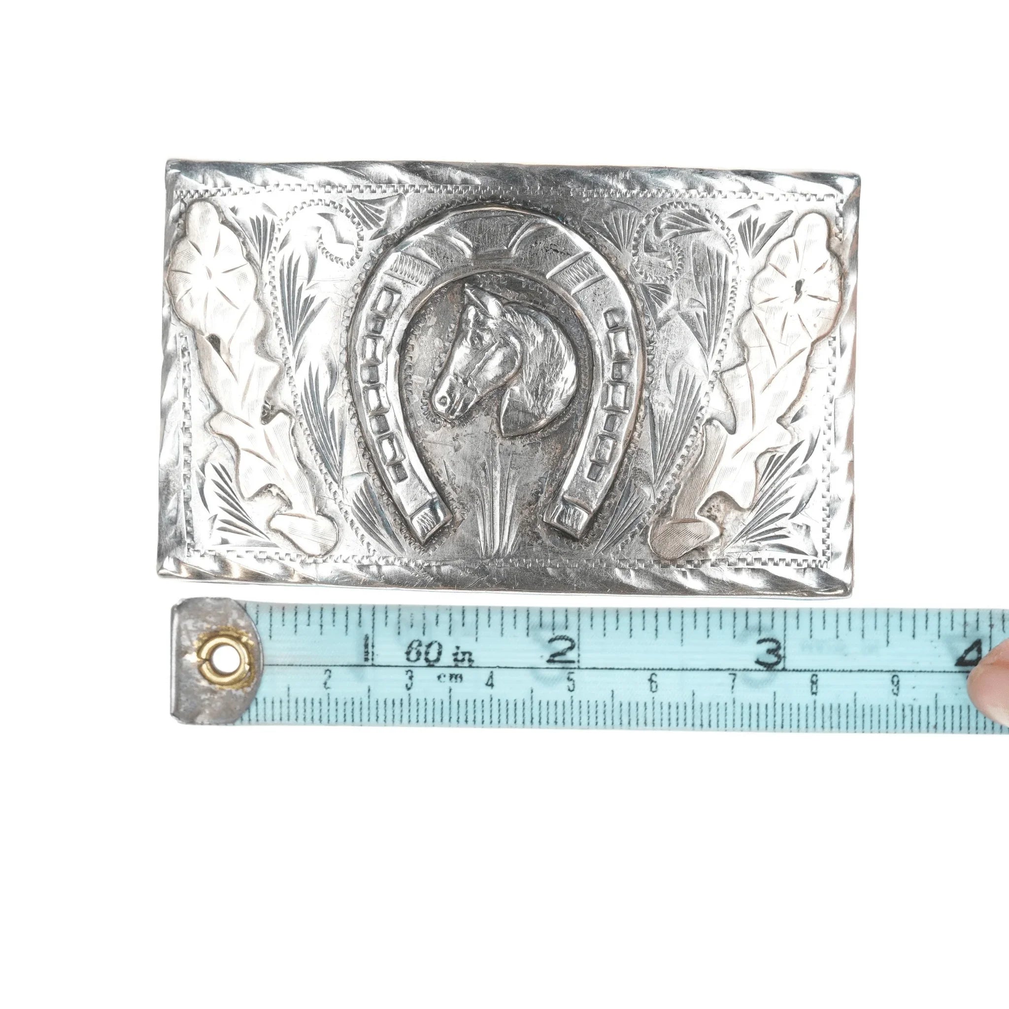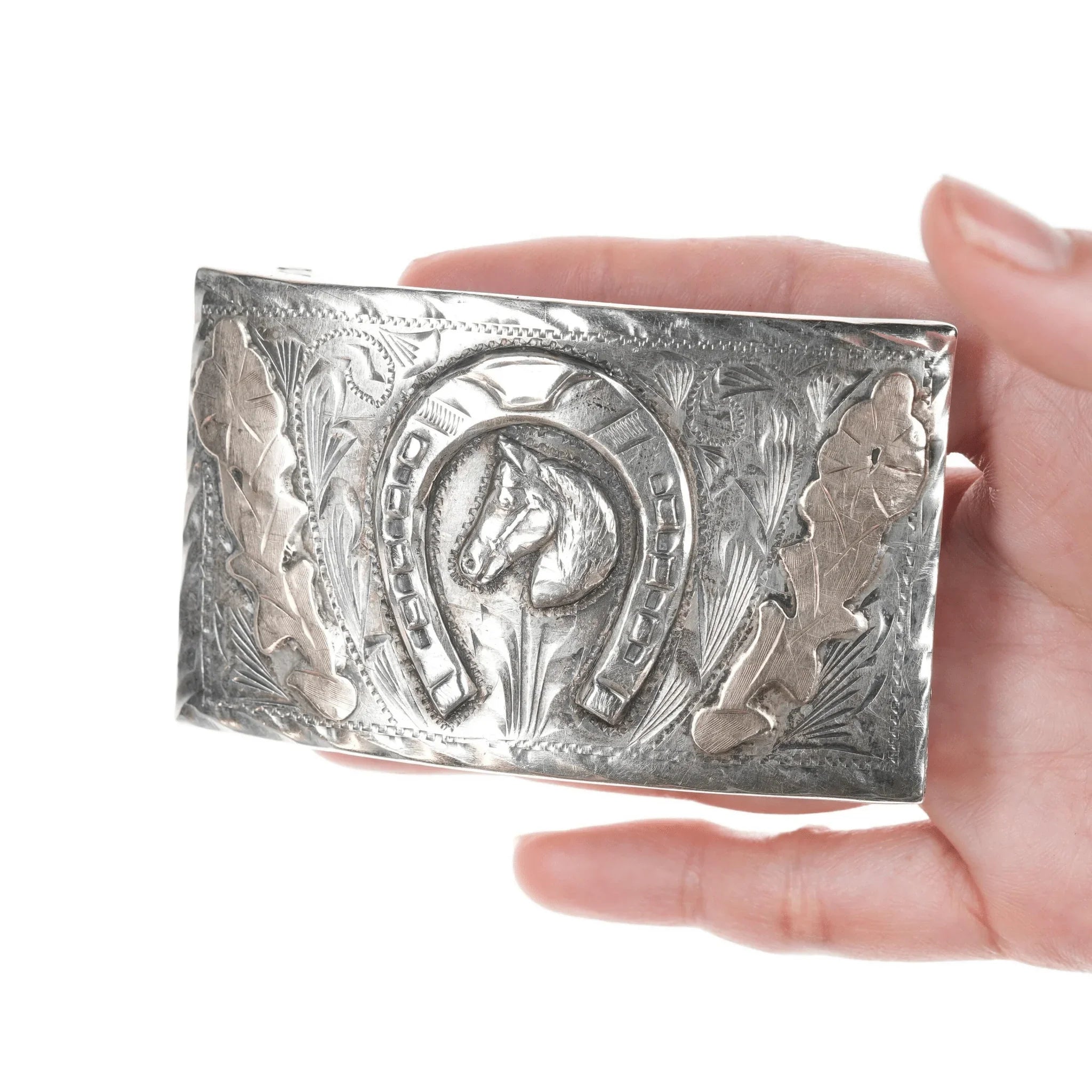 Vintage Sterling and Gold Mexican Hand engraved belt buckle. Fits up to a 1 7/8" belt buckle.<br><br> Marked or unmarked as shown in pics, weight and other measurements in pics. Sorry but my jewelry is stored in a secure location and cannot be accessed for more pictures,<br>videos, or measurements until sold. If you look at pictures/description your<br>question should be answered. Thank you so much for your time and consideration!<br><br>All precious metals are tested and guaranteed. A Native American jewelry piece referred to as "silver" or "ingot" is guaranteed to be at least 90% silver. Bracelets are photographed on a 6" women's wrist.