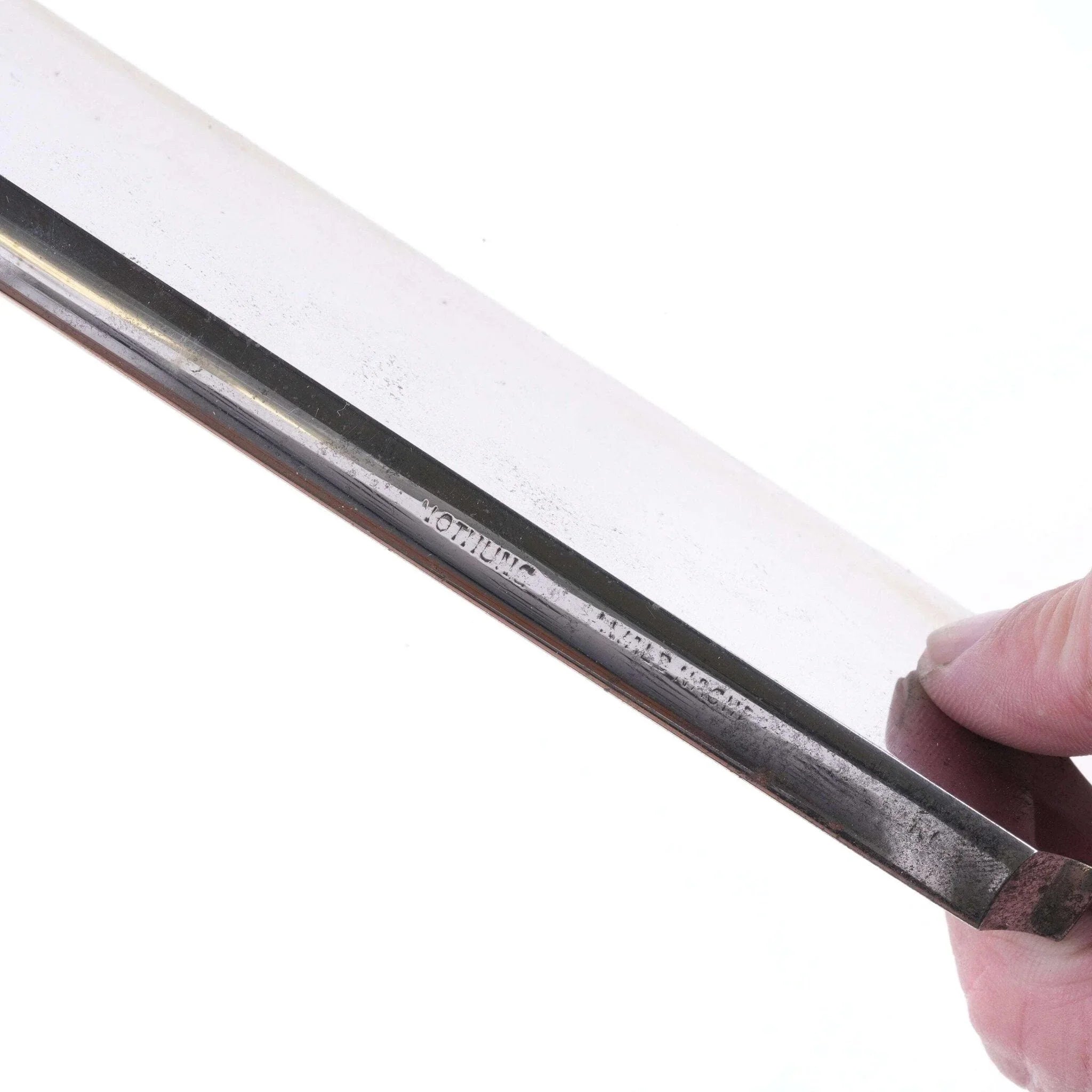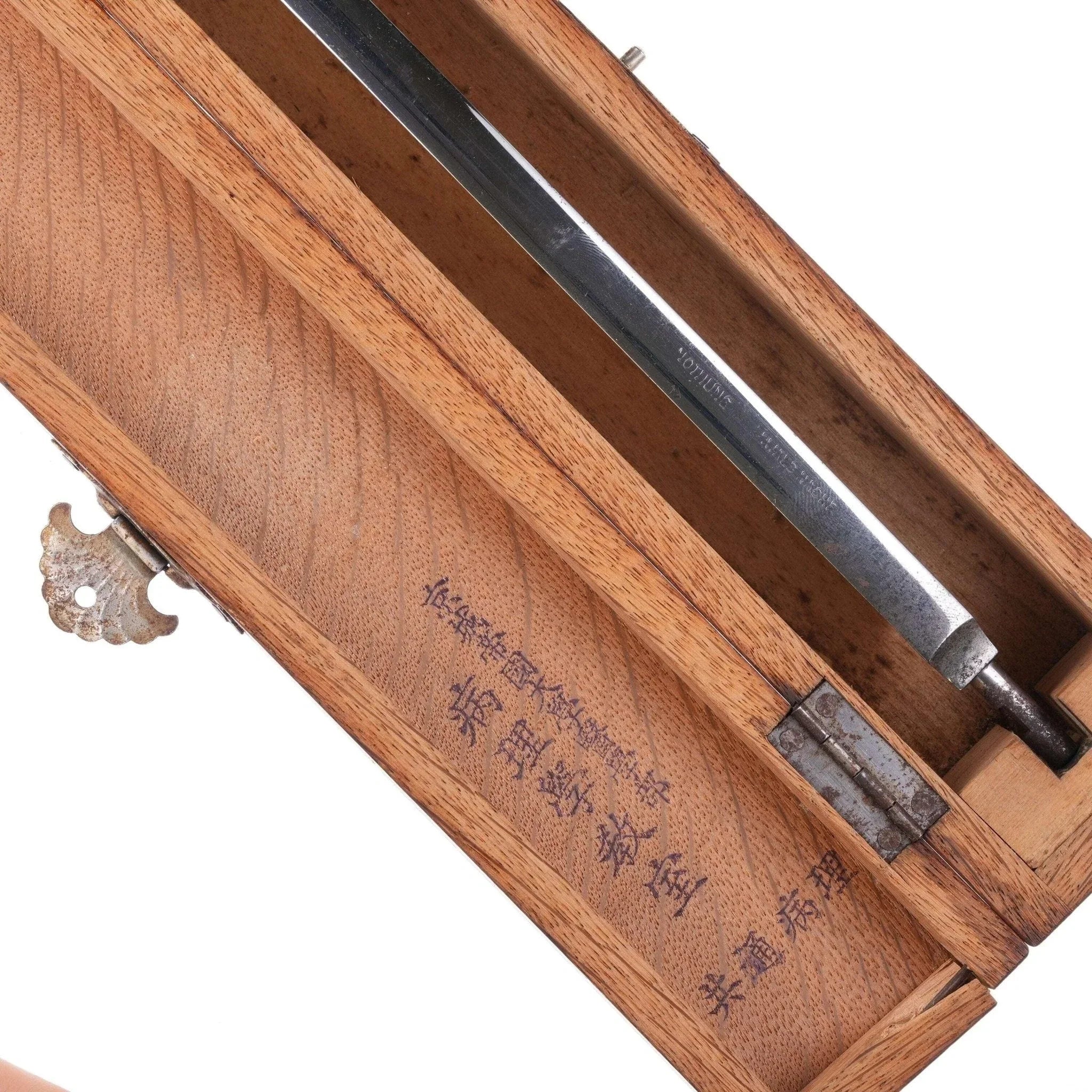 二战时代日本病理学手术刀片。刀片顶部刻有Nothung...Nacht,案子上刻有庆城帝国大学医学院病理学系普通病理学。所以刀片可能是德国制造的。刀片上有一些小缺口,否则很锋利,不确定它有什么类型的手柄,但它不存在。盒子长 12 1/8 英寸,有些磨损并丢失了盒子中的细木工。
