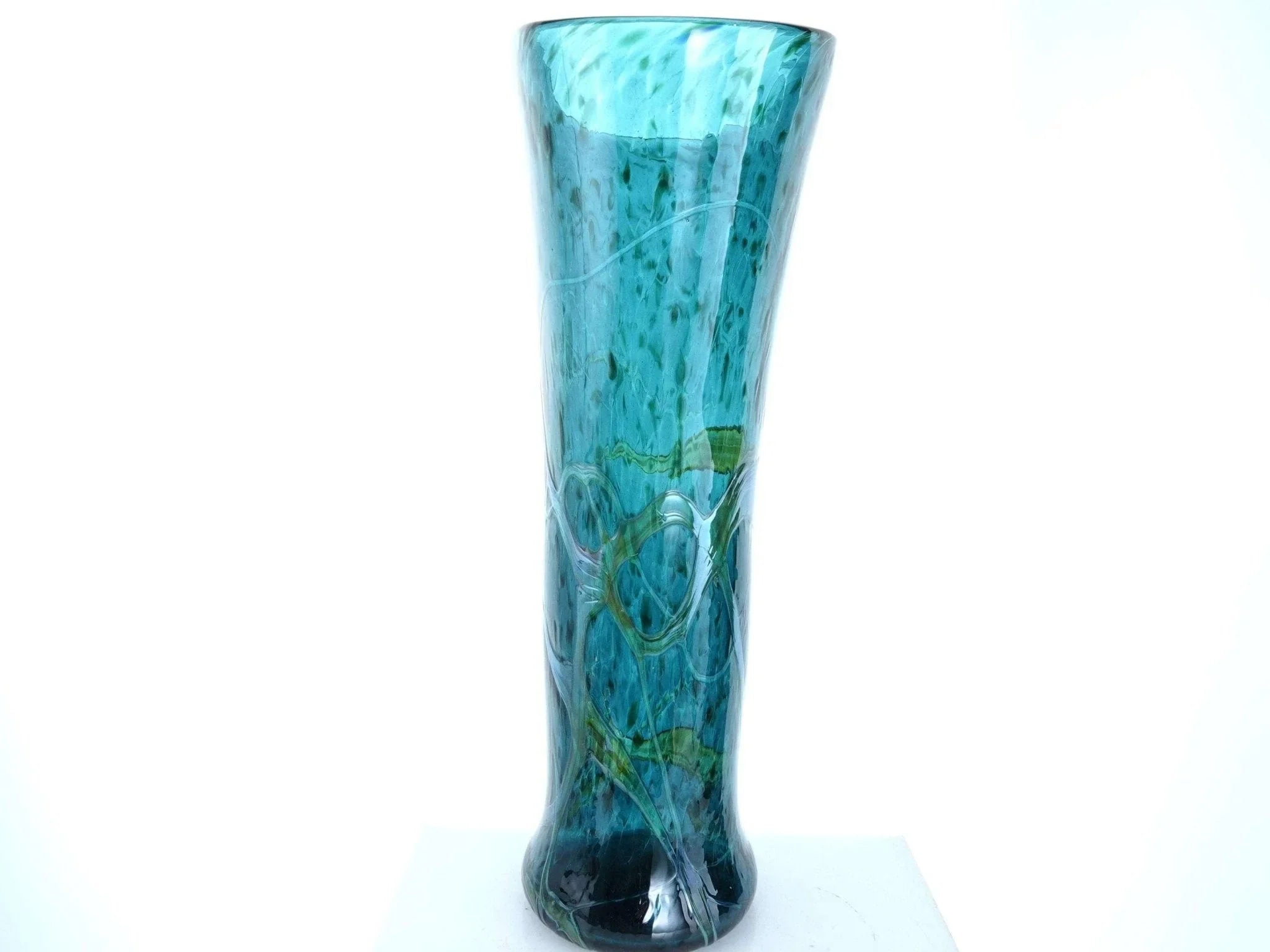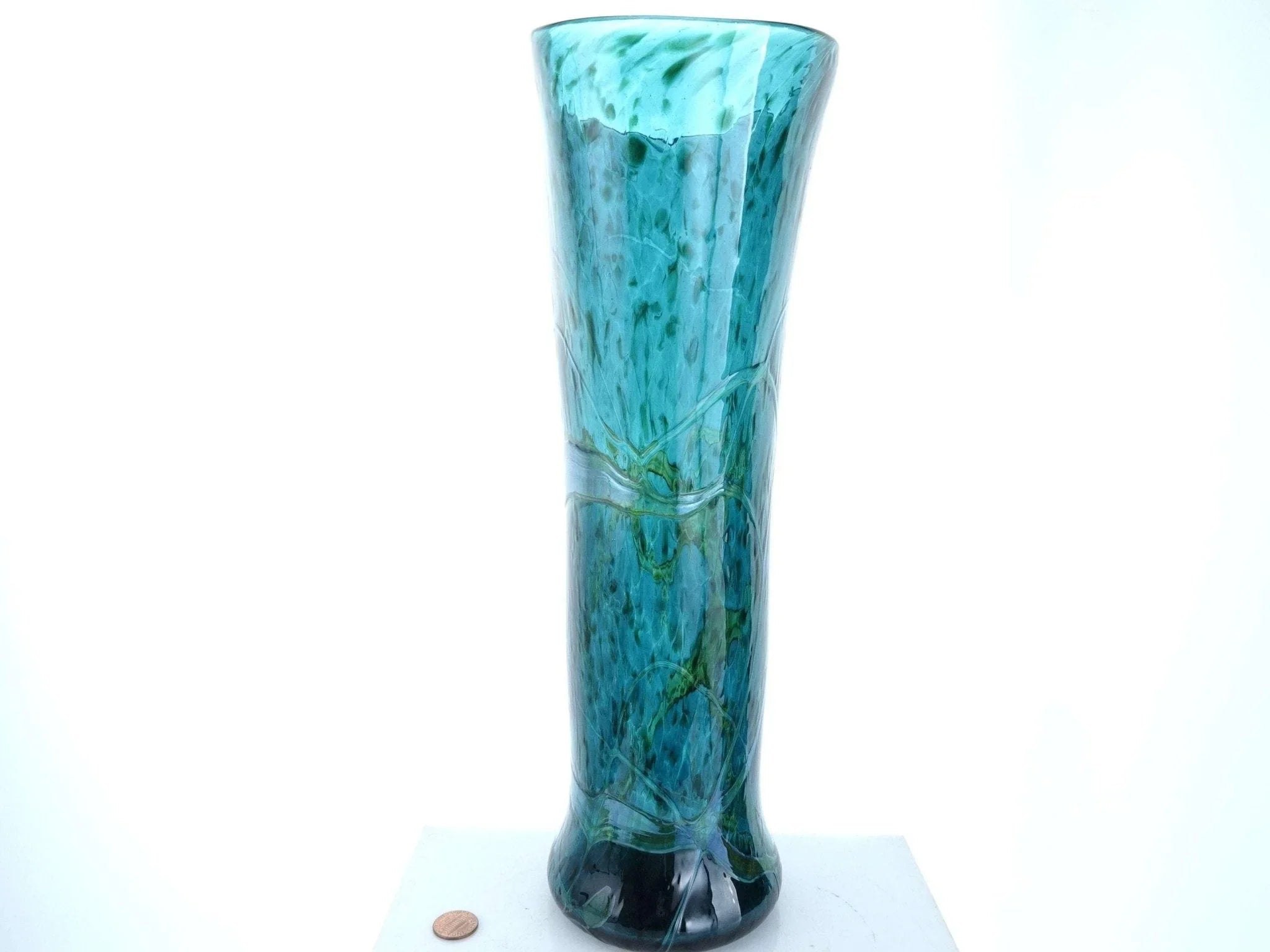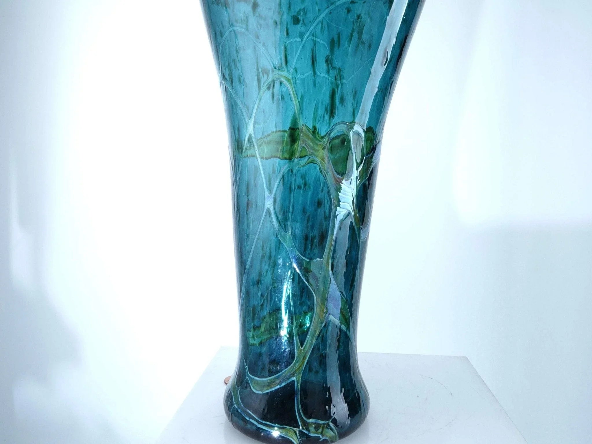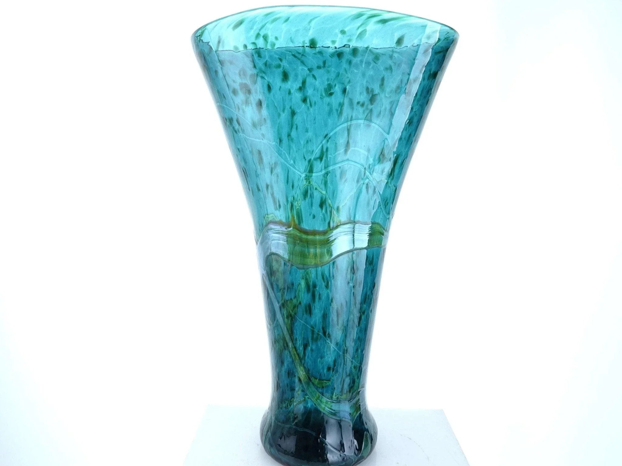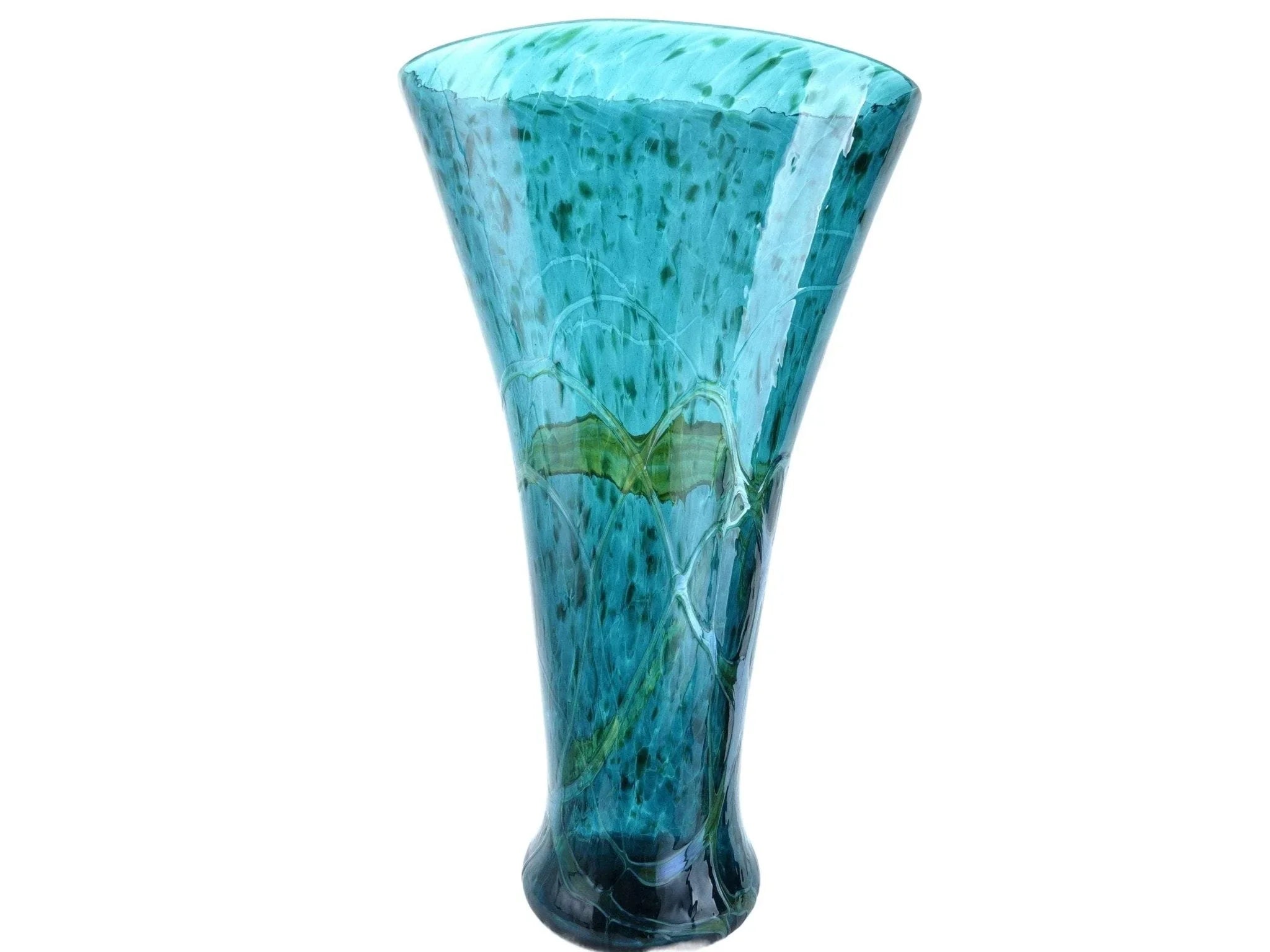 14" Huge Wimberly Glassworks art glass fan vase. 8" wide at rim with no cracks, chips, restorations, or wear. Signed WGW 2007 on base. While not very old, this would retail for about $400-$500 new from Wimberly Glassworks and it's in new condition, handmade. TW221